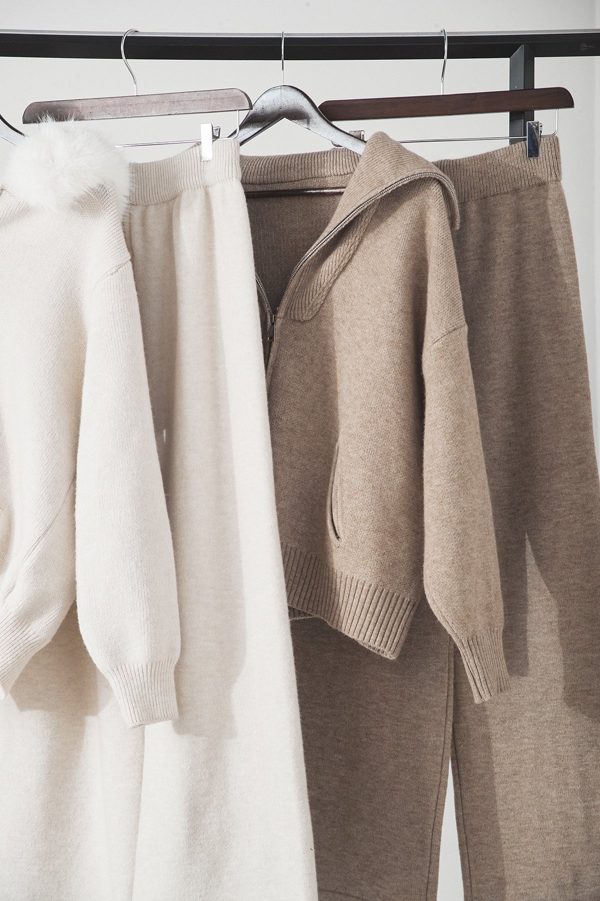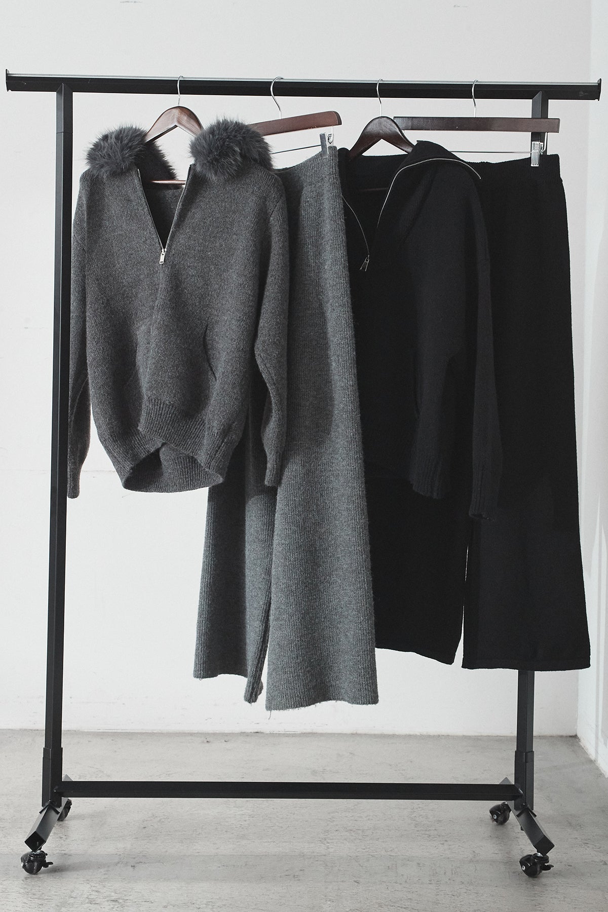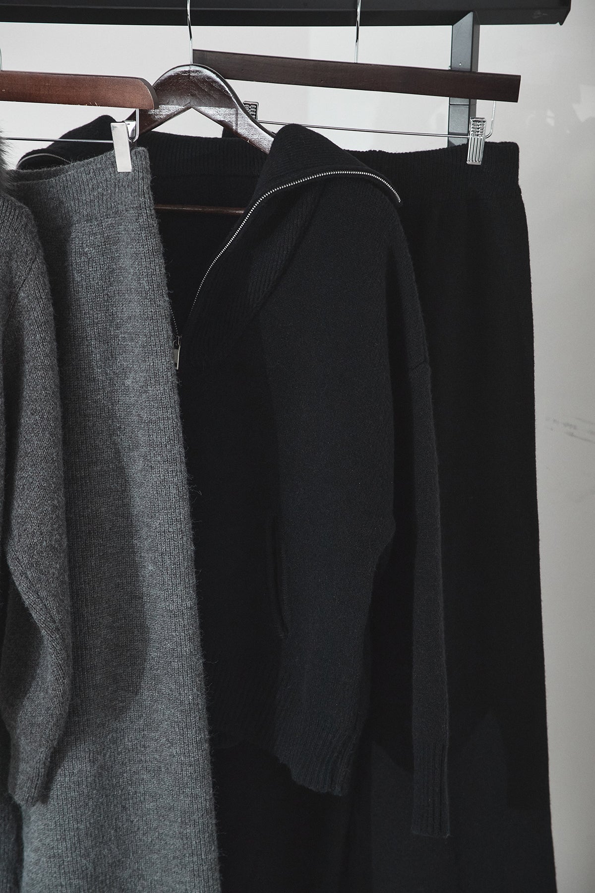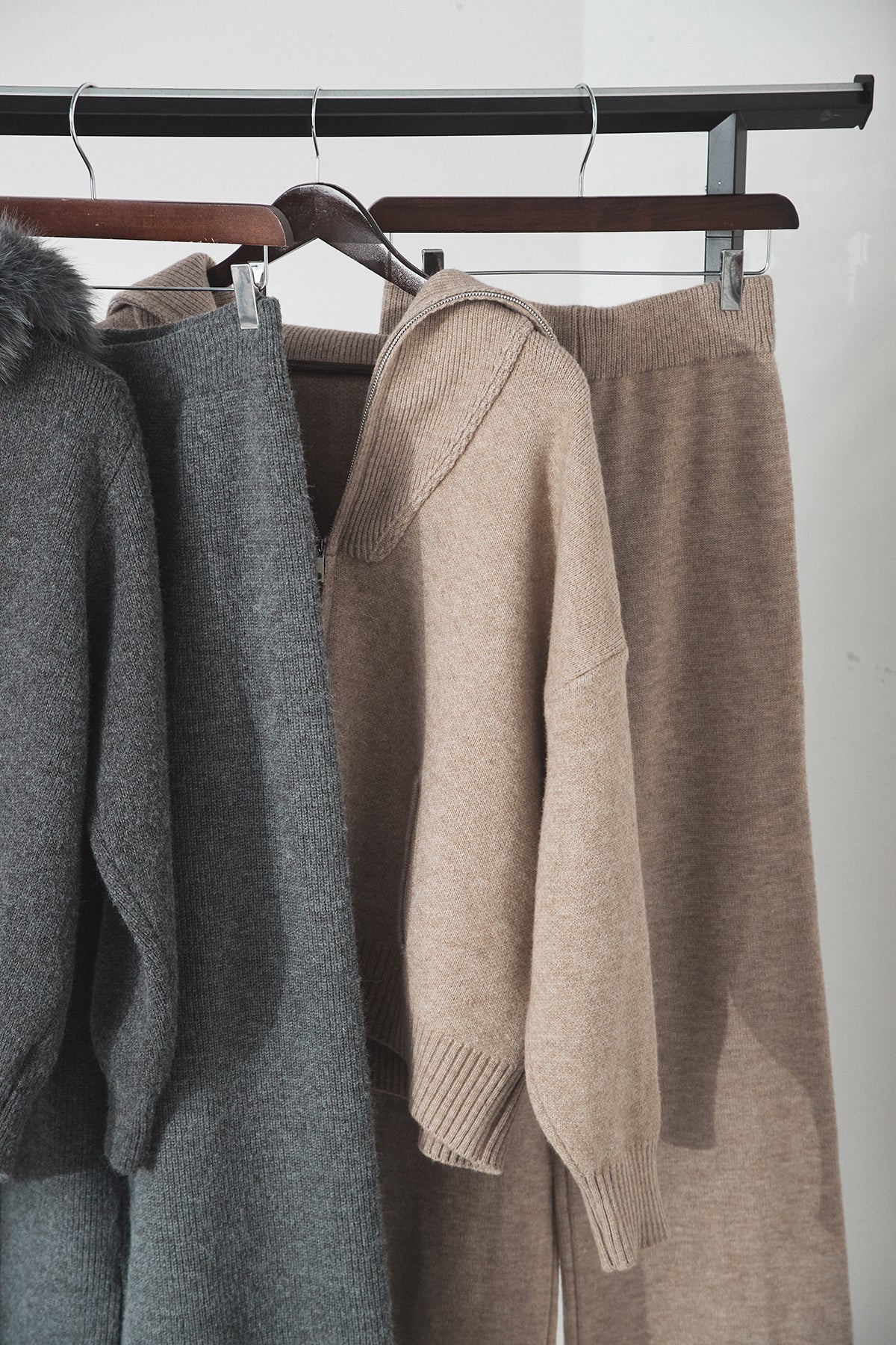 大きめのカラーが印象的な、ダブルジップ仕様のニットセットアップ。トップスはゆったりとしたシルエットで抜け感があり、ジップの開閉で表情の変化を楽しめます。パンツはすとんと落ちるラインで全体をすっきりとまとめ、リラックス感がありながらも上品な印象に。セットで着るだけでバランスよく決まり、単品使いでも幅広く活躍するアイテムです。