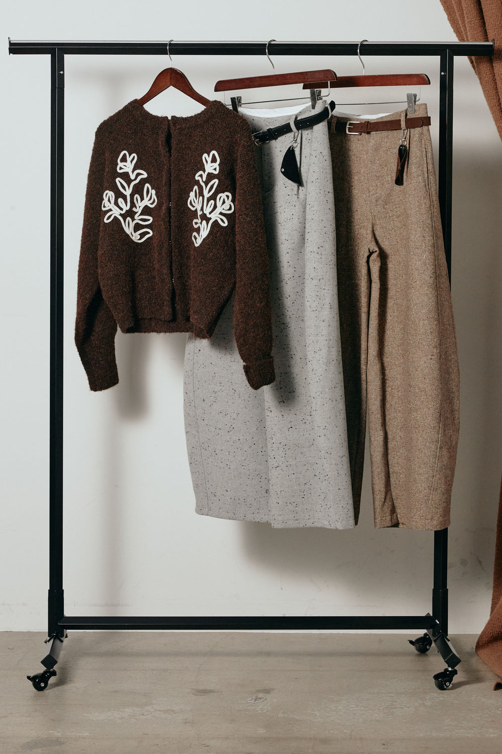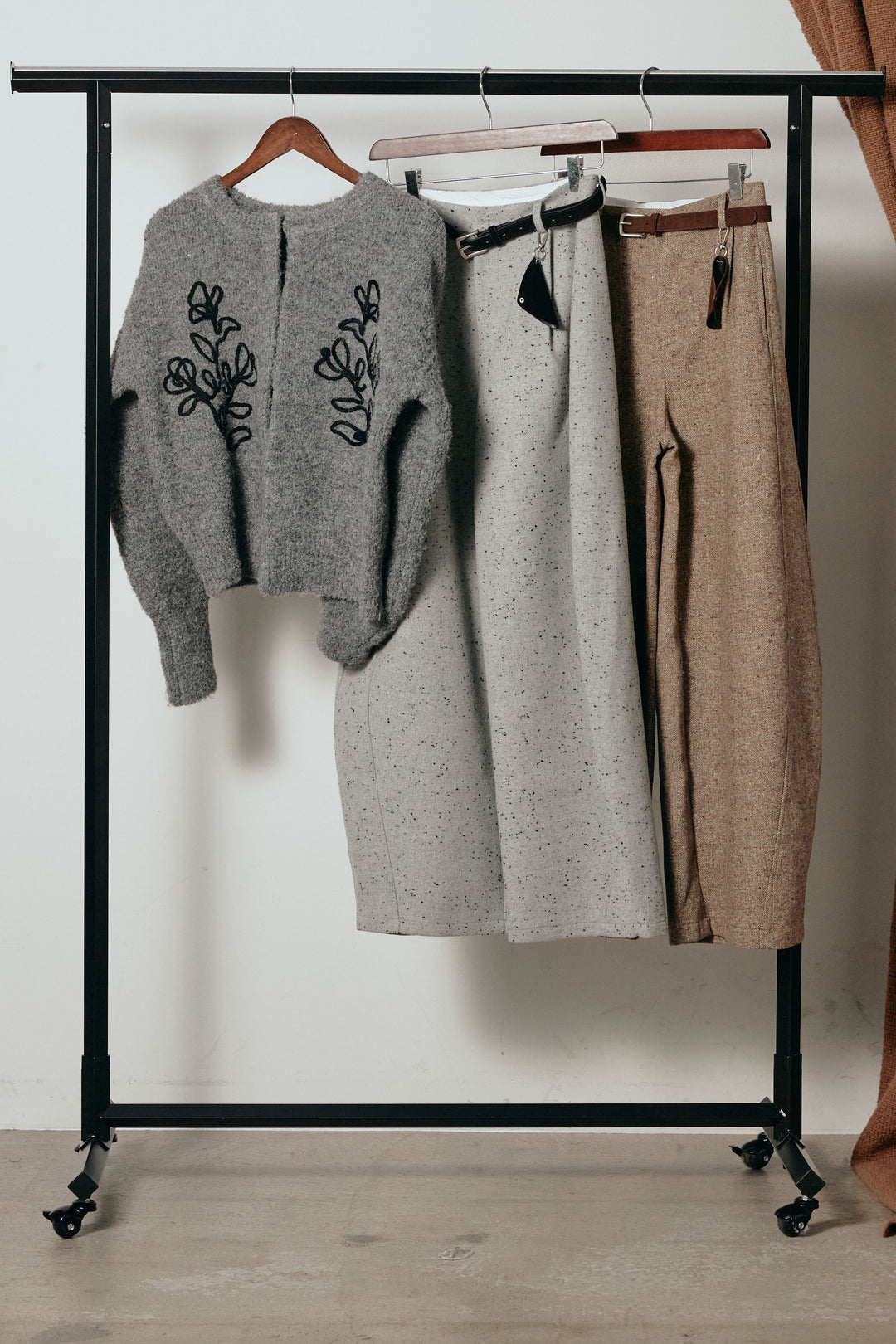 【着回しセット】[SET]テープ刺繍ニットカーディガン+ベルト付きネップツイードカーブパンツ+ベルト付きネップツイードカーブパンツ(3set)