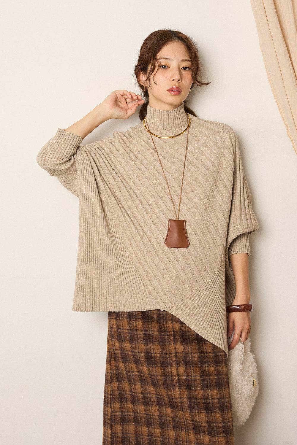 アシメデザインリブポンチョニットトップス