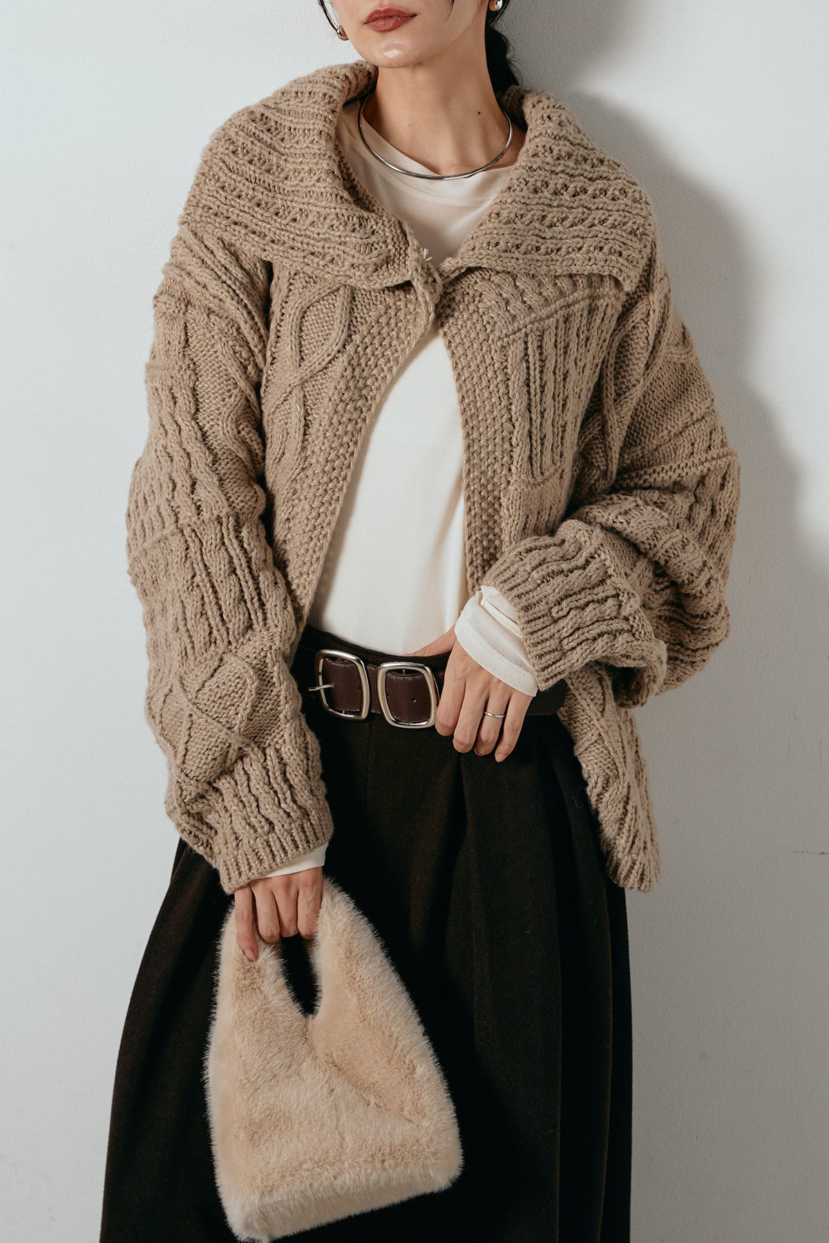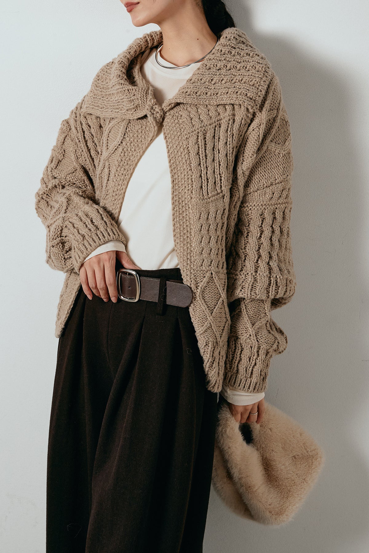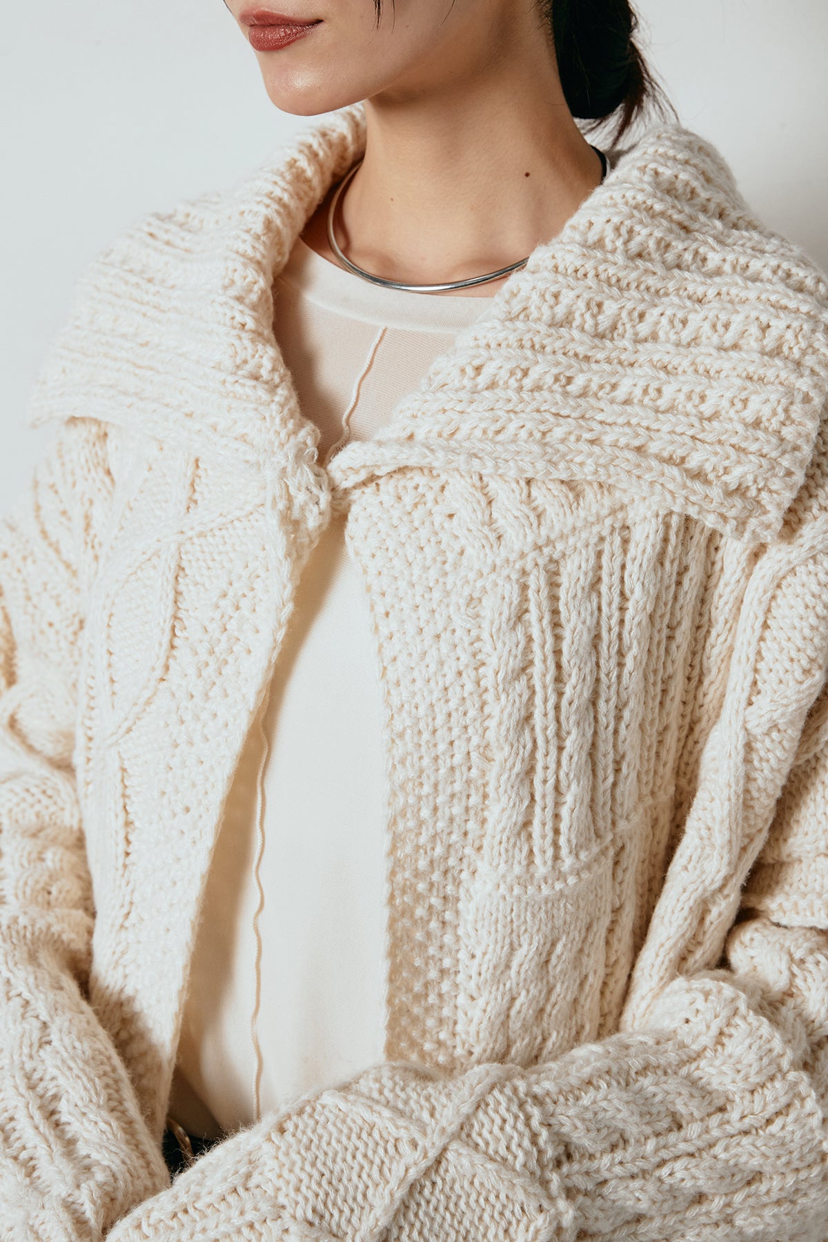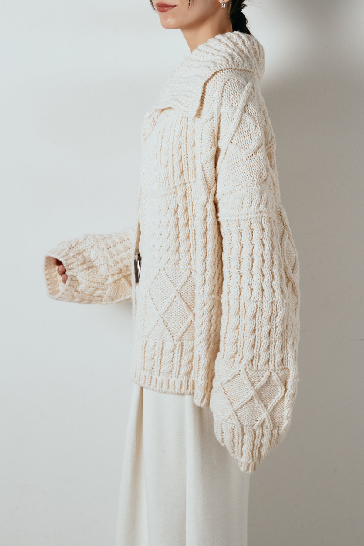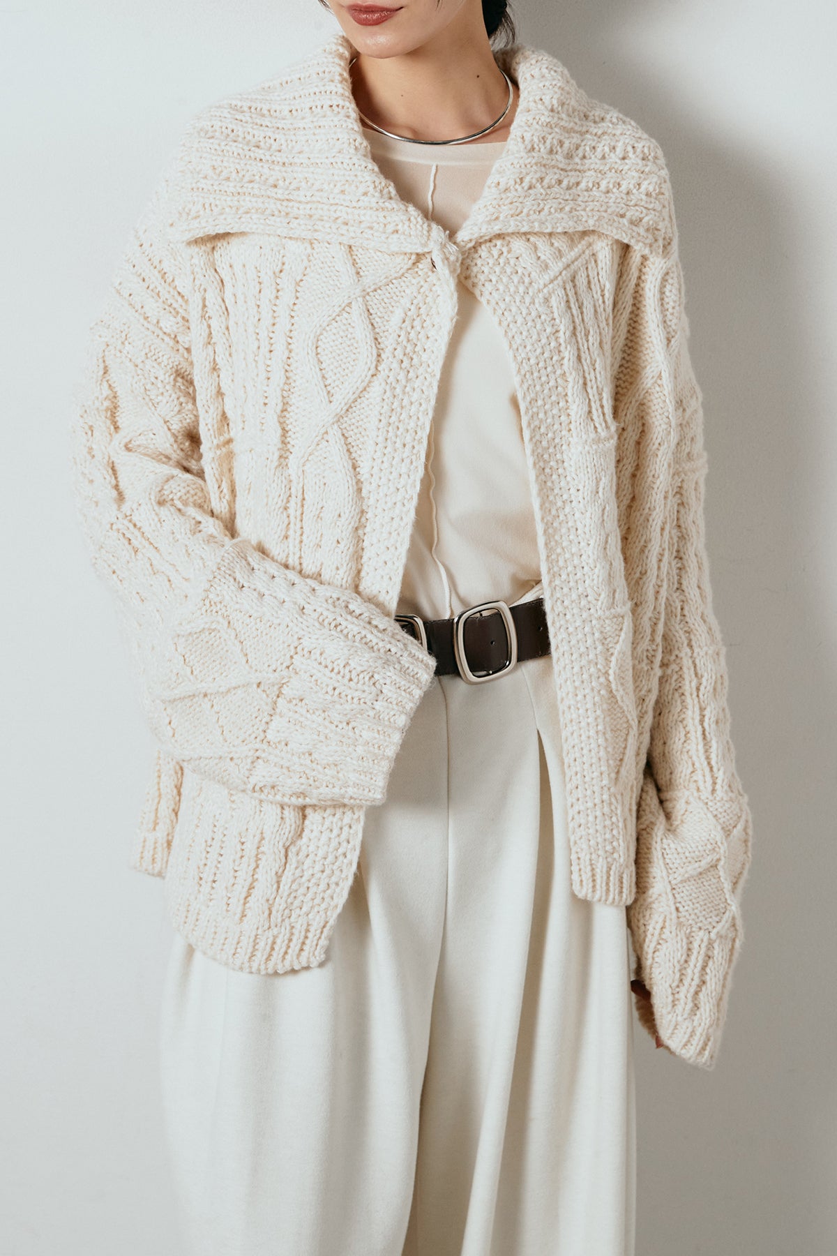 立体的なケーブル編みが存在感を放つ、ビッグカラーが印象的なニットトップス。ざっくりとした畦編みと柔らかなボリュームスリーブで、シンプルながら華やかなムードを演出します。前を開けて羽織りとしても楽しめる万能デザインで、季節の移り変わりにも重宝。幅広いボトムと好相性で、ラフに羽織るだけでこなれたスタイルに仕上がります。