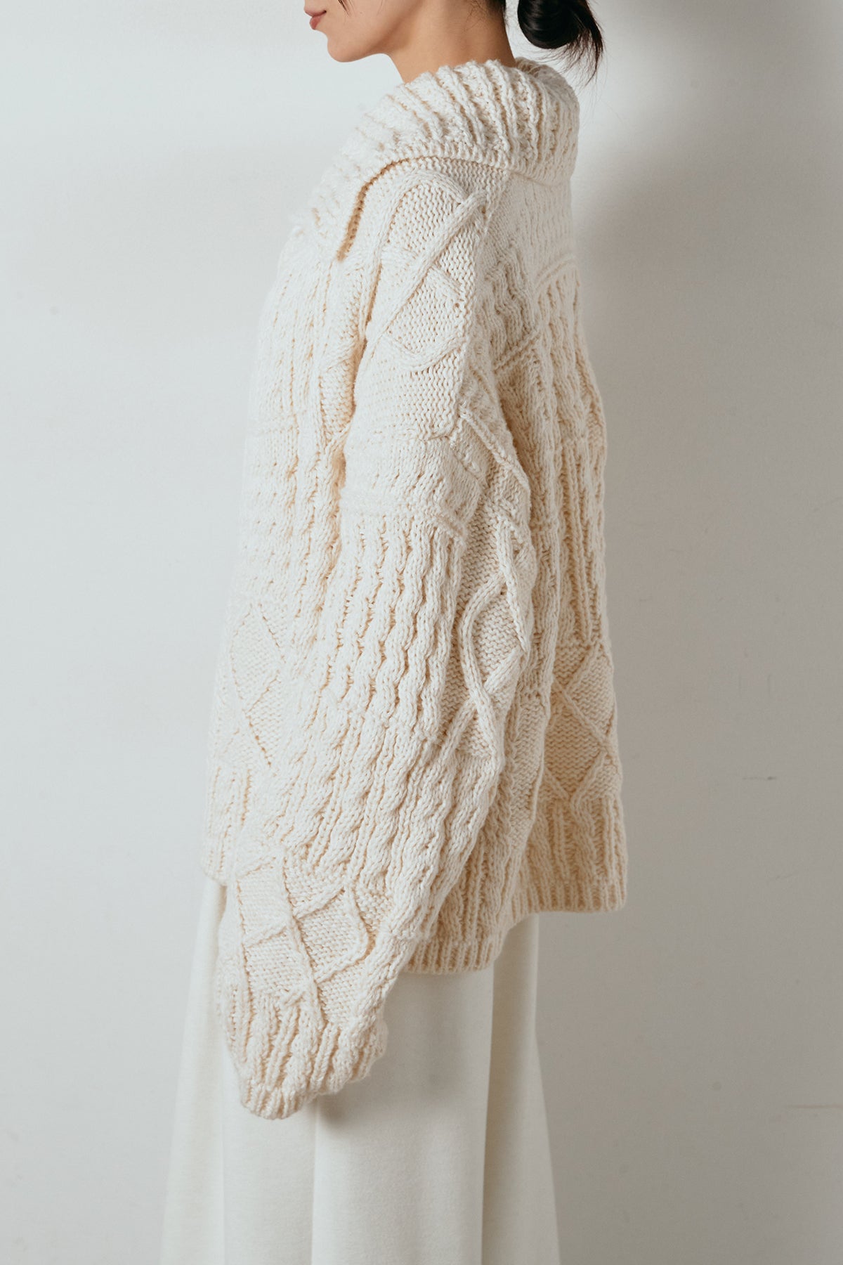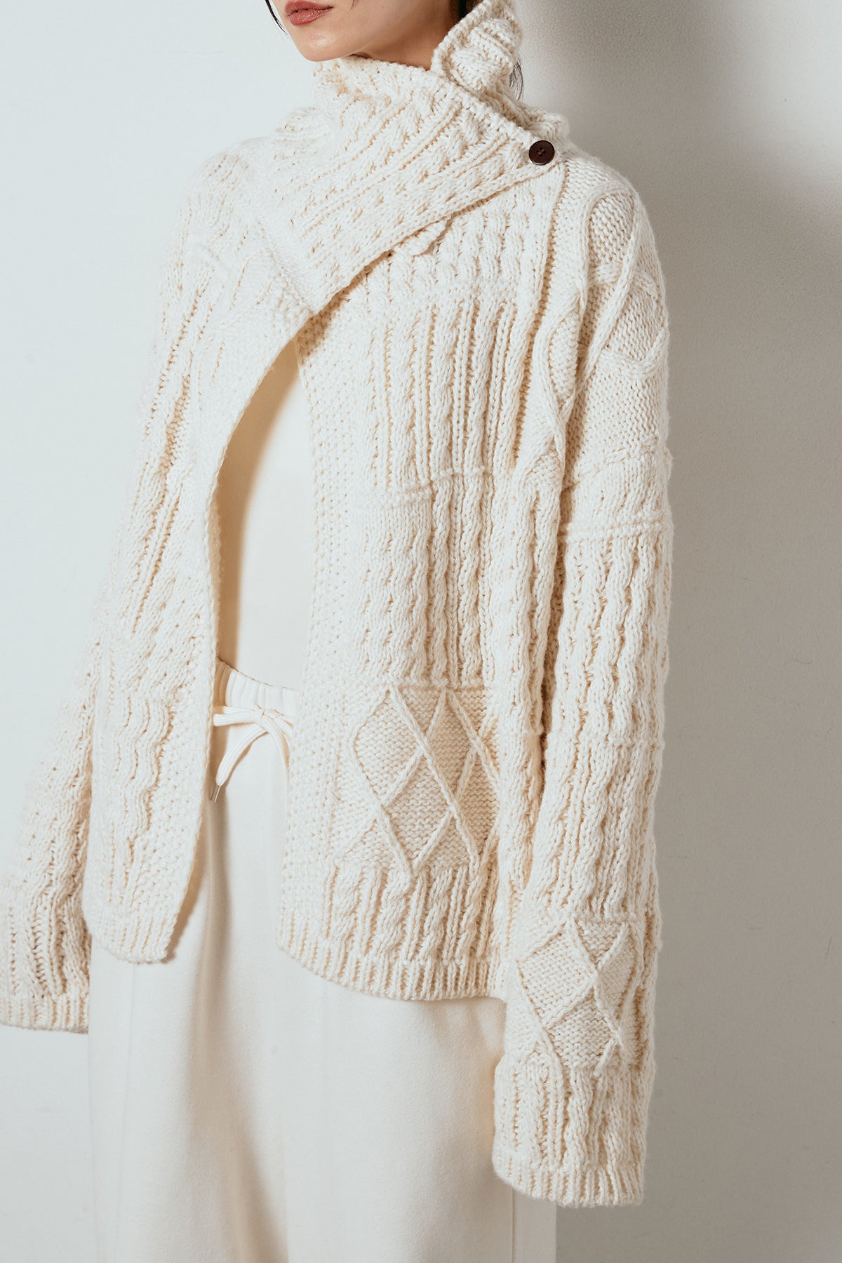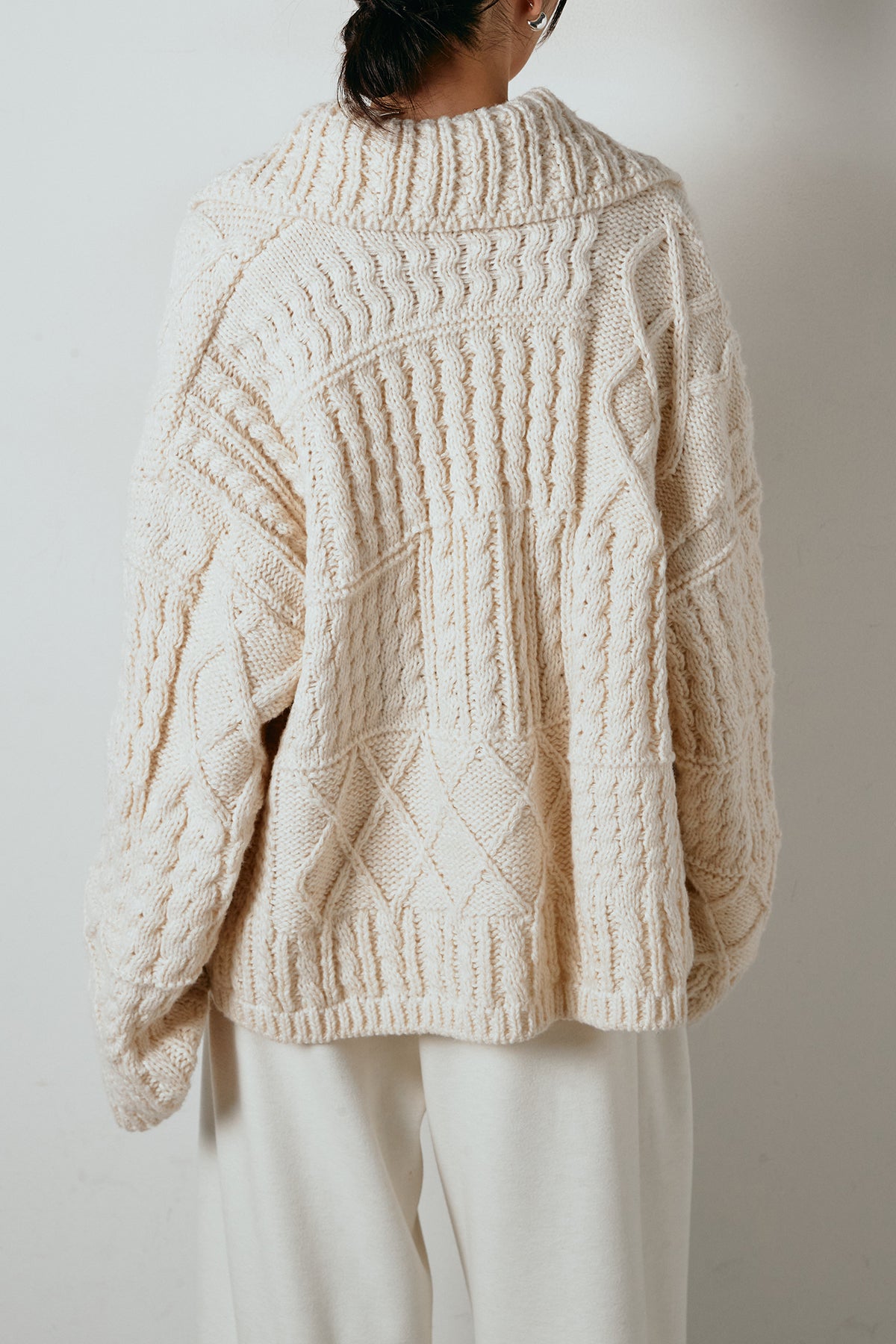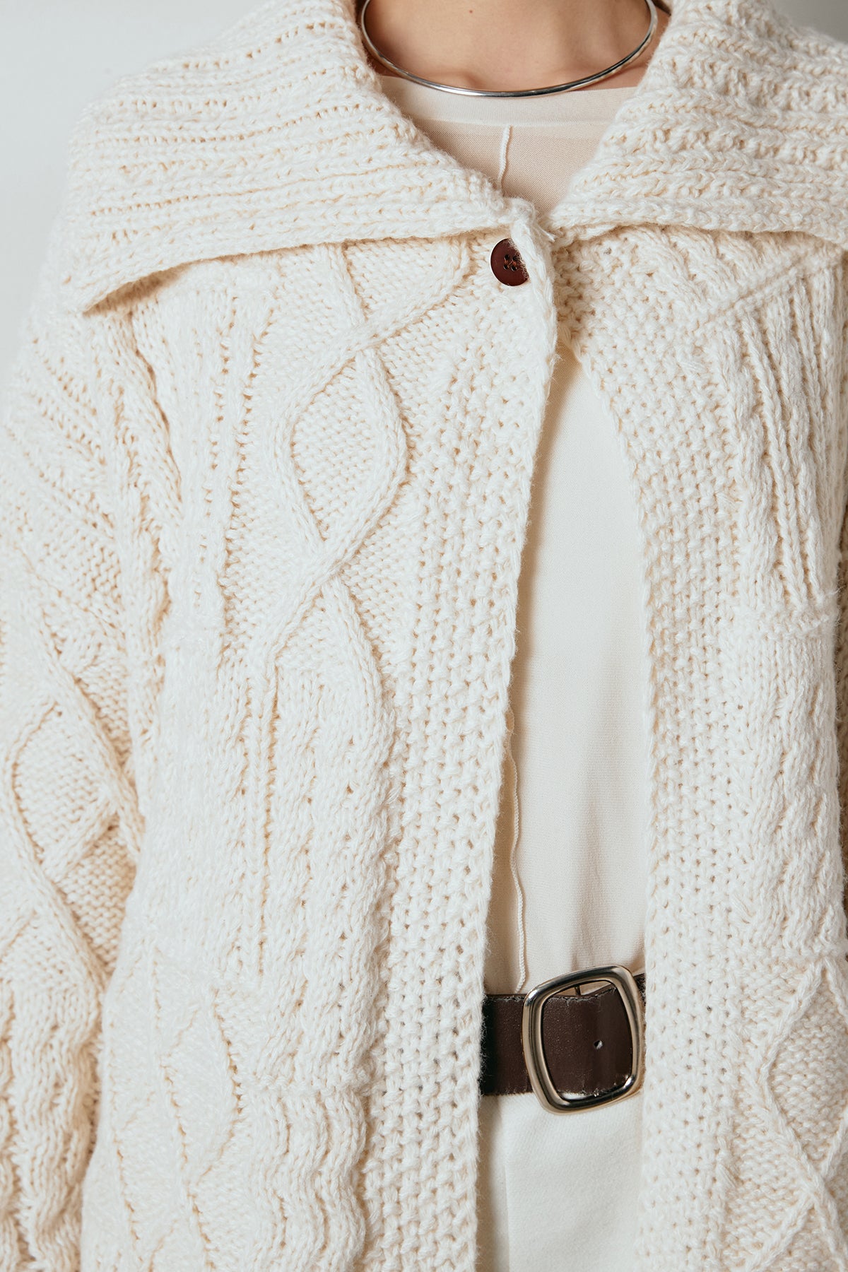 立体的なケーブル編みが存在感を放つ、ビッグカラーが印象的なニットトップス。ざっくりとした畦編みと柔らかなボリュームスリーブで、シンプルながら華やかなムードを演出します。前を開けて羽織りとしても楽しめる万能デザインで、季節の移り変わりにも重宝。幅広いボトムと好相性で、ラフに羽織るだけでこなれたスタイルに仕上がります。