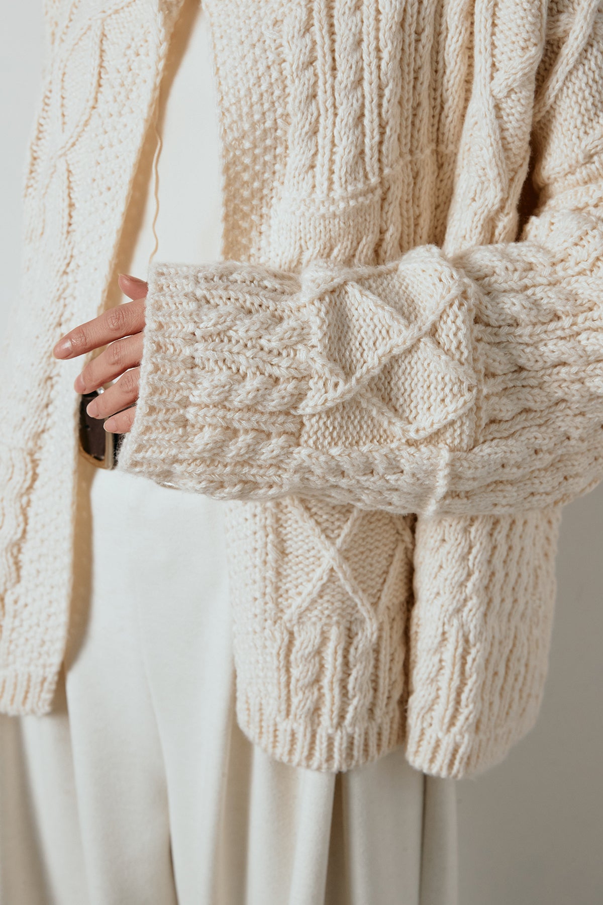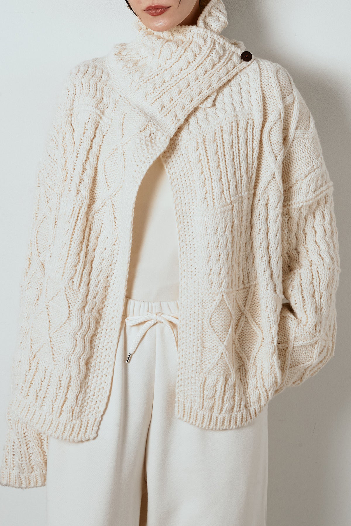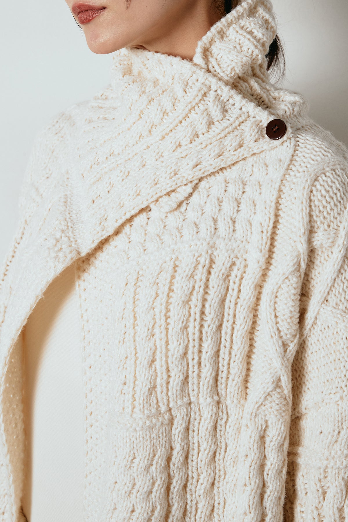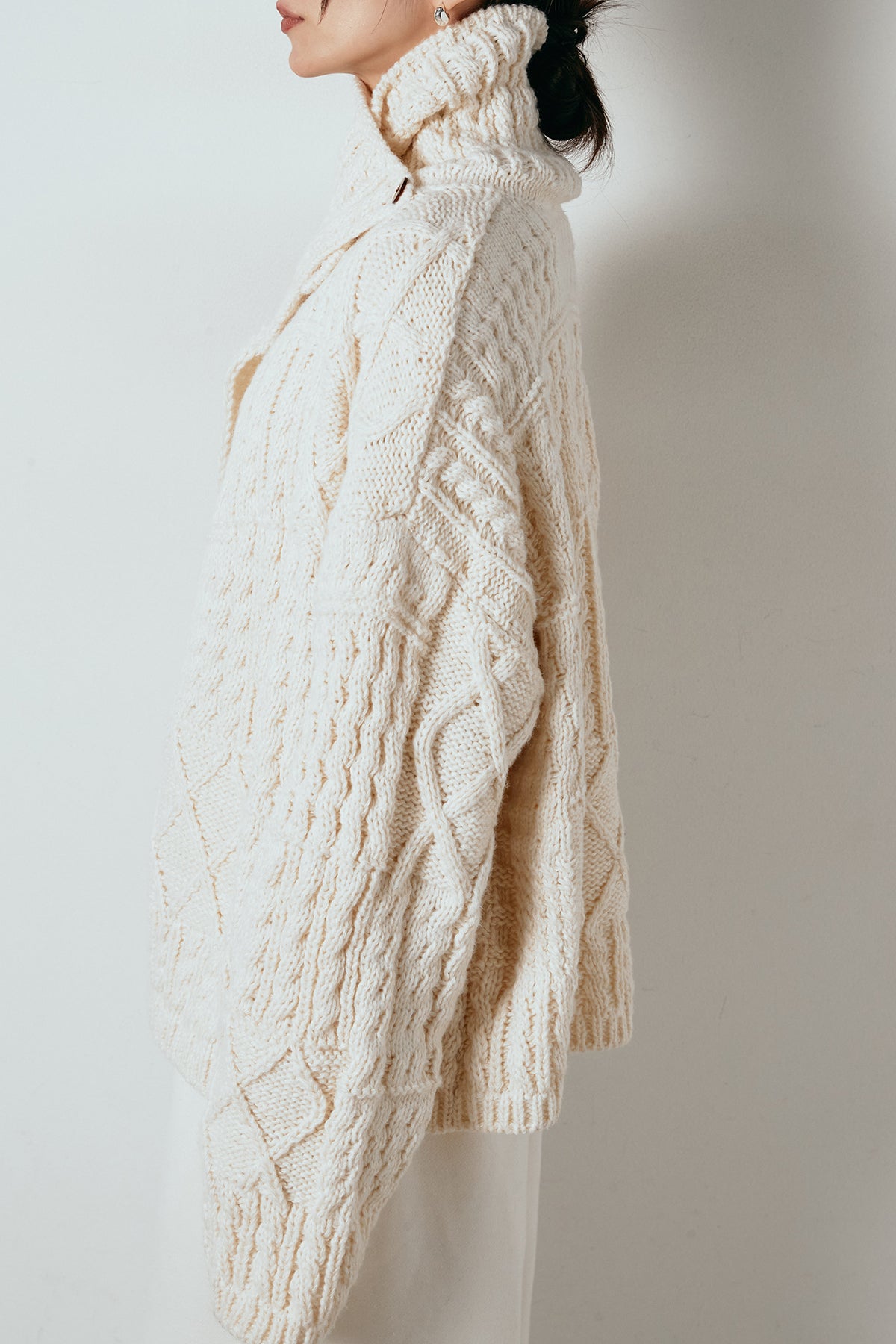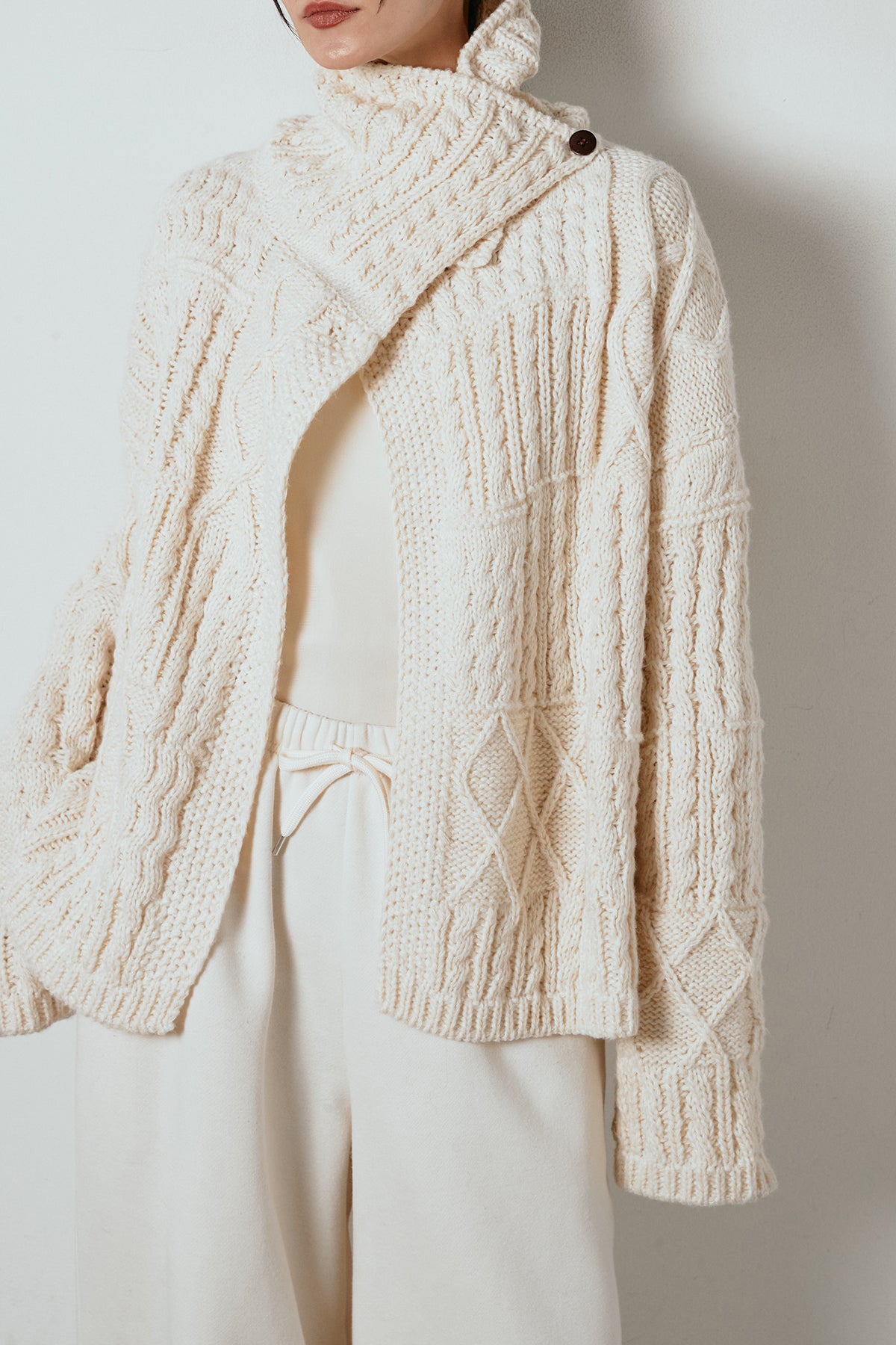 立体的なケーブル編みが存在感を放つ、ビッグカラーが印象的なニットトップス。ざっくりとした畦編みと柔らかなボリュームスリーブで、シンプルながら華やかなムードを演出します。前を開けて羽織りとしても楽しめる万能デザインで、季節の移り変わりにも重宝。幅広いボトムと好相性で、ラフに羽織るだけでこなれたスタイルに仕上がります。