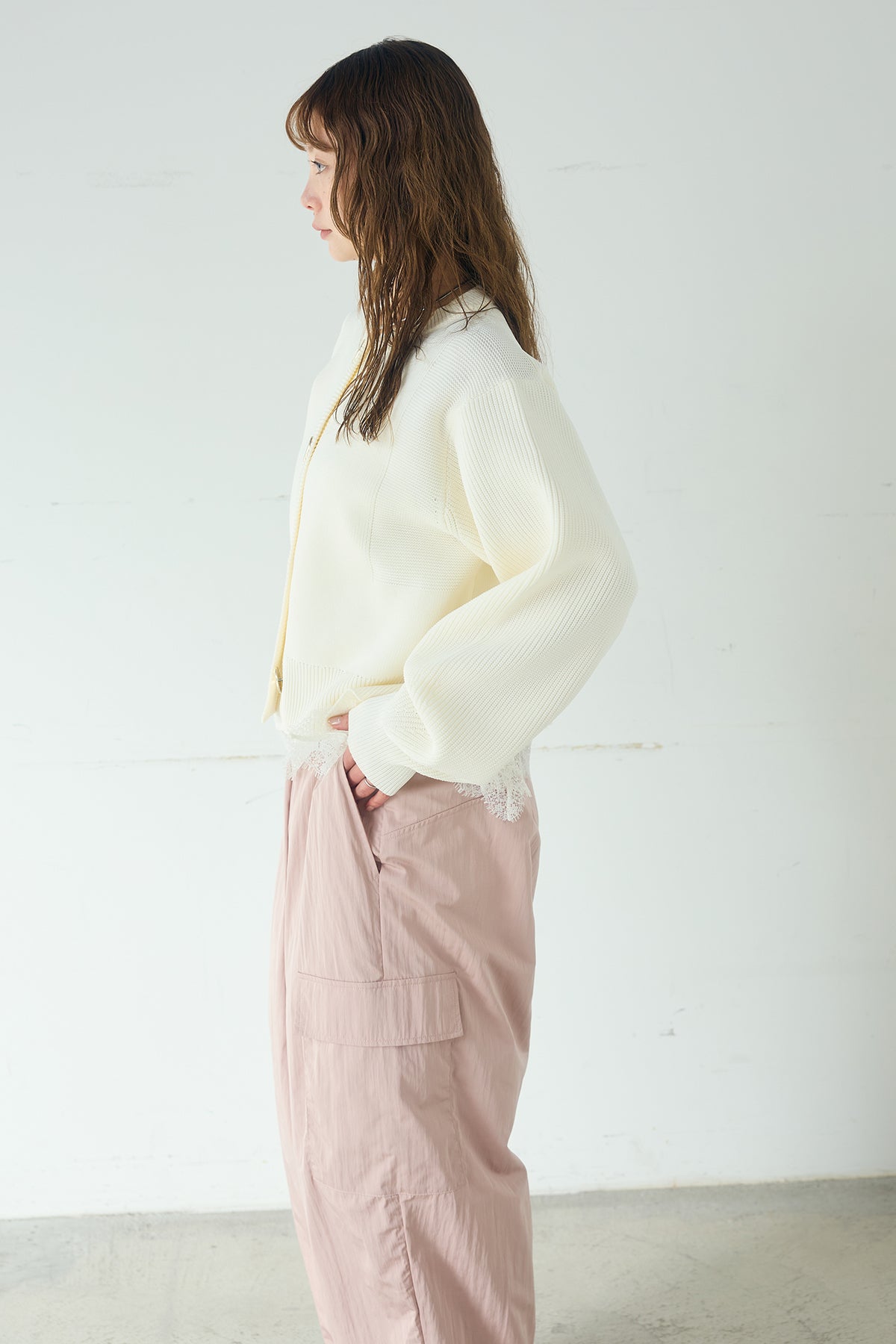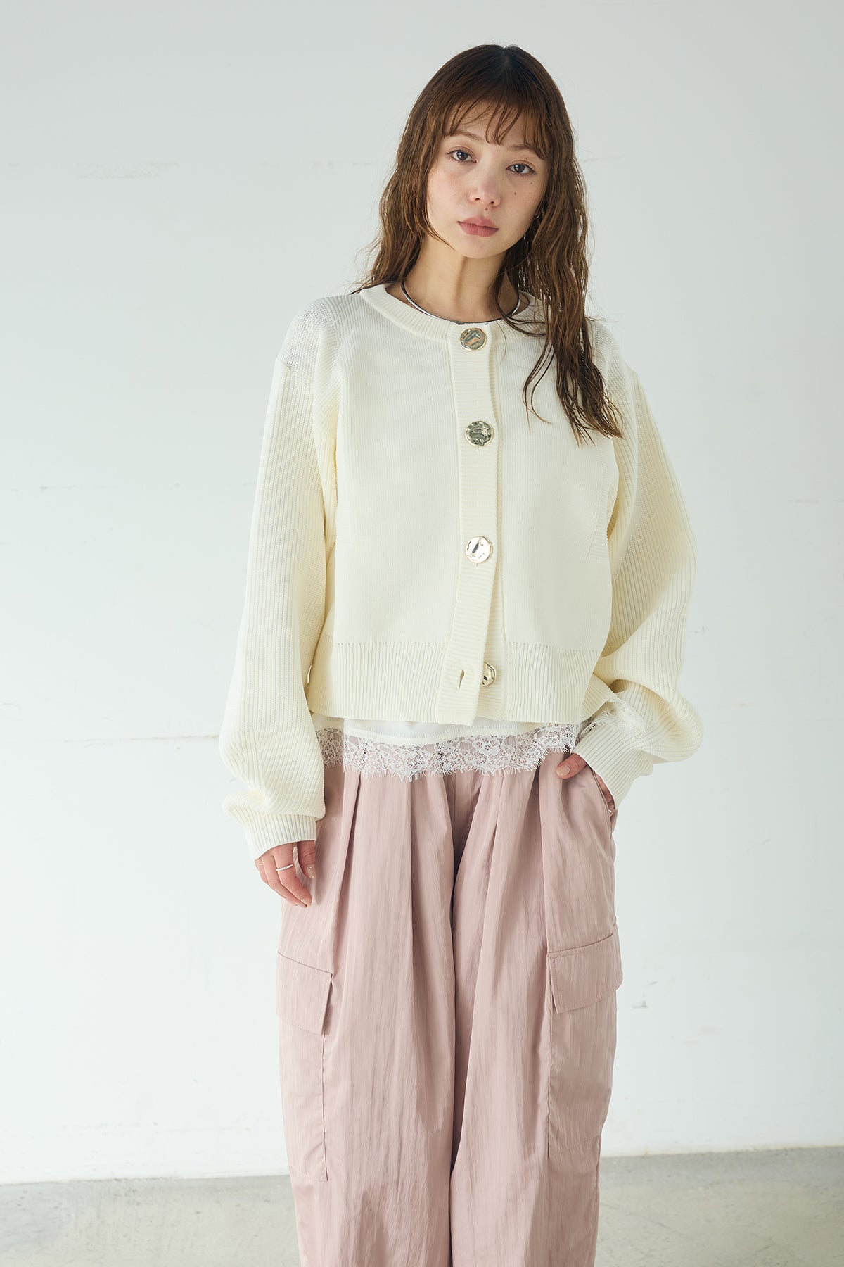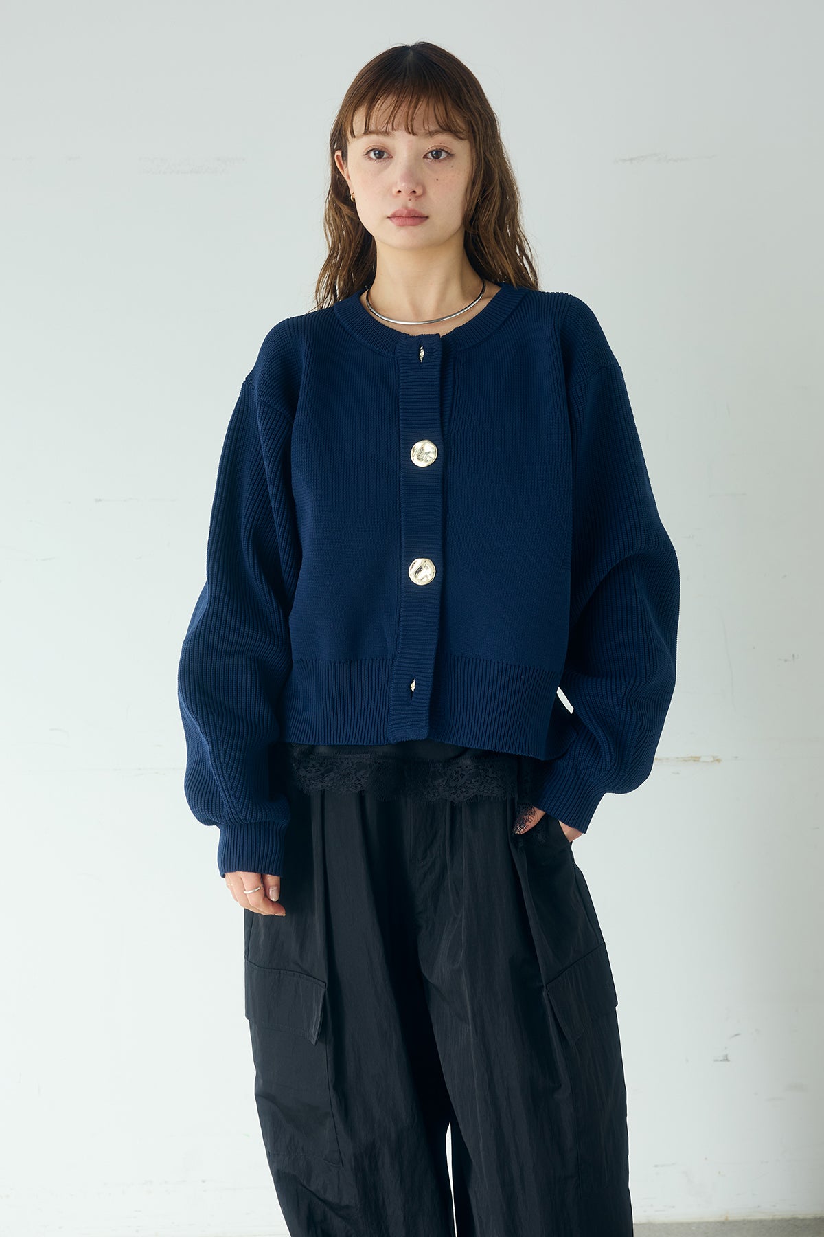 スポンディッシュBIGボタンクルーネックカーディガン ふっくらとしたスポンディッシュな編み地が印象的なクルーネックカーディガン。 存在感のあるビッグボタンが程よいアクセントになり、シンプルながらも表情のある一枚に仕上がっています。ややコンパクトな丈感とゆとりのある袖バランスが、スタイリングに抜け感をプラス。羽織としてはもちろん、ボタンを留めてトップス感覚でも楽しめ、幅広いコーディネートに取り入れやすいアイテムです。
