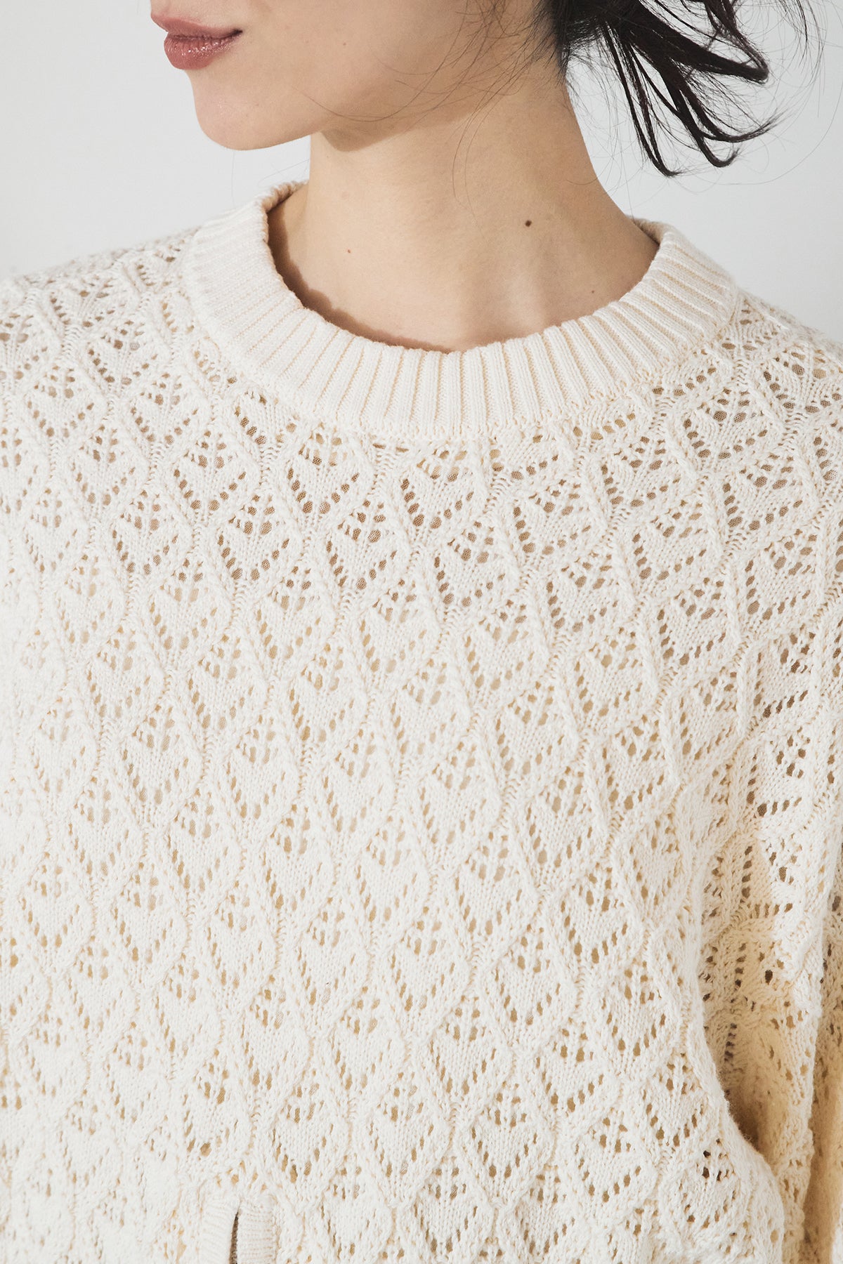繊細な透かし編みが軽やかな印象を与えるニットプルオーバー。フロントのジップスリットがさりげないアクセントとなり、開き具合で表情の変化を楽しめます。程よくコンパクトなシルエットで、パンツにもスカートにも合わせやすく、レイヤードスタイルにも活躍。上品さと抜け感を兼ね備えた一枚です。