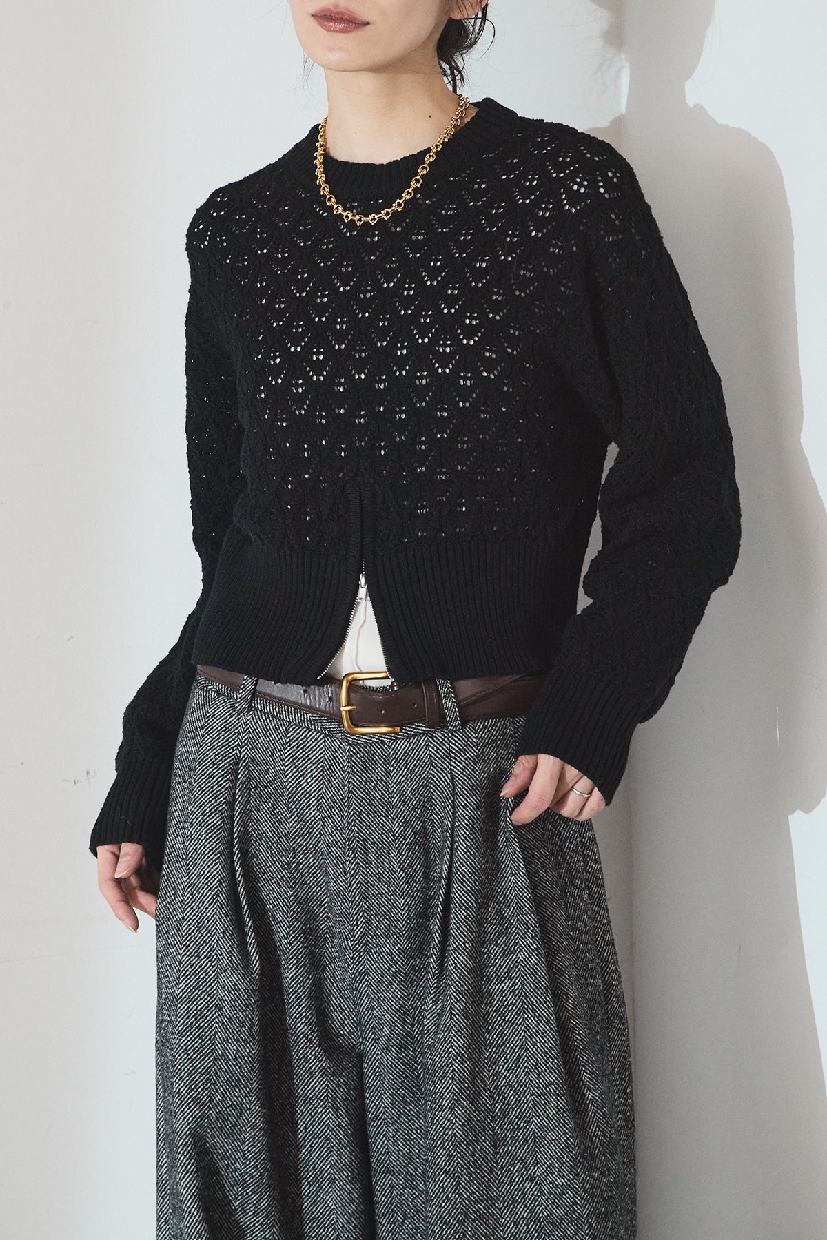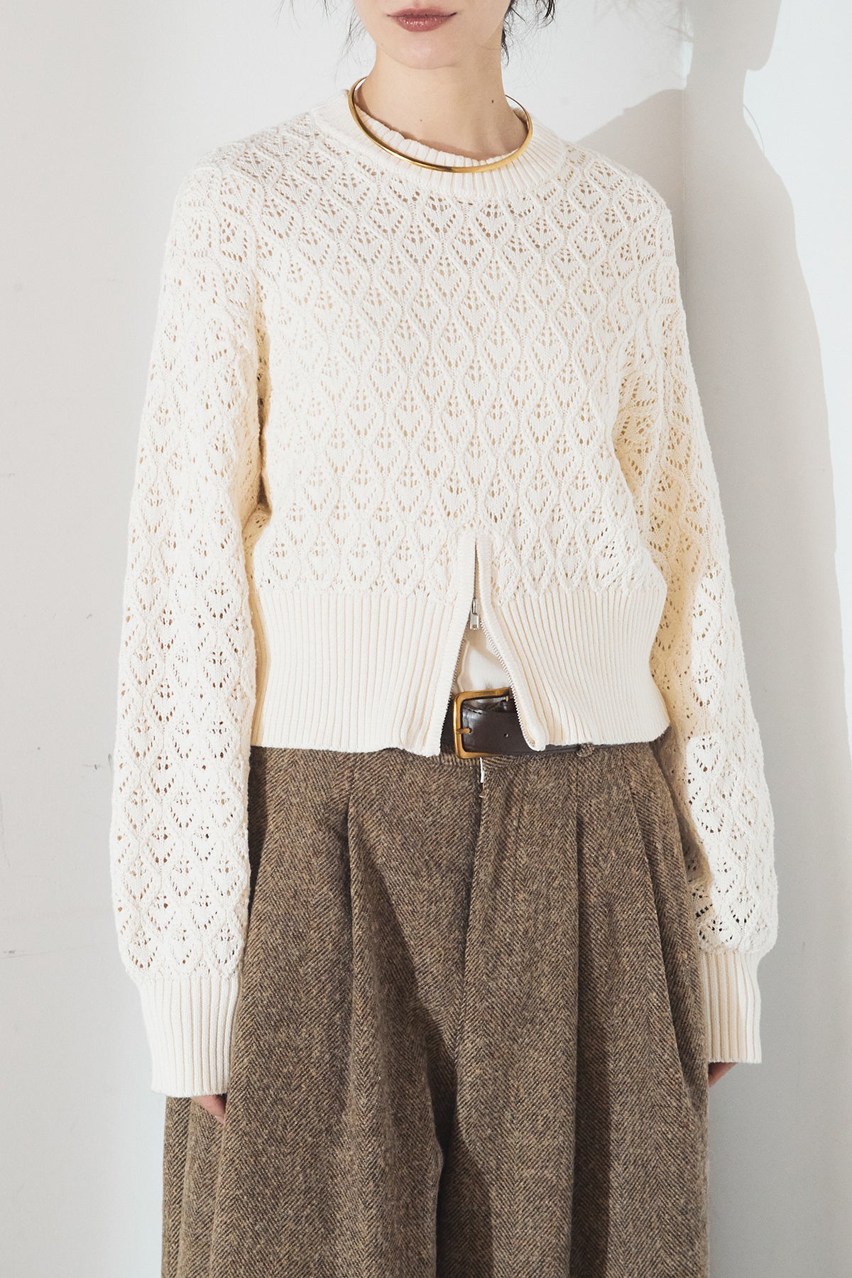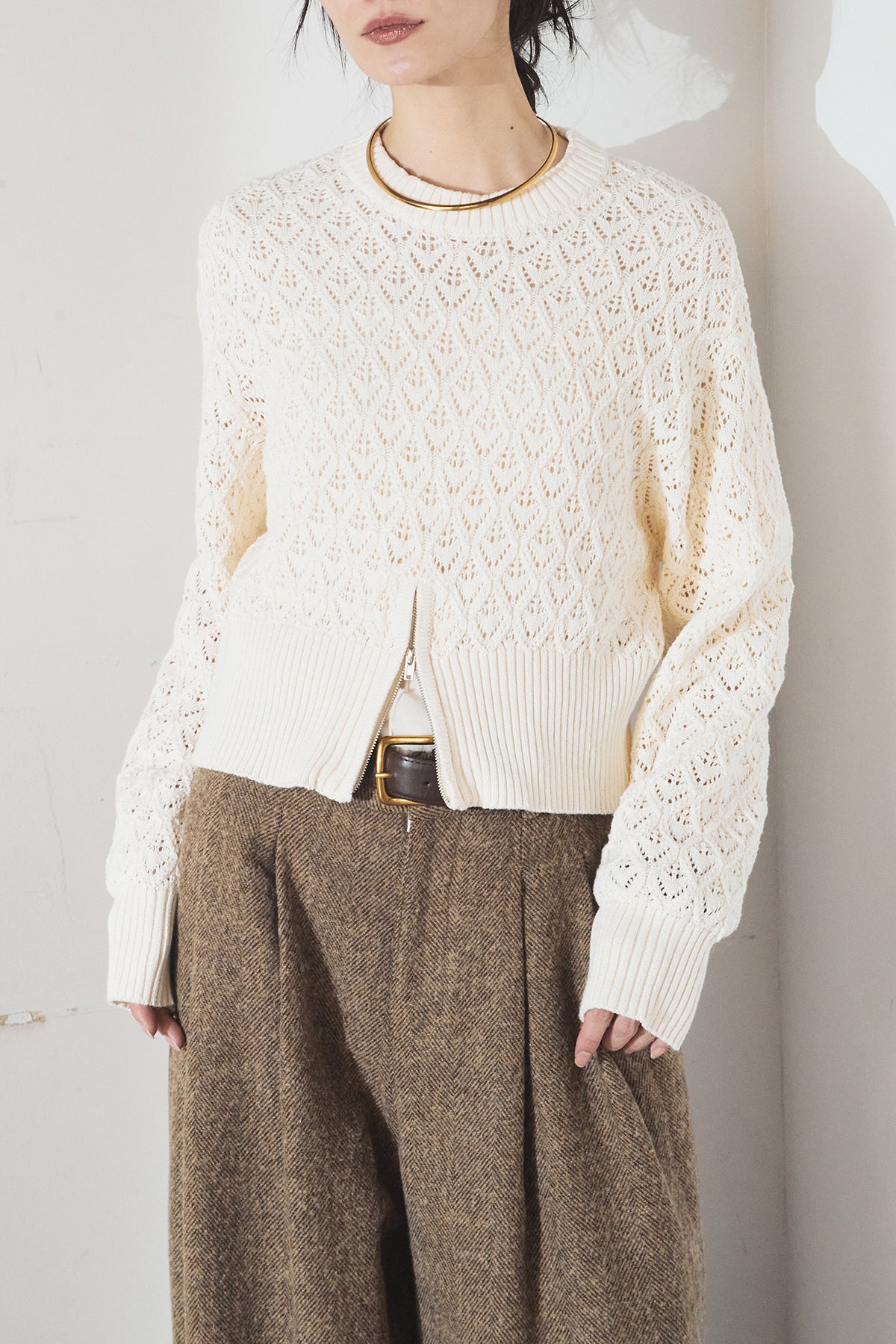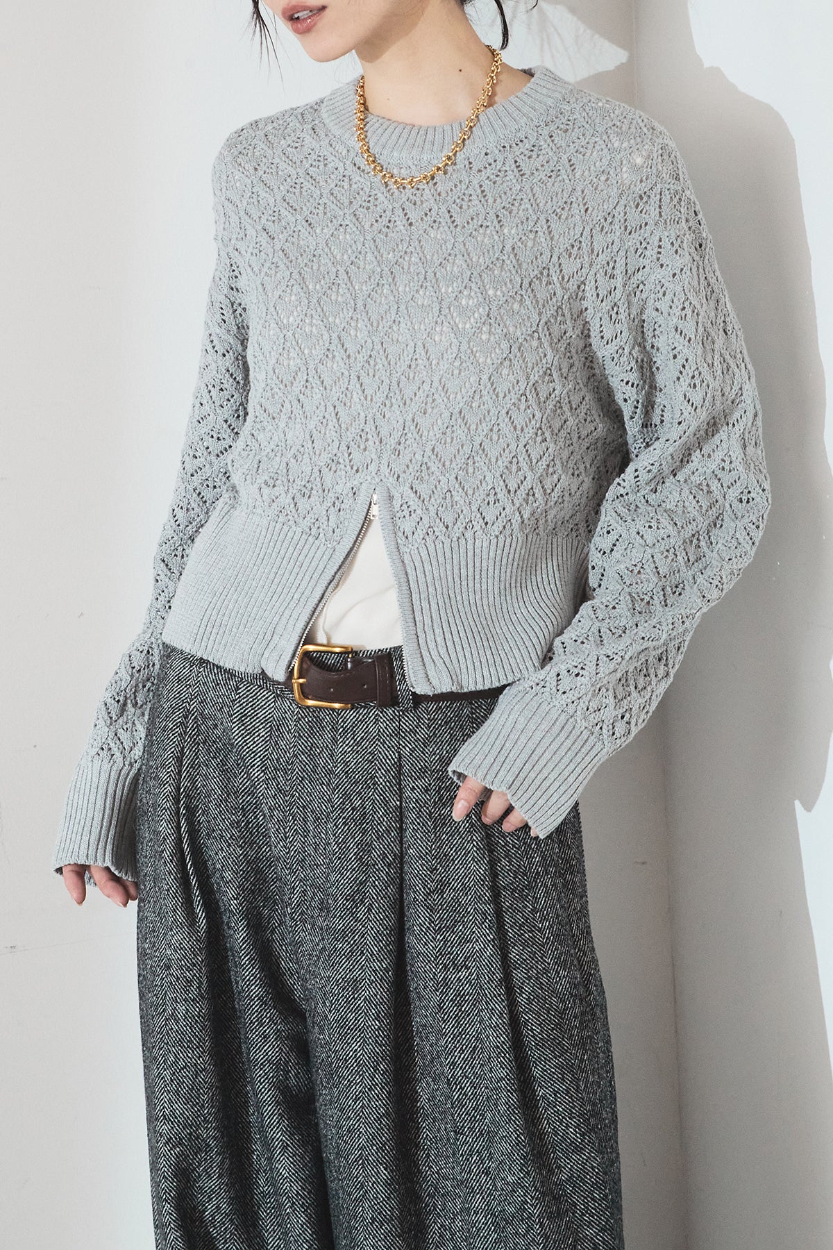 透かし編みニットジップスリットプルオーバーを含んだコーデセット商品を探す↓