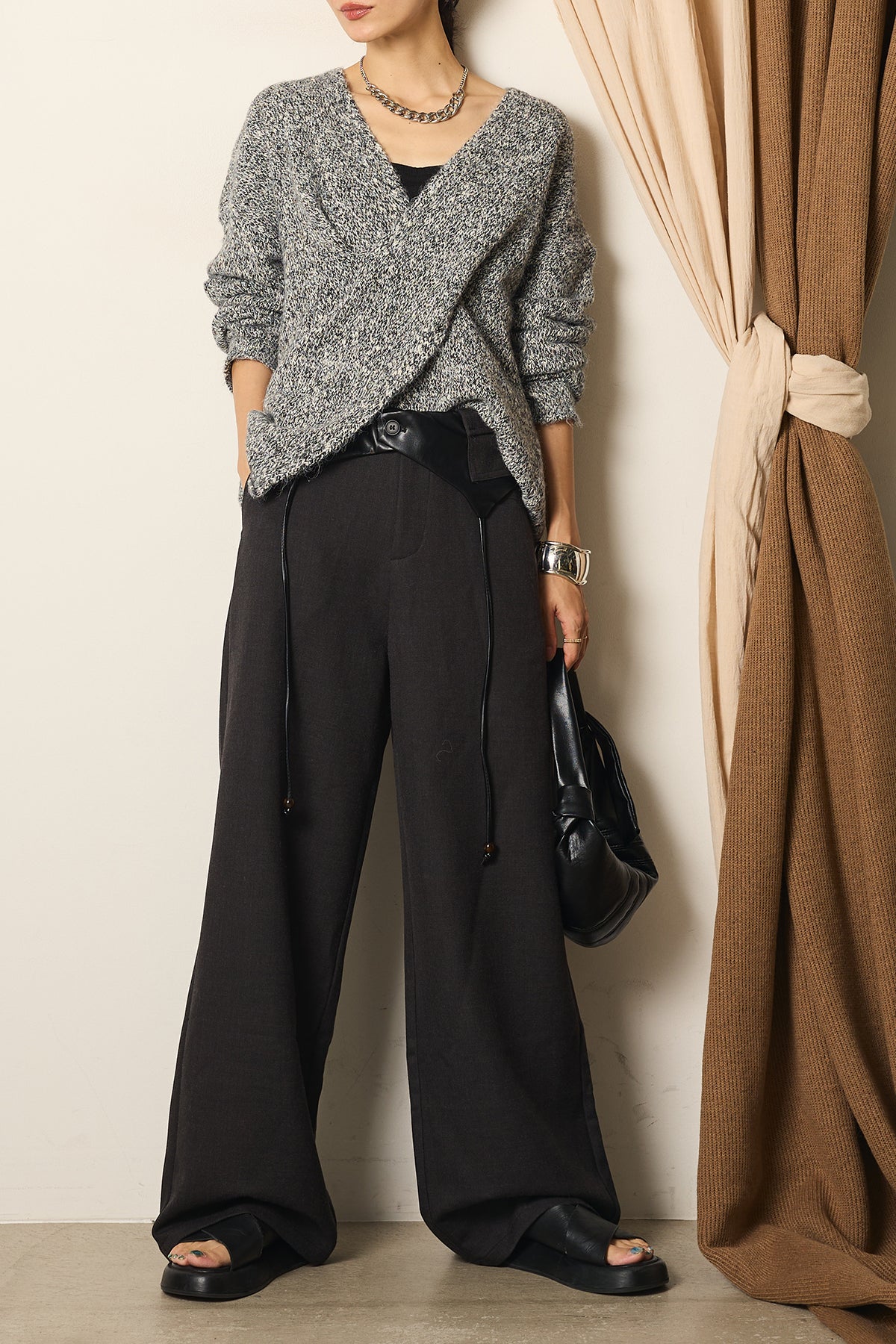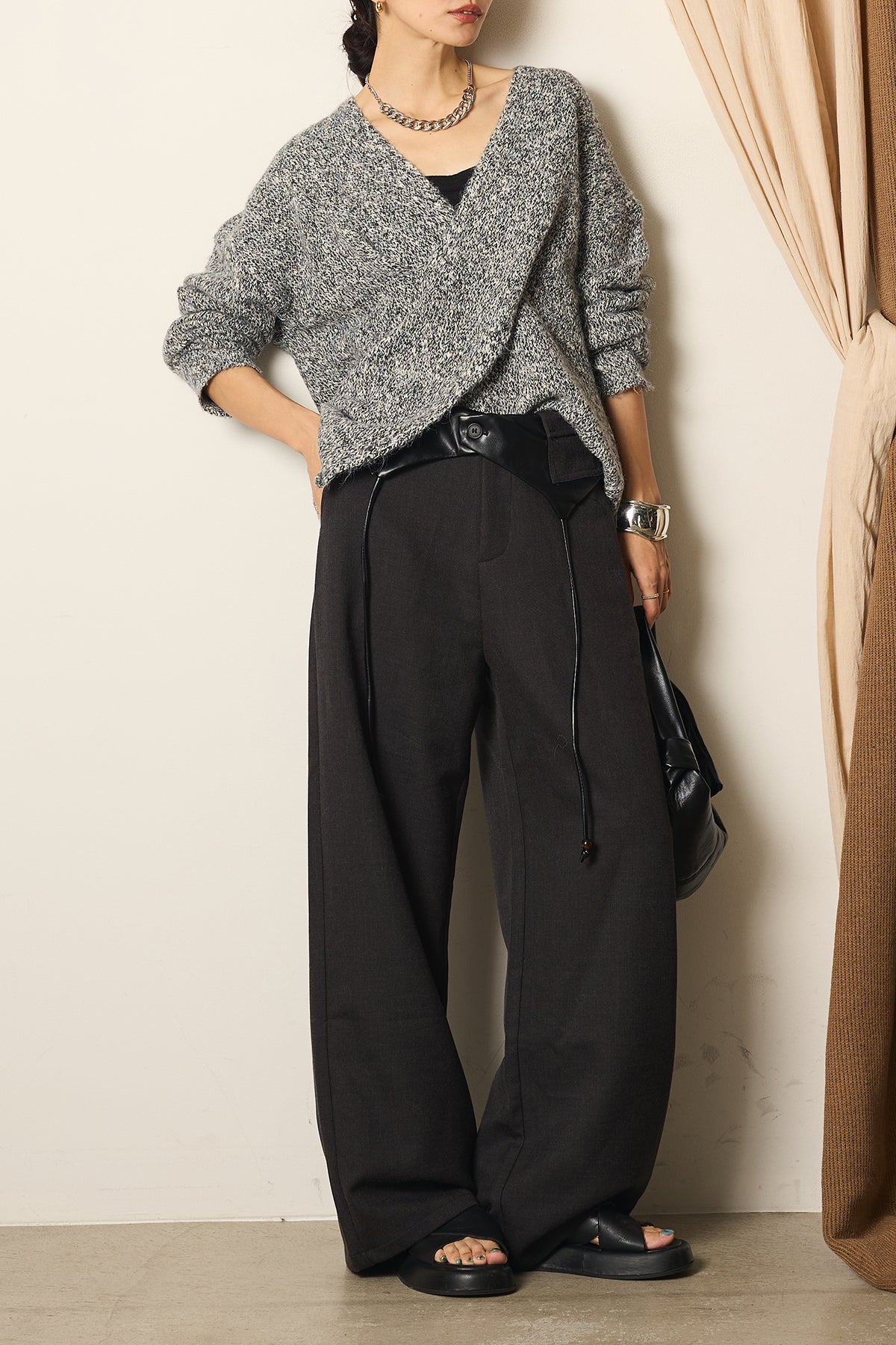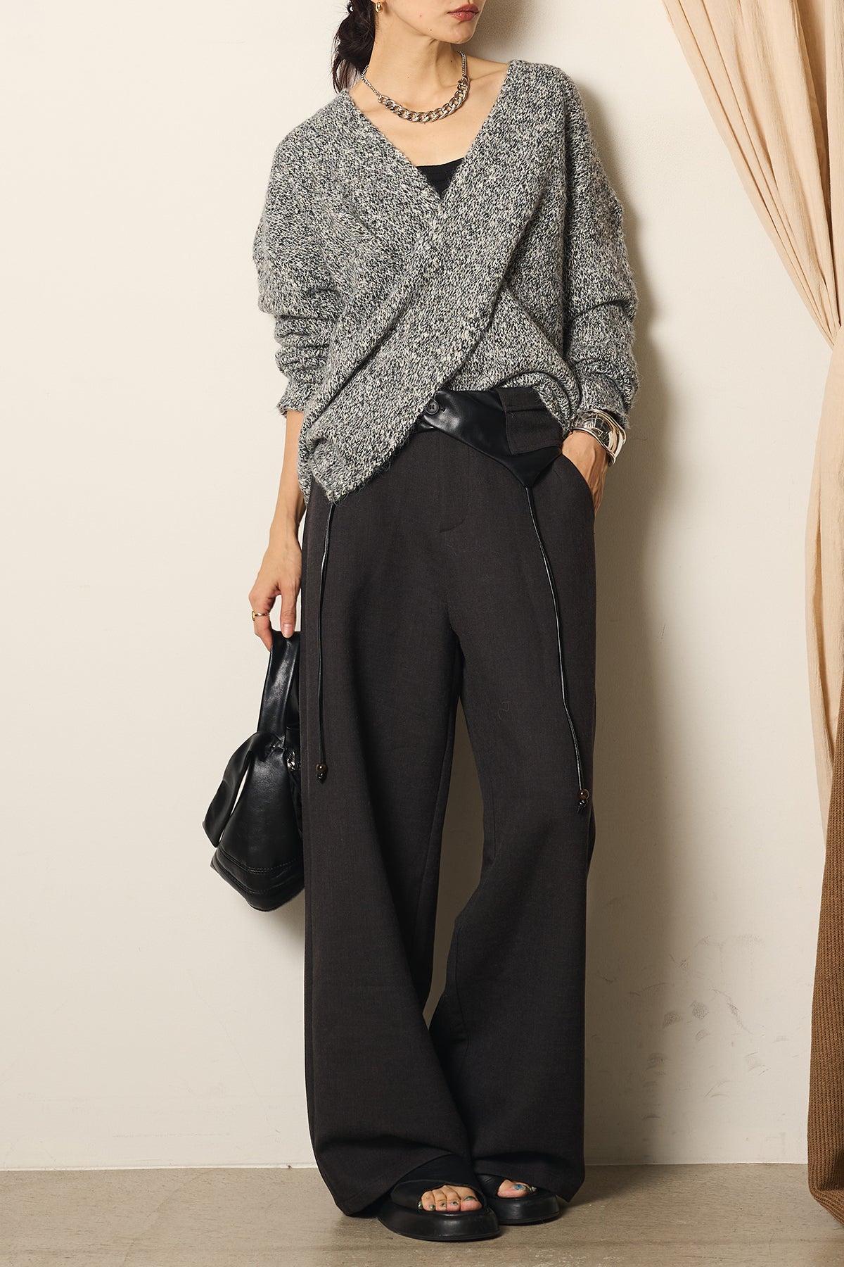 シンプルなトップスを合わせるだけで、洗練されたモードスタイルが完成する一枚です。