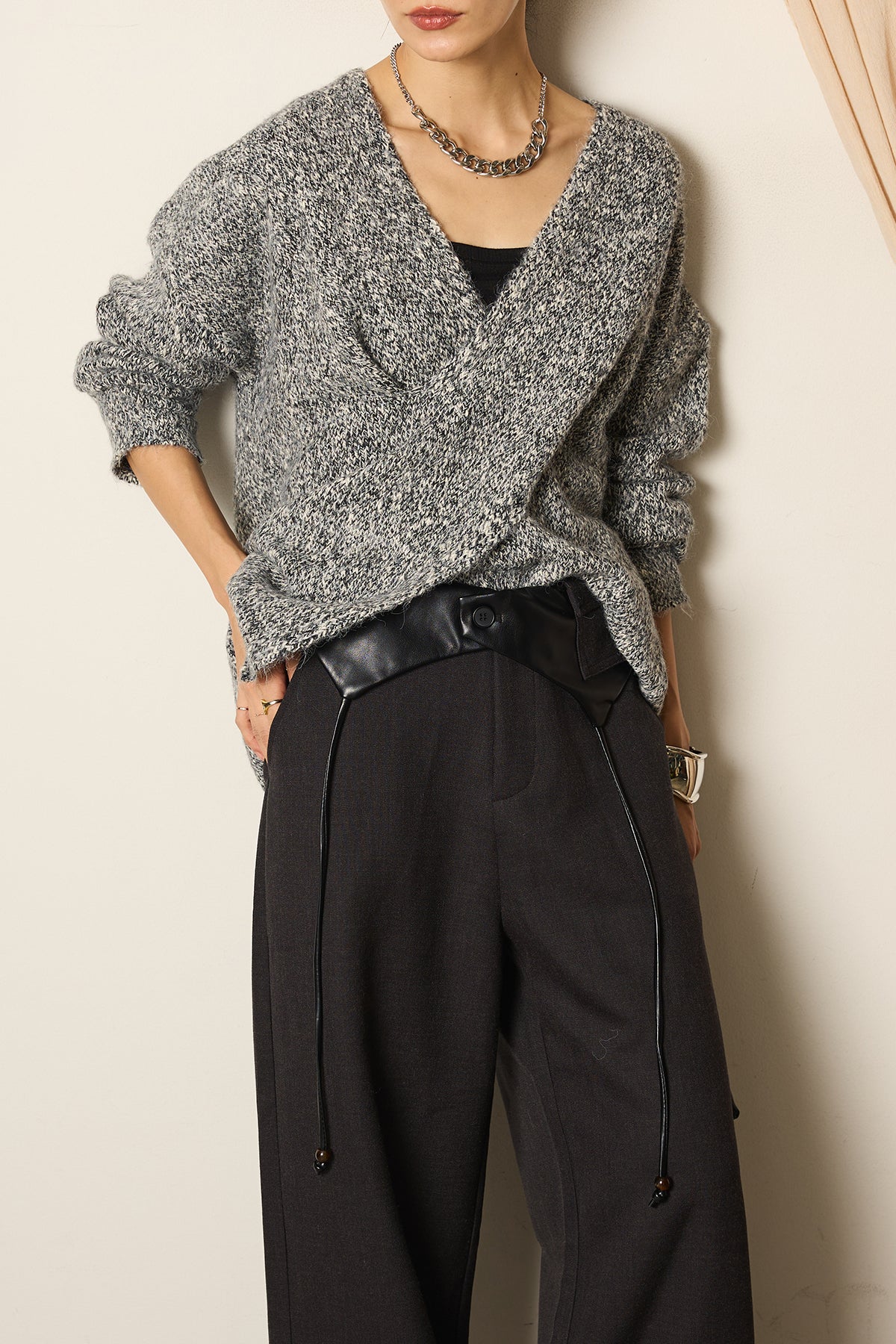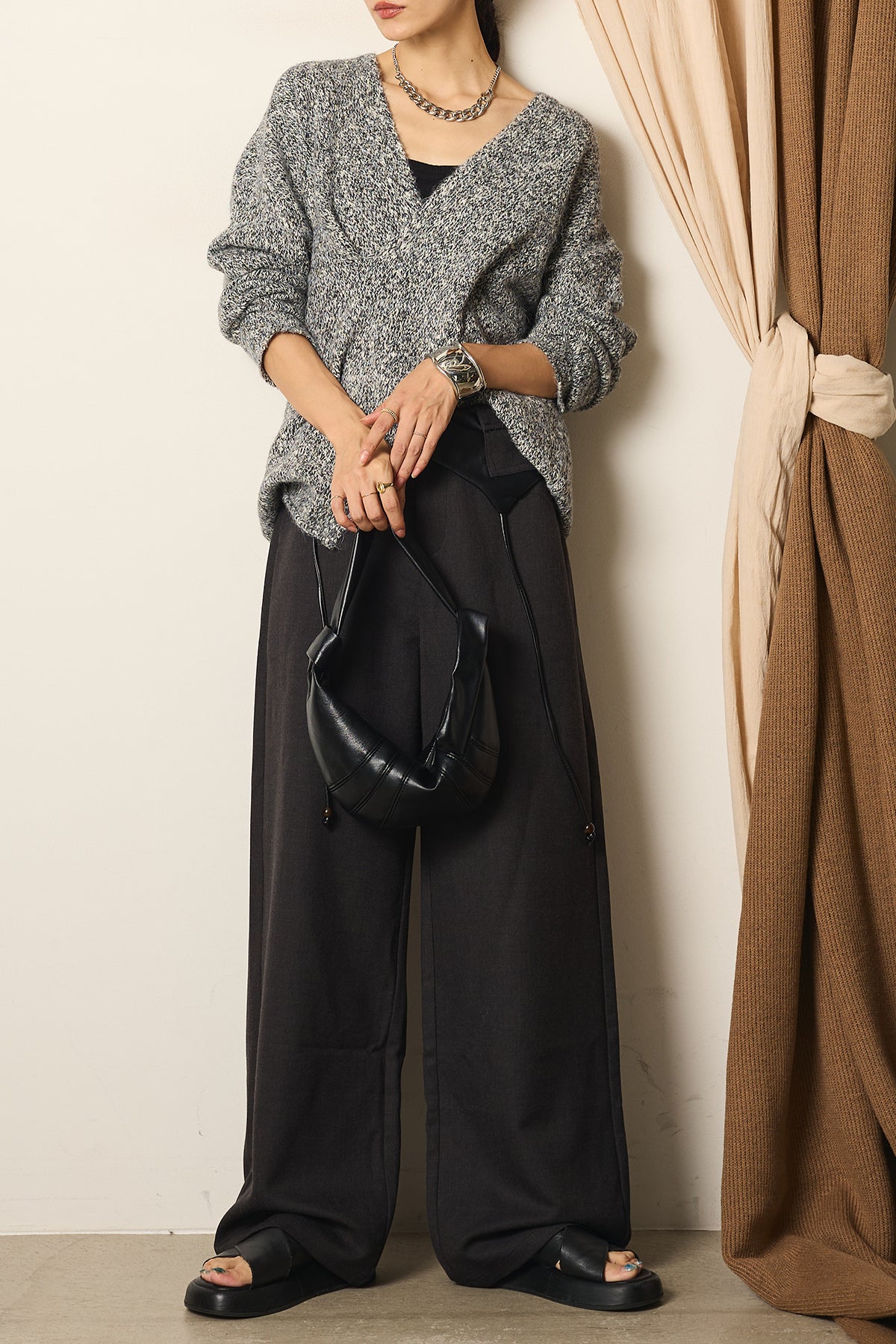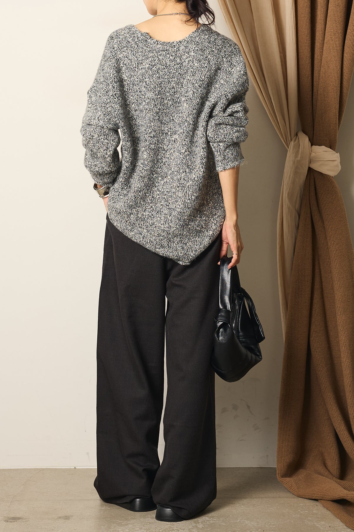 シンプルなトップスを合わせるだけで、洗練されたモードスタイルが完成する一枚です。