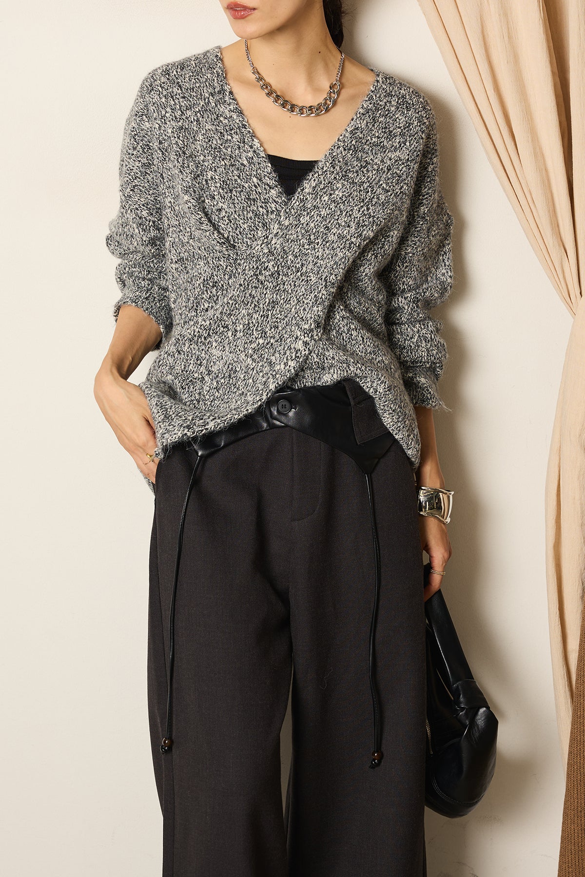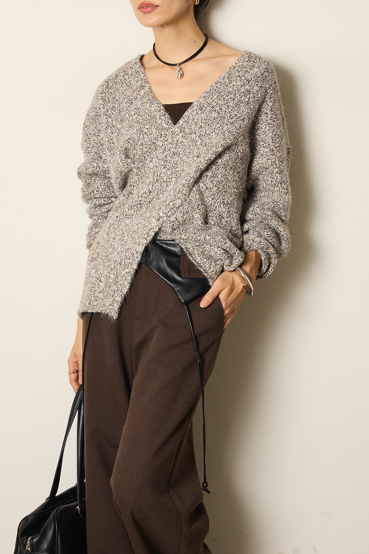 立体感のあるクロスデザインが印象的なミックスニットトップス。