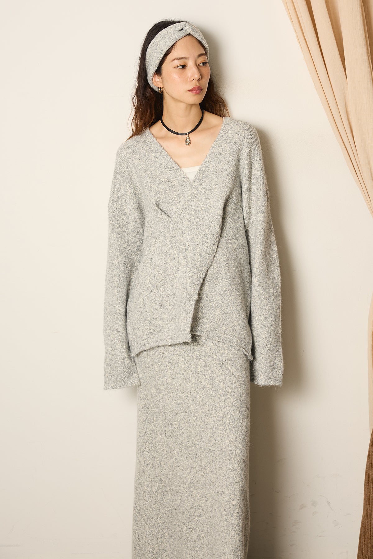 ヘアバンド付きクロスデザインミックスニットトップスの他のセットページはこちら