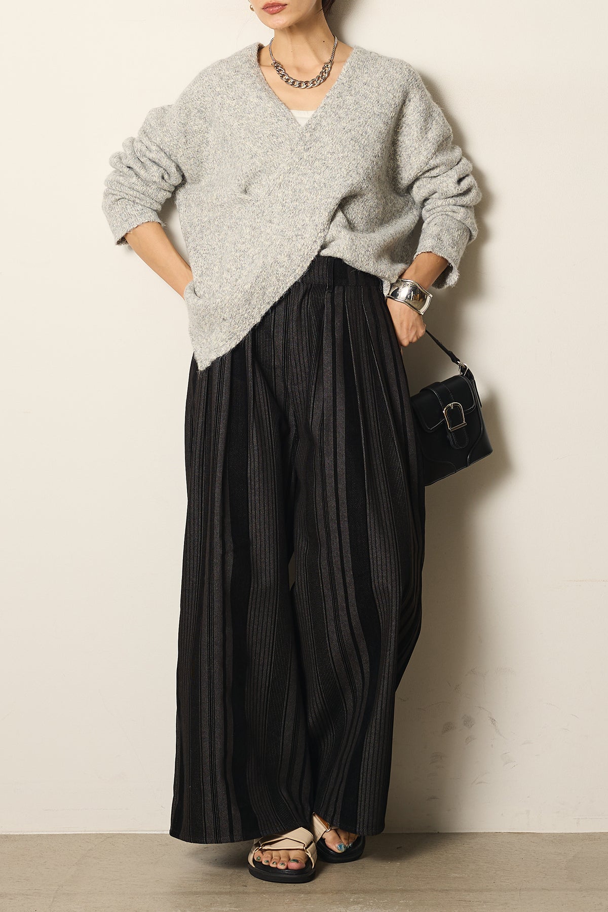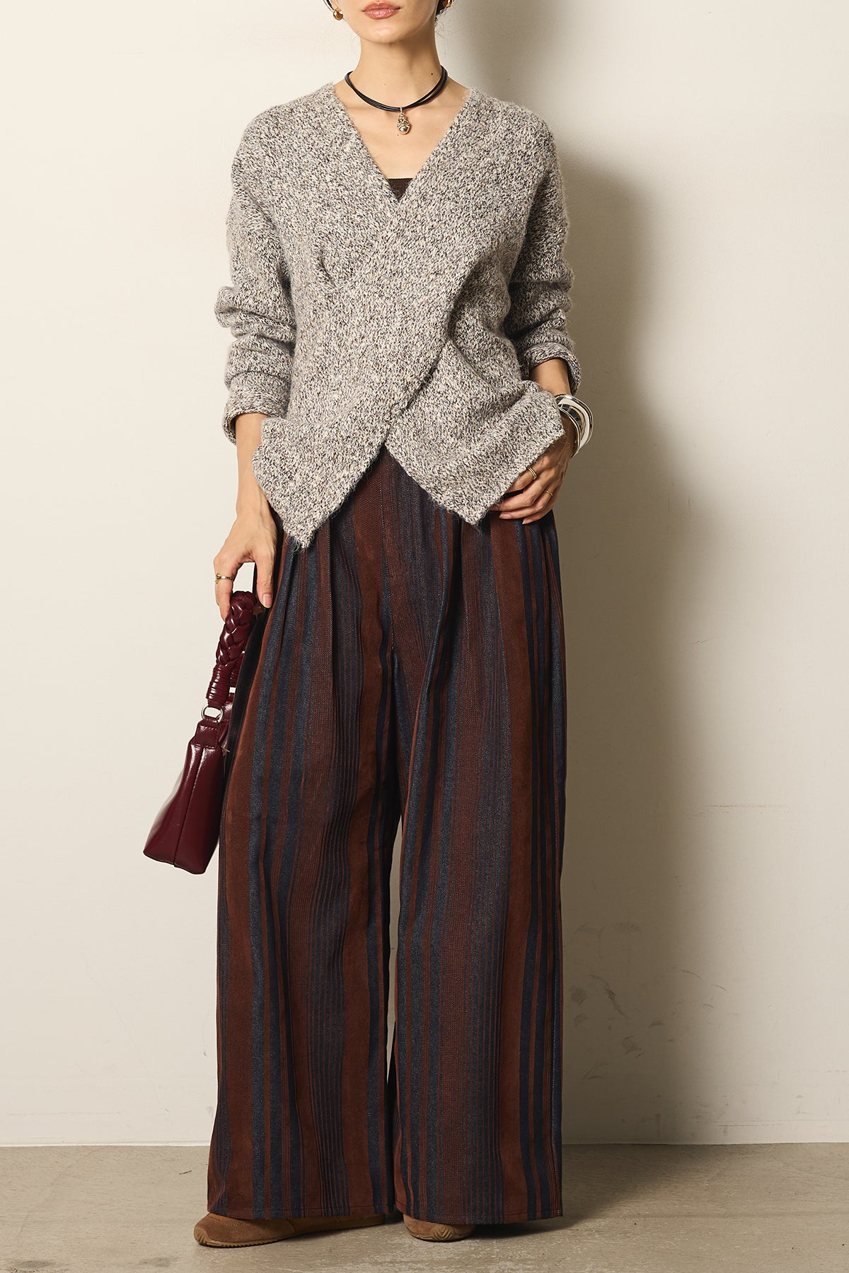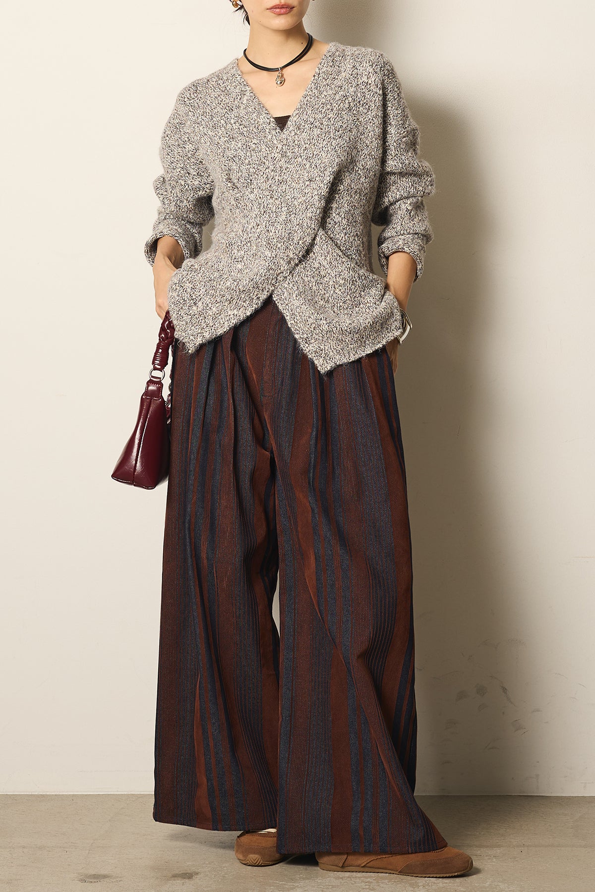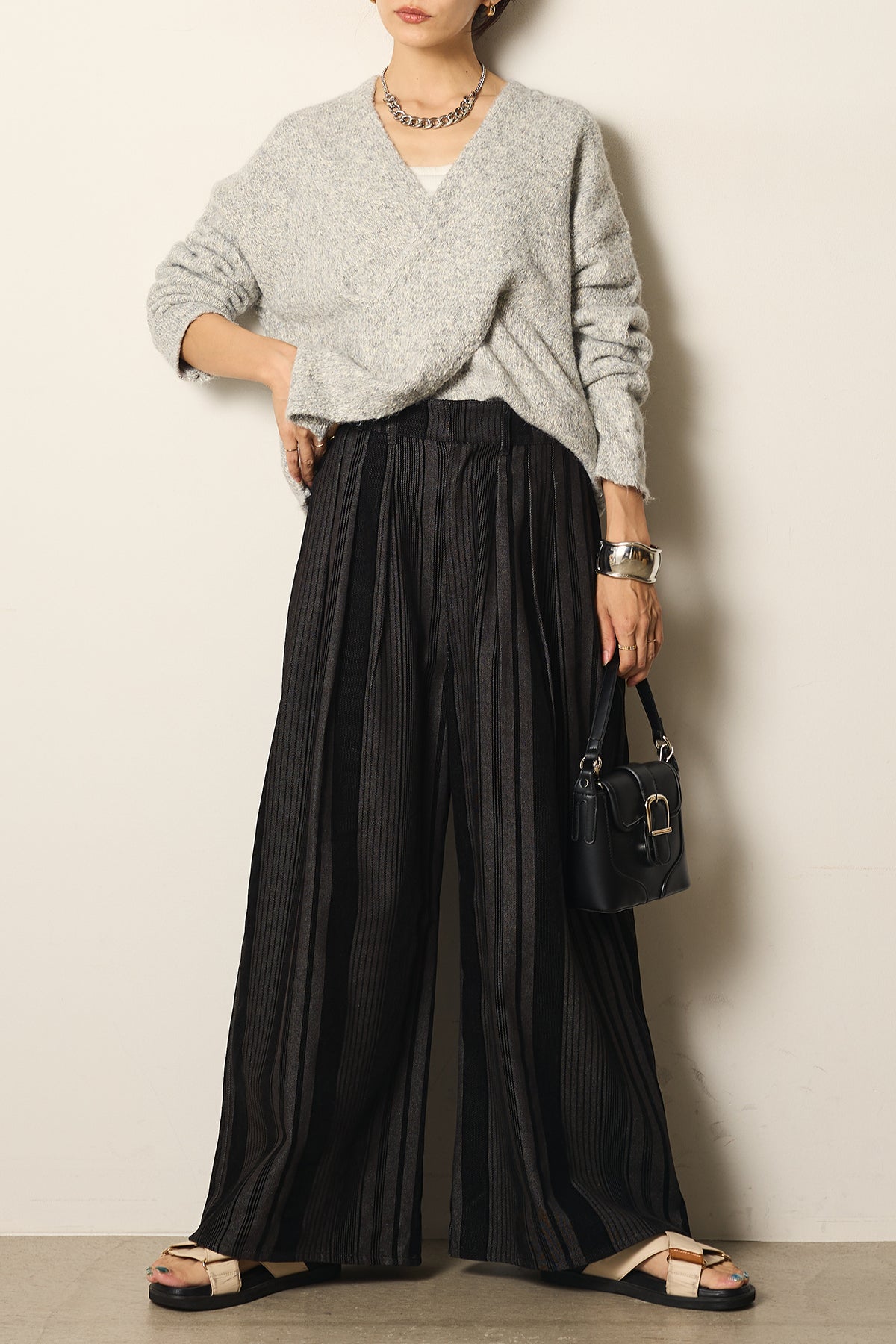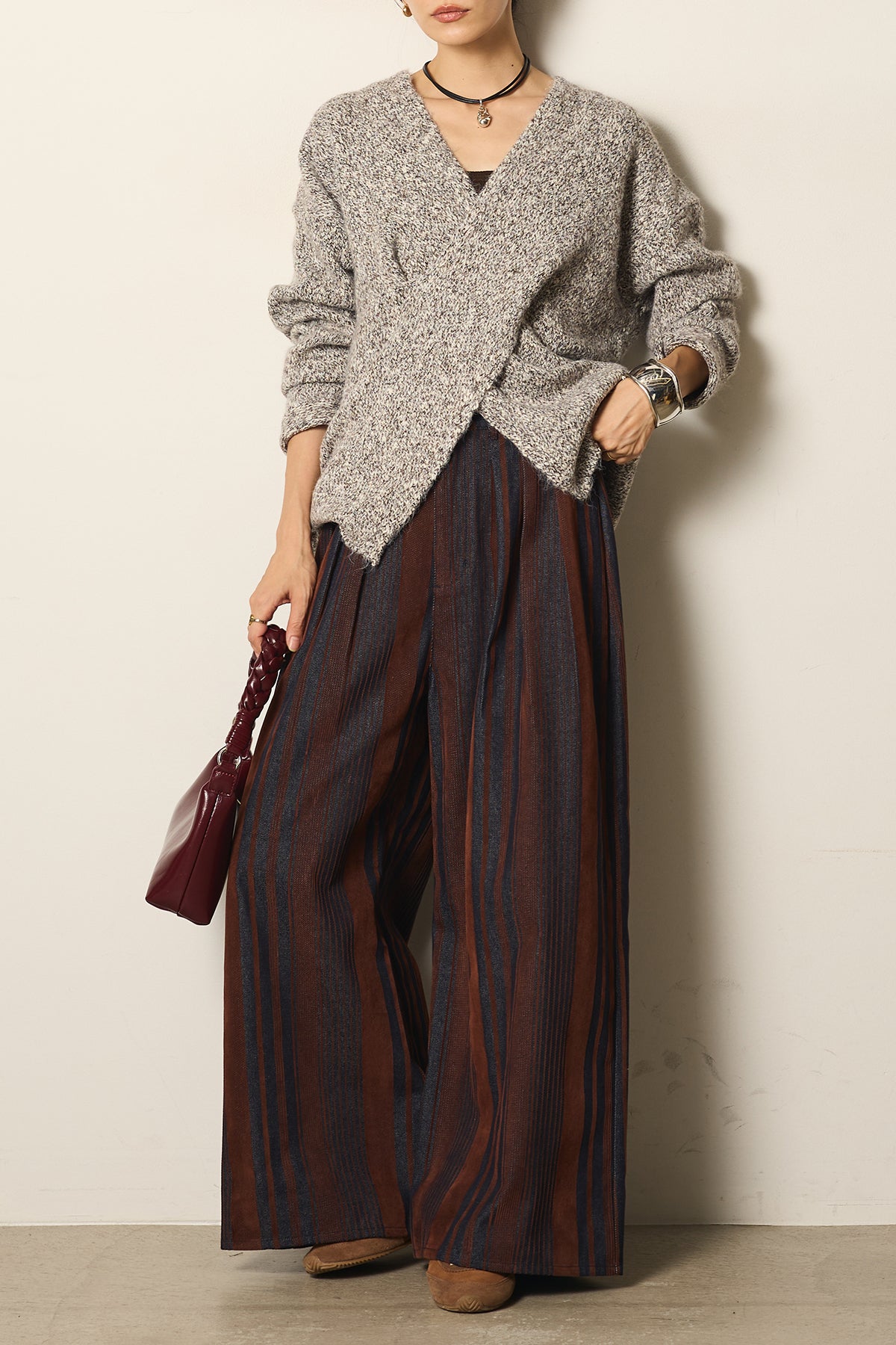 [SET]ヘアバンド付きクロスデザインミックスニットトップス+ランダムストライプ柄タックワイドパンツ(2set)