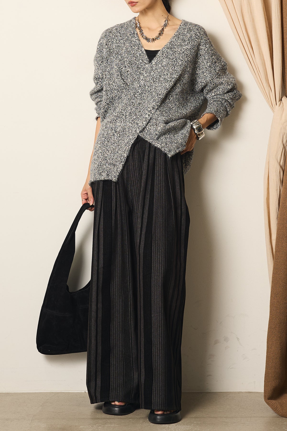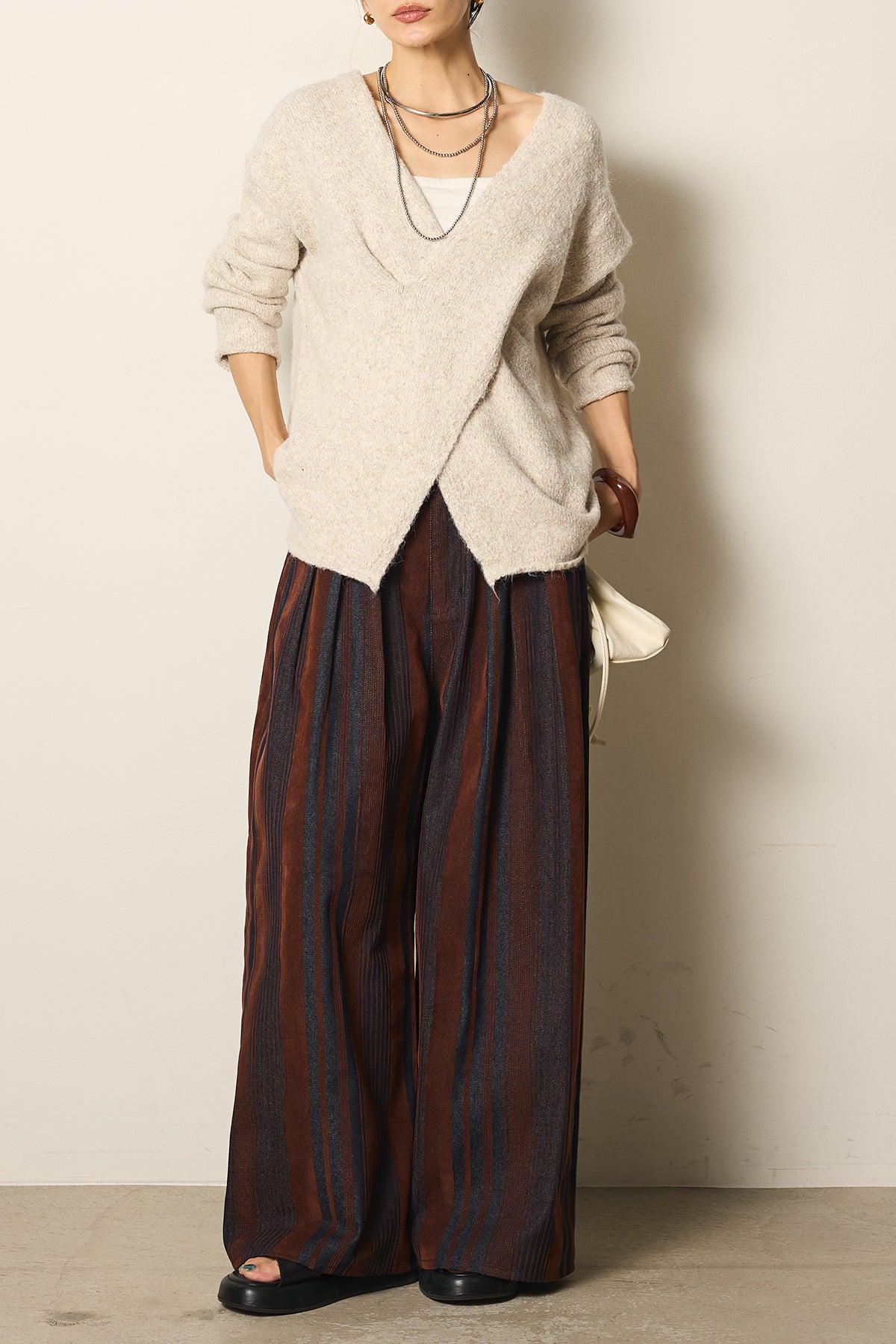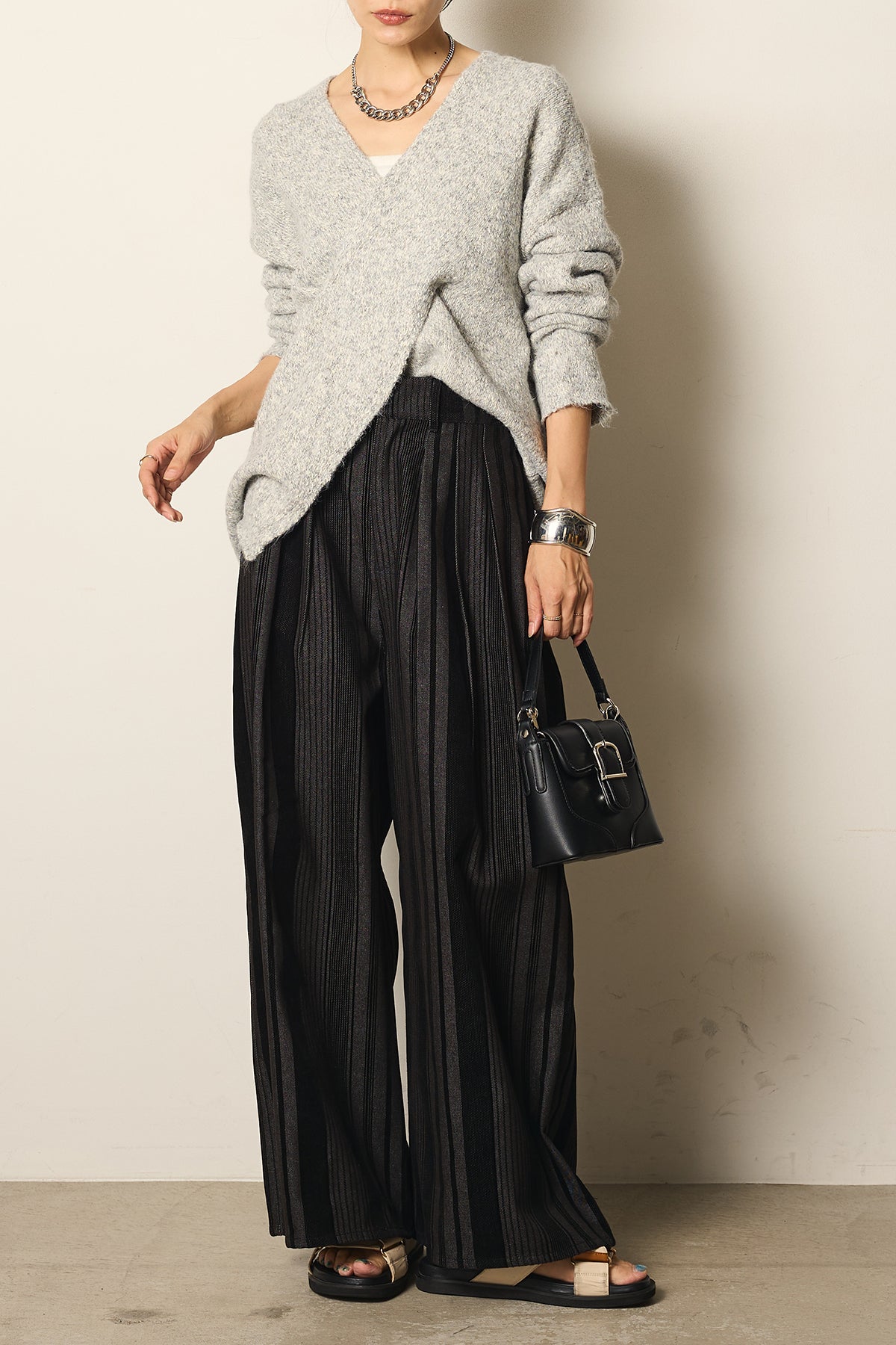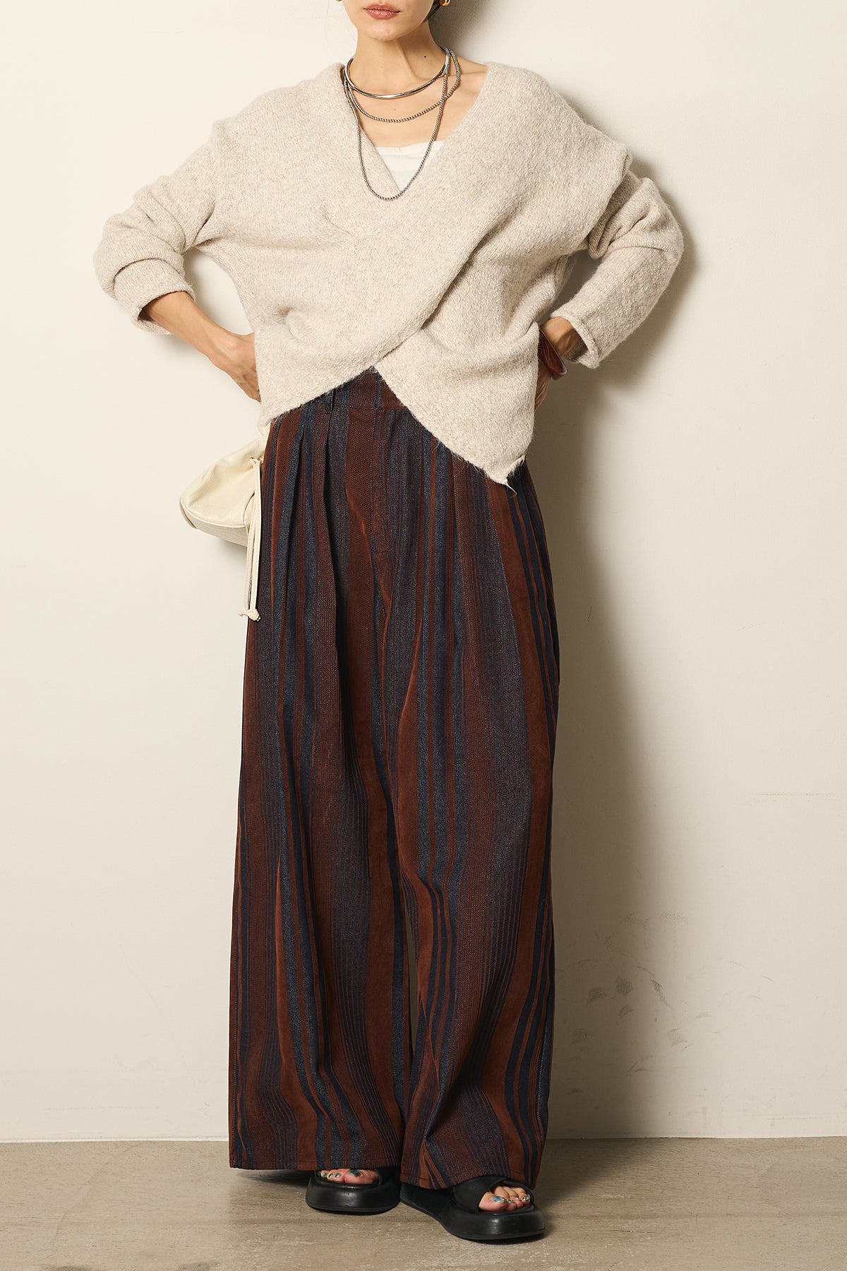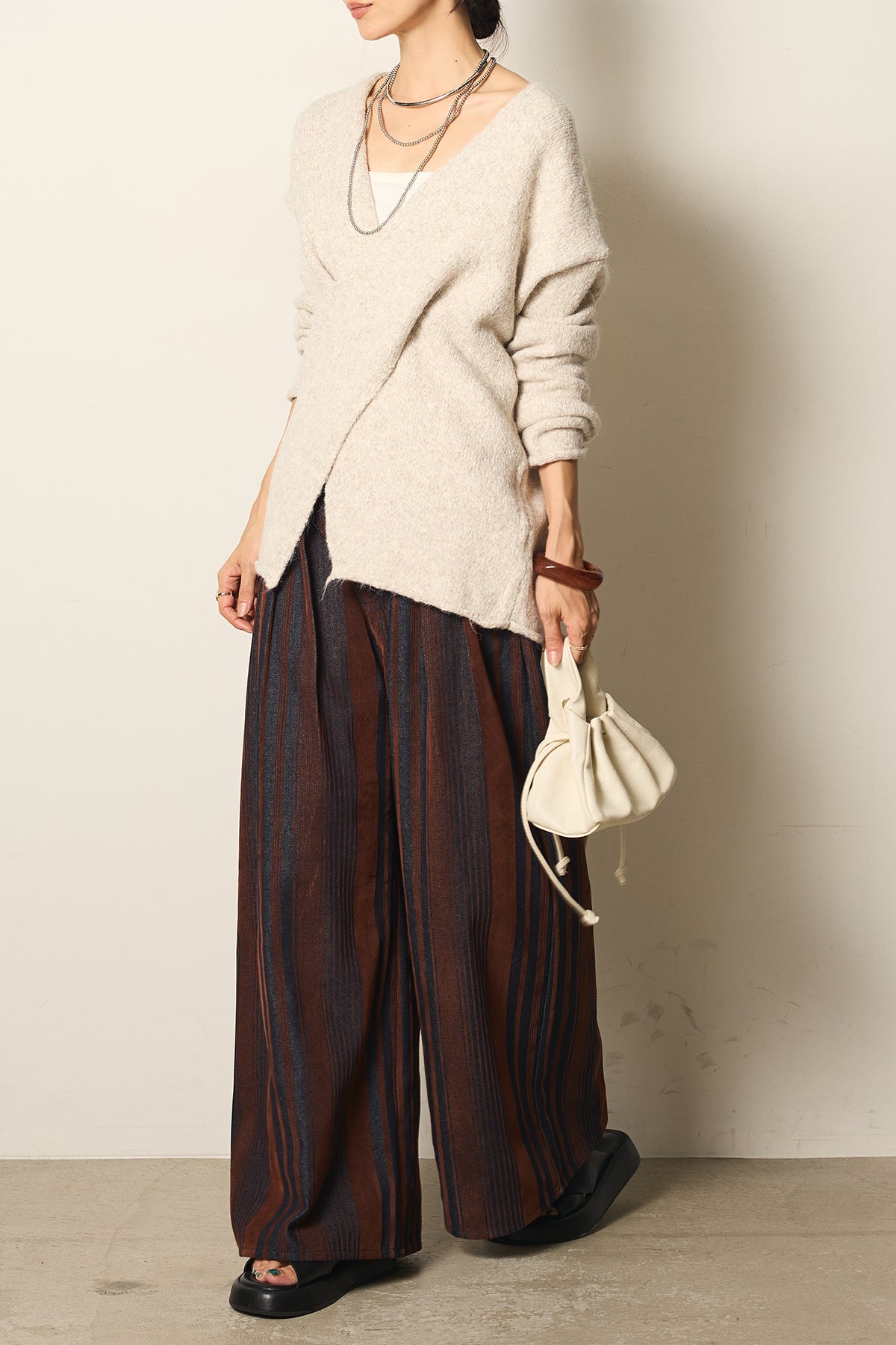 [SET]ヘアバンド付きクロスデザインミックスニットトップス+ランダムストライプ柄タックワイドパンツ(2set)