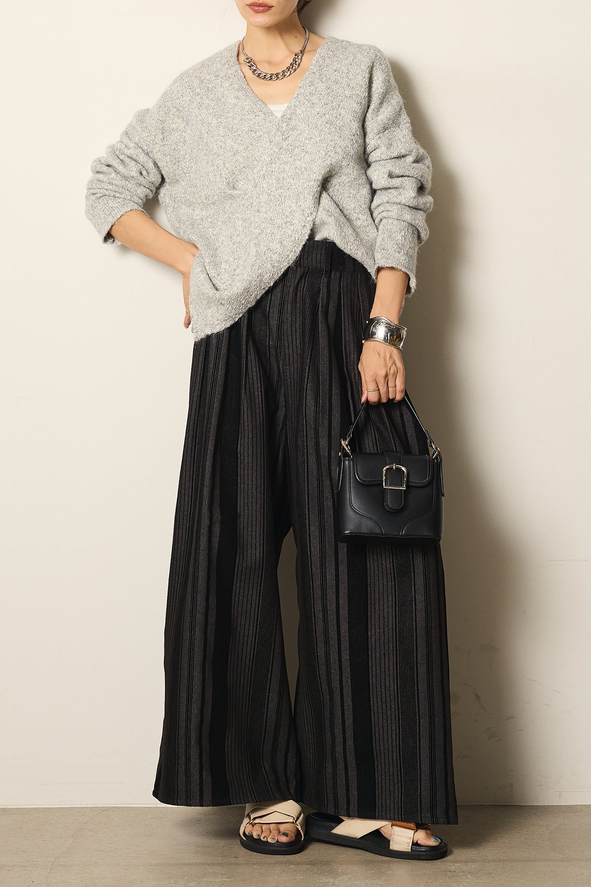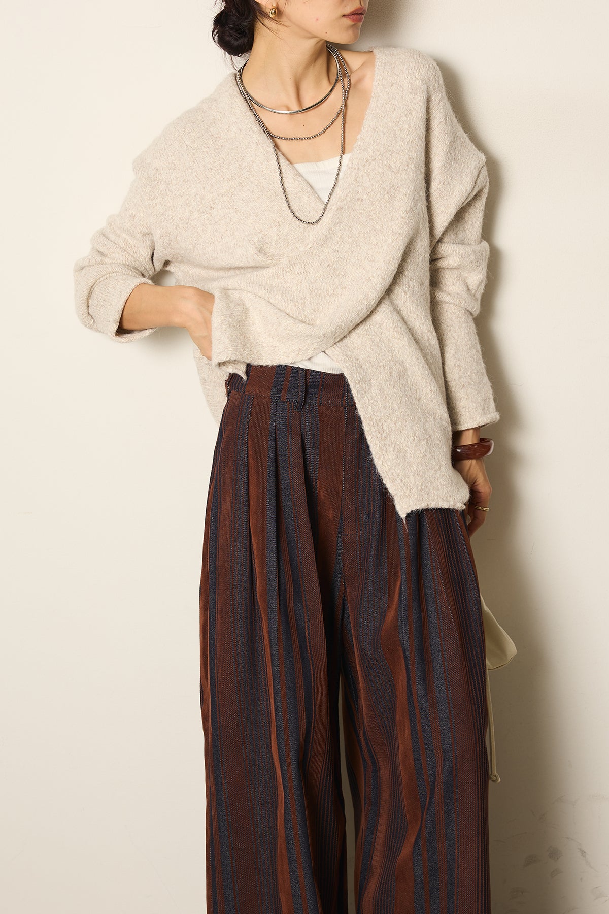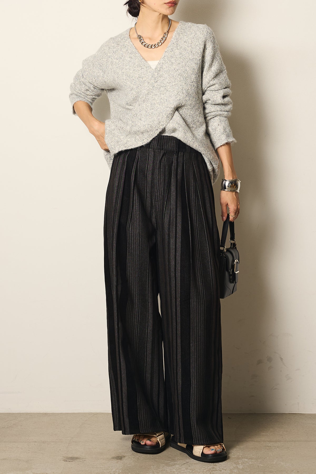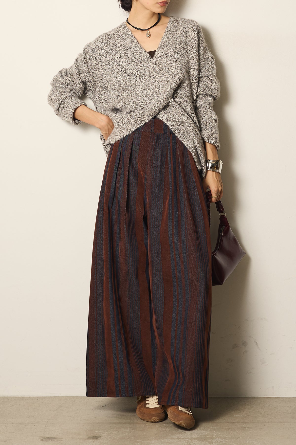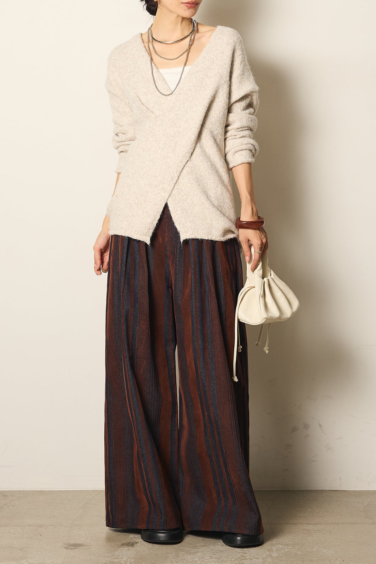 [SET]ヘアバンド付きクロスデザインミックスニットトップス+ランダムストライプ柄タックワイドパンツ(2set)