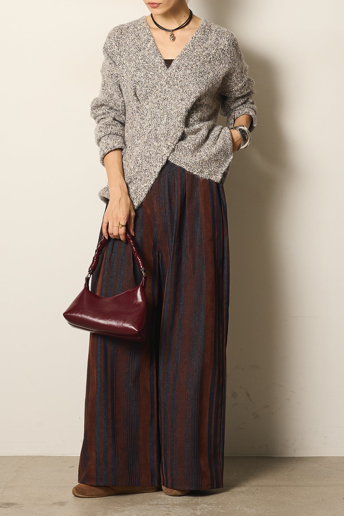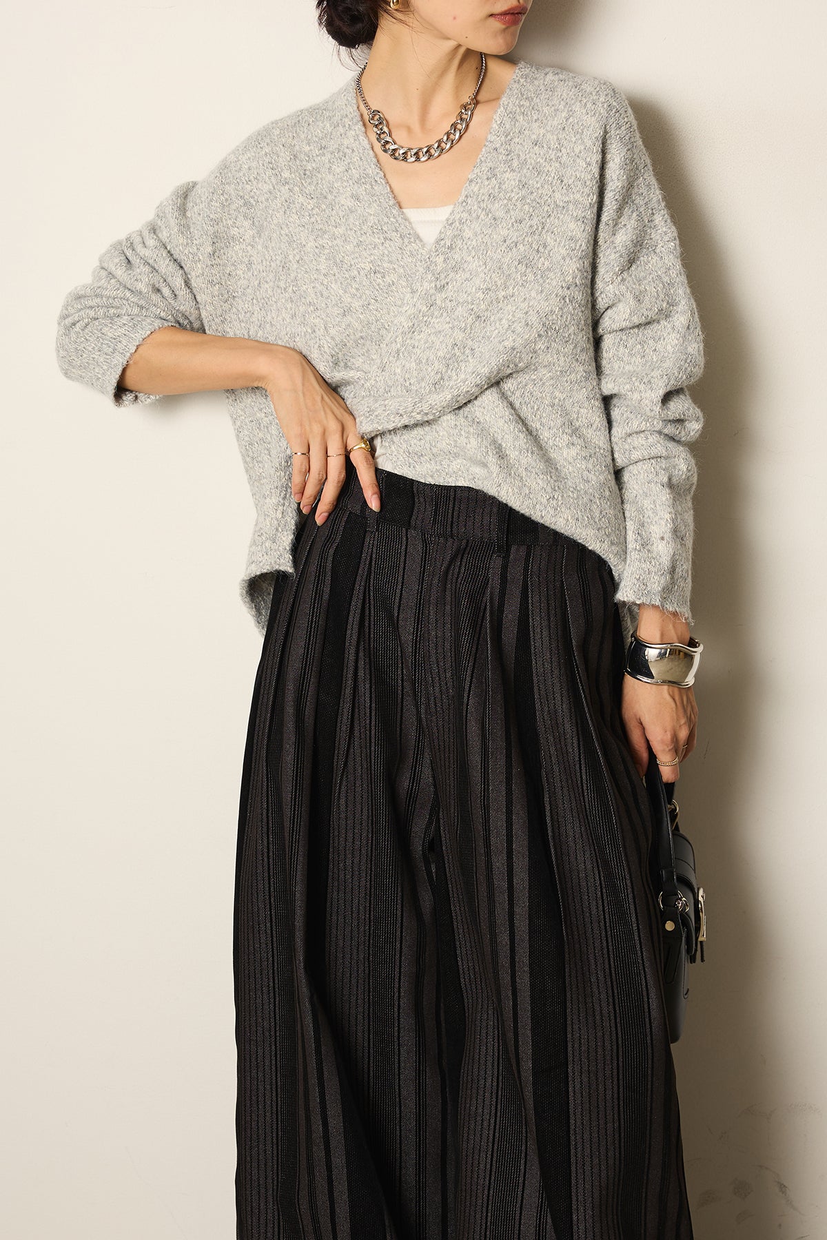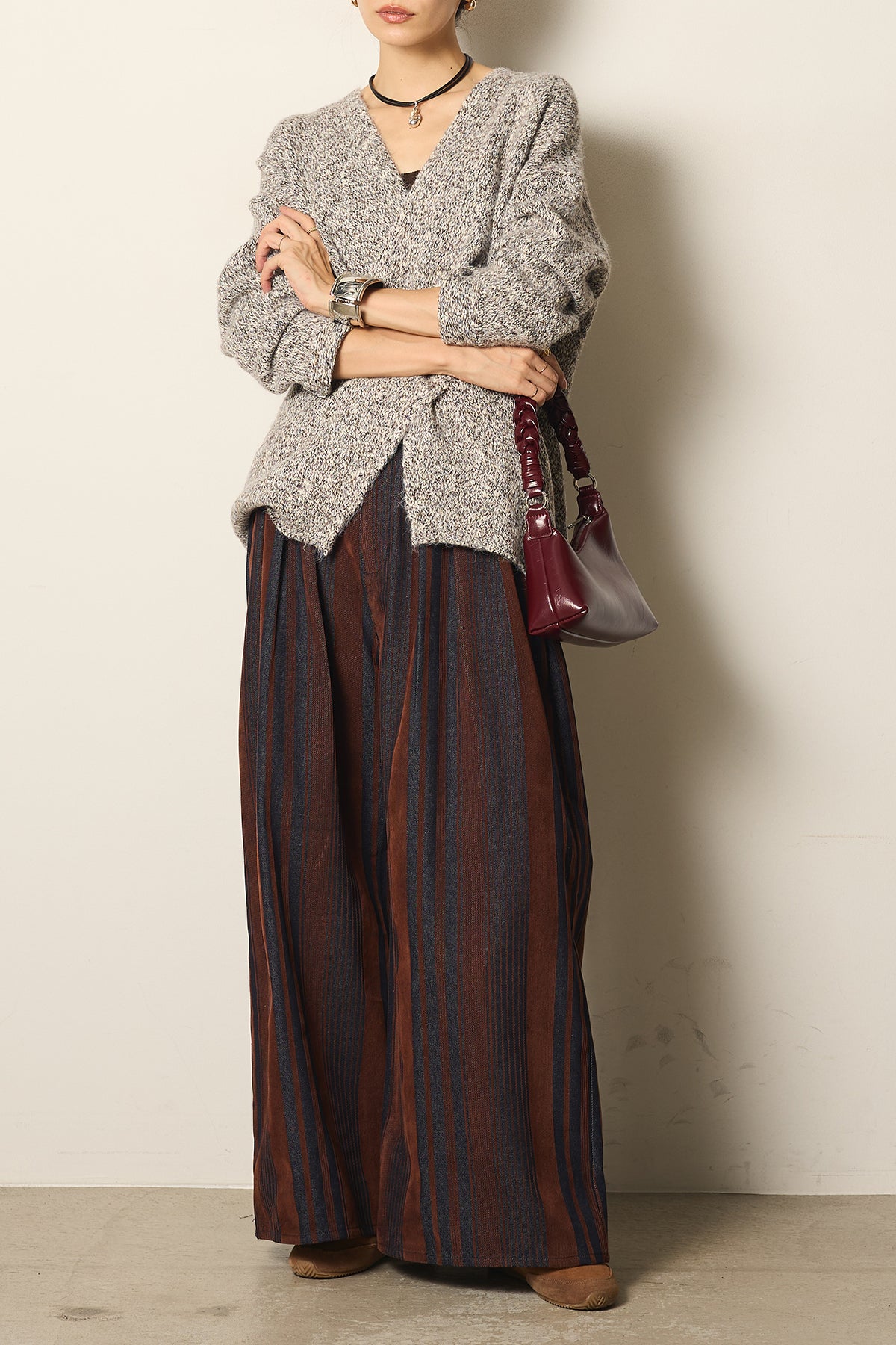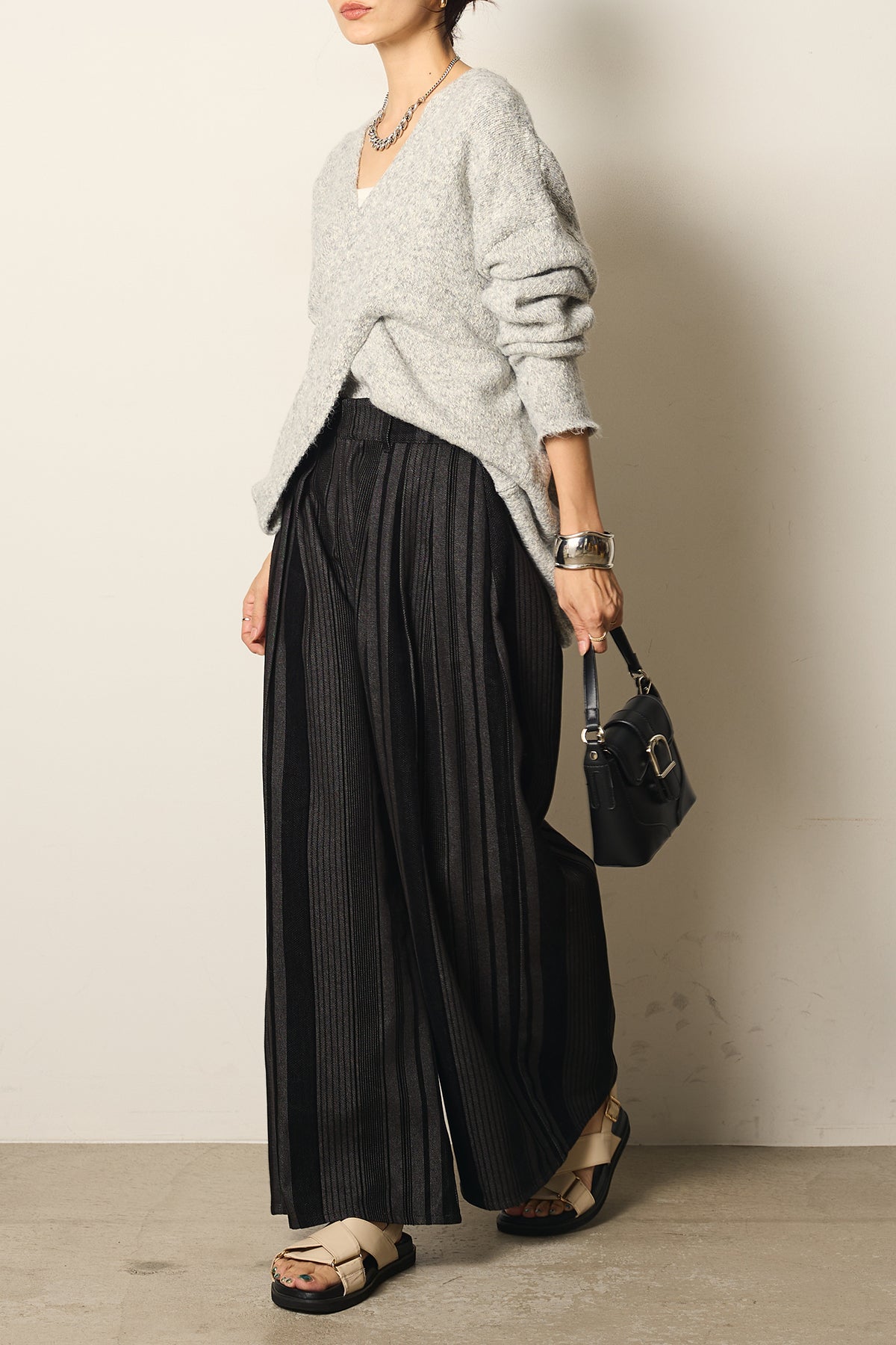 [SET]ヘアバンド付きクロスデザインミックスニットトップス+ランダムストライプ柄タックワイドパンツ(2set)