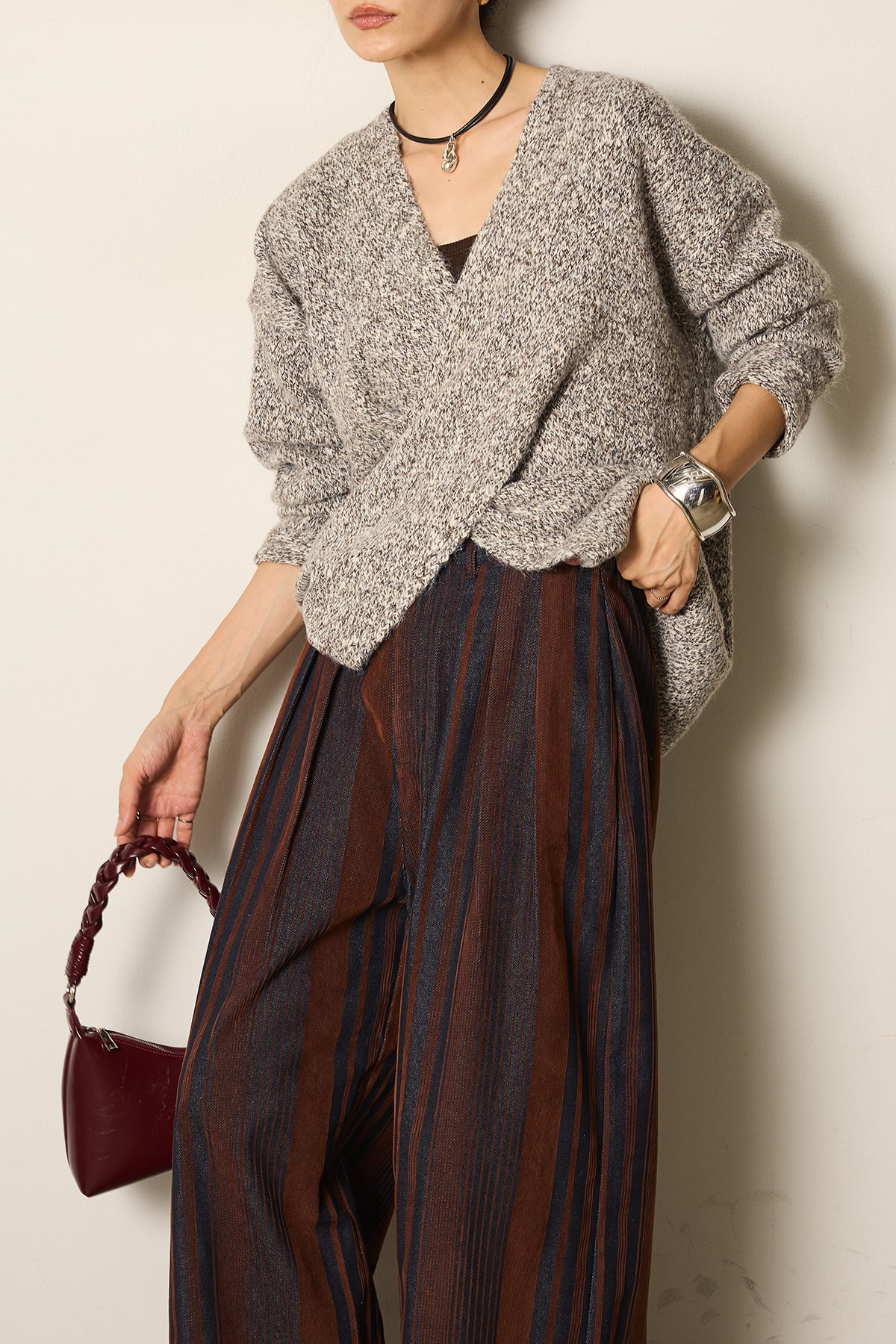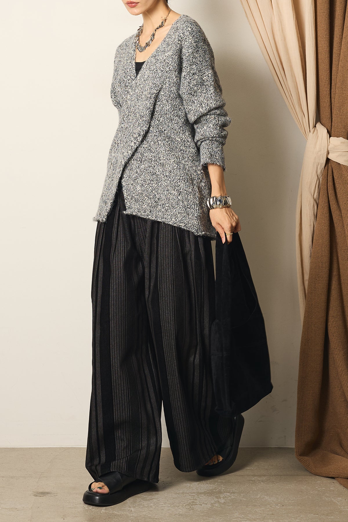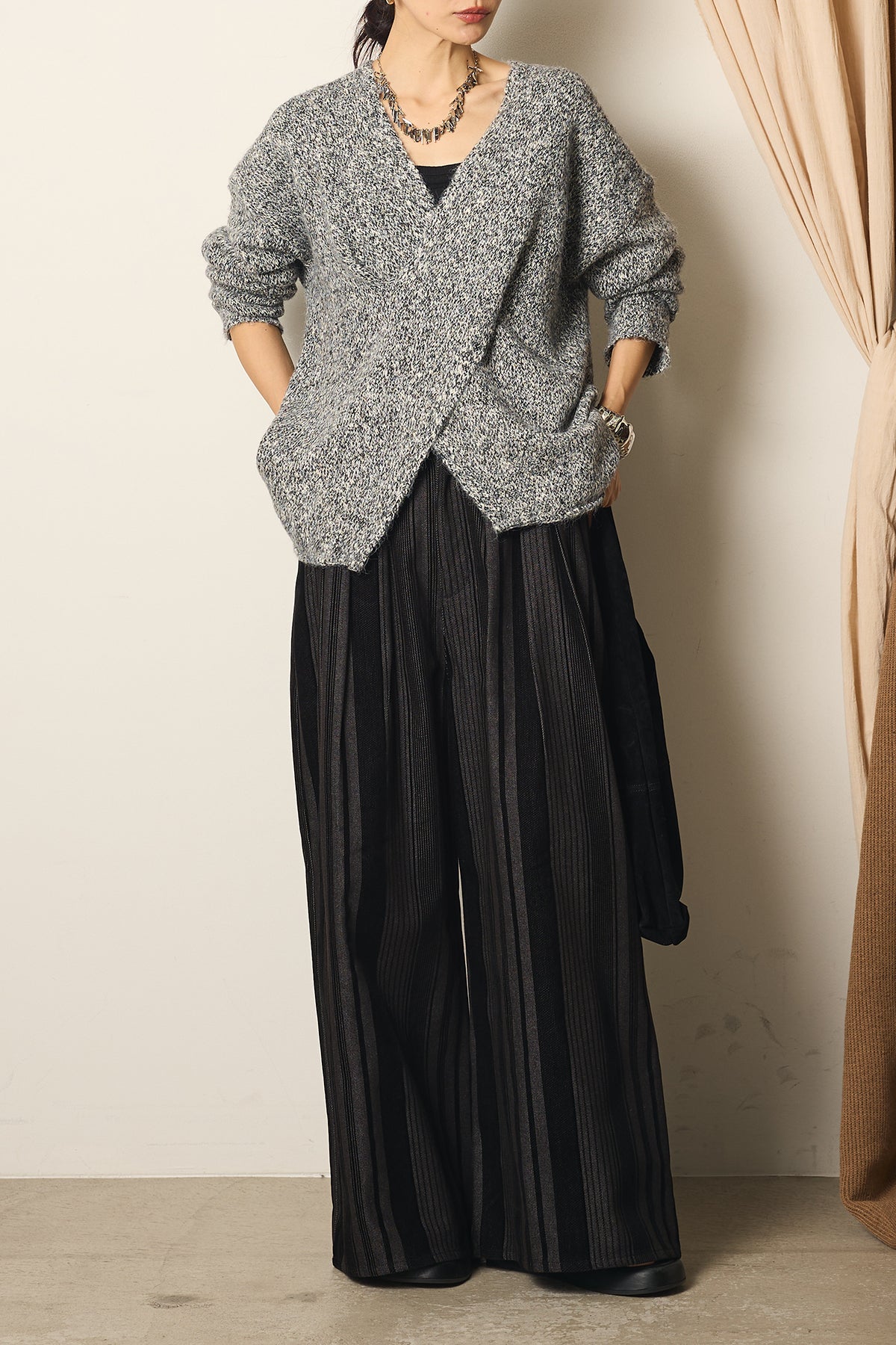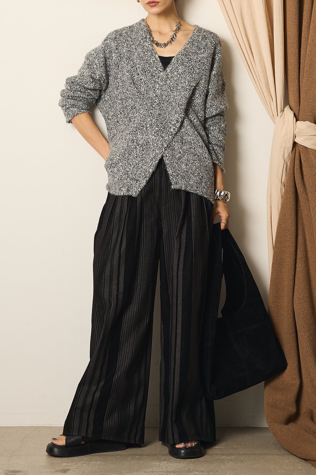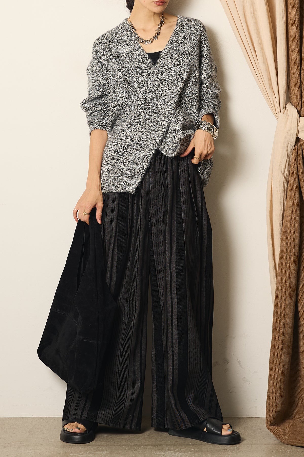 [SET]ヘアバンド付きクロスデザインミックスニットトップス+ランダムストライプ柄タックワイドパンツ(2set)