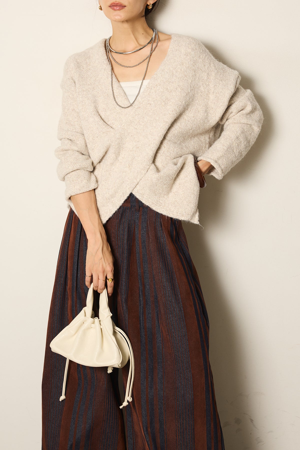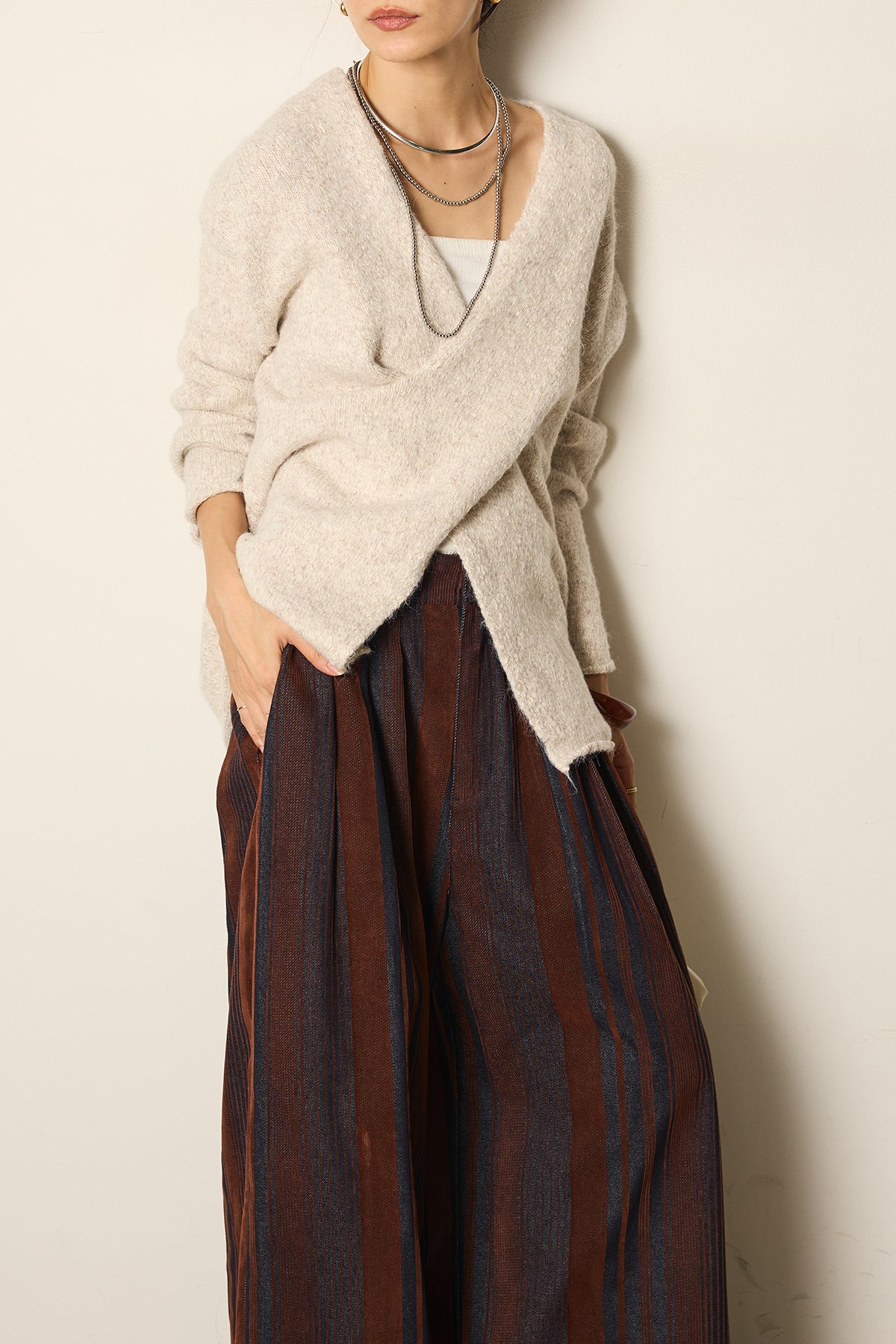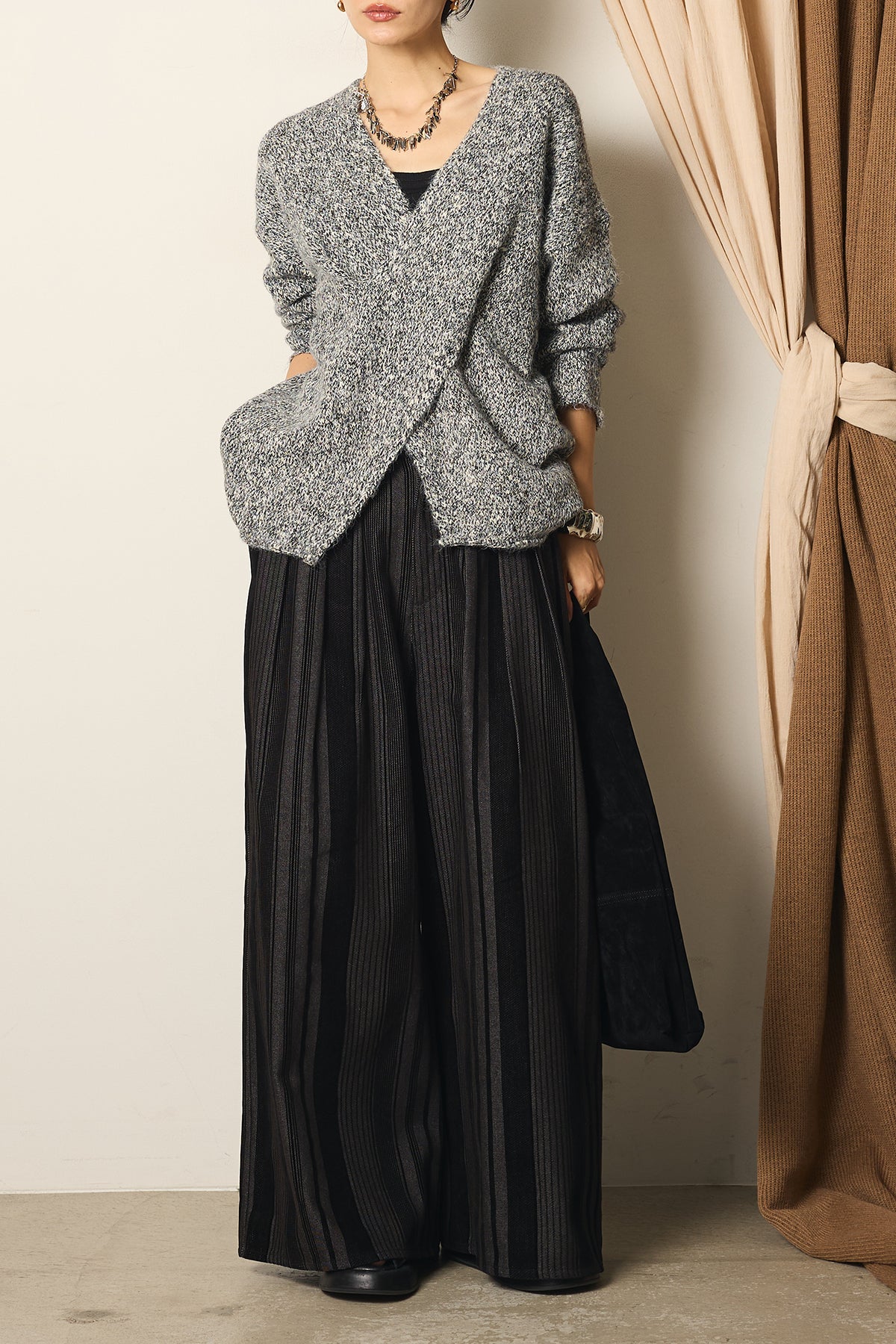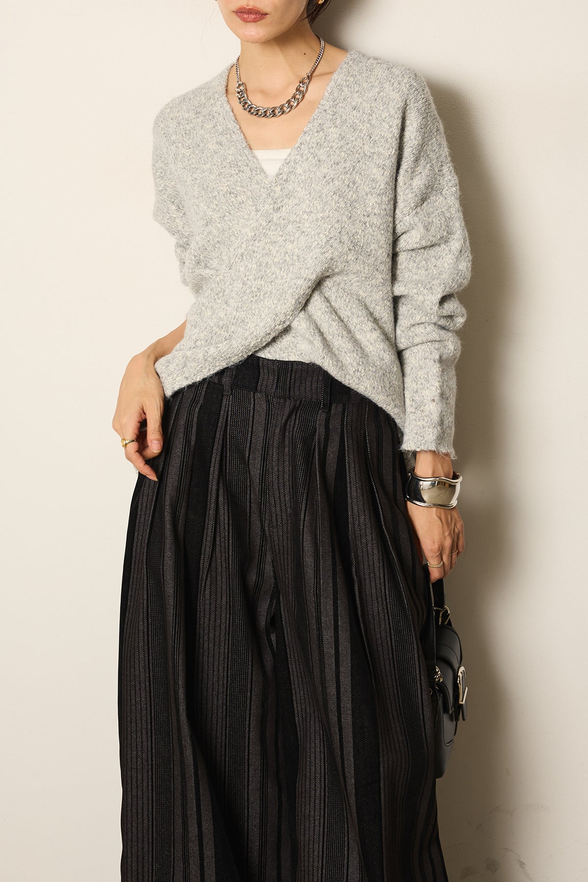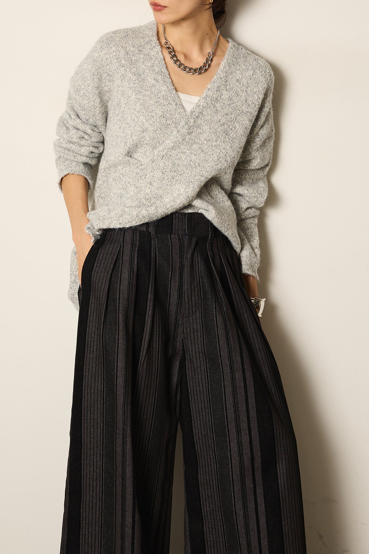 [SET]ヘアバンド付きクロスデザインミックスニットトップス+ランダムストライプ柄タックワイドパンツ(2set)