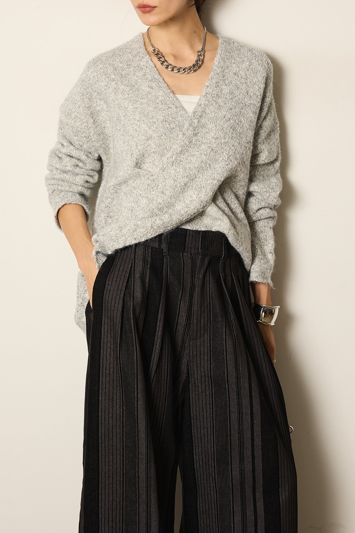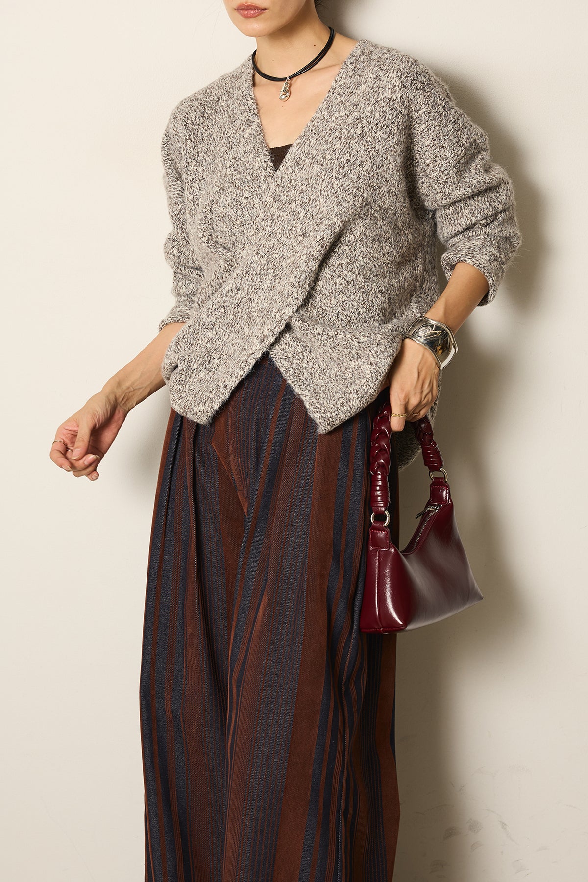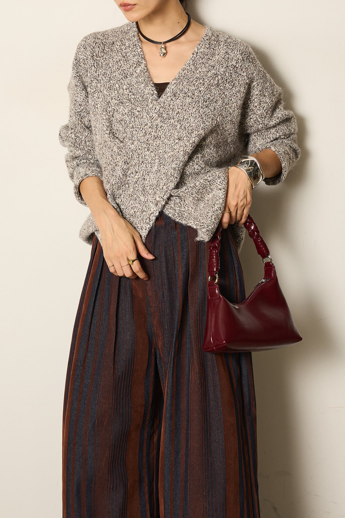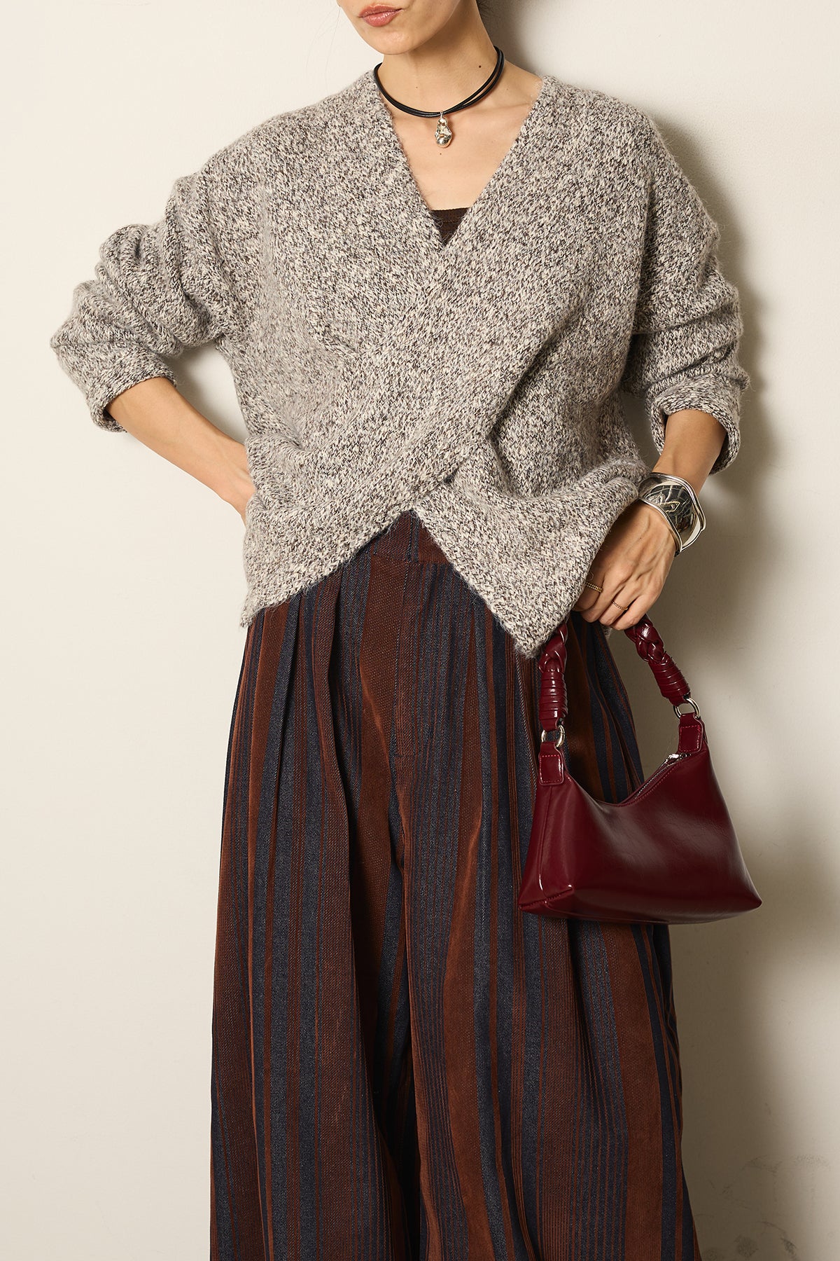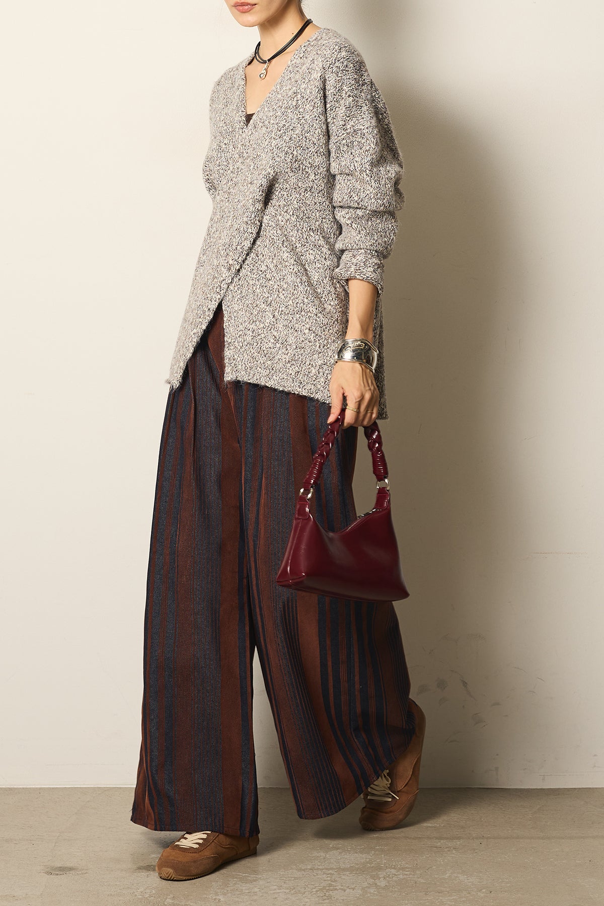 [SET]ヘアバンド付きクロスデザインミックスニットトップス+ランダムストライプ柄タックワイドパンツ(2set)