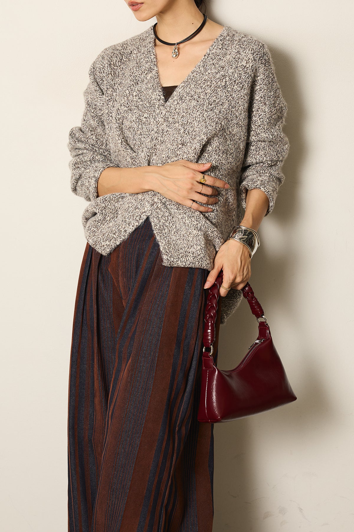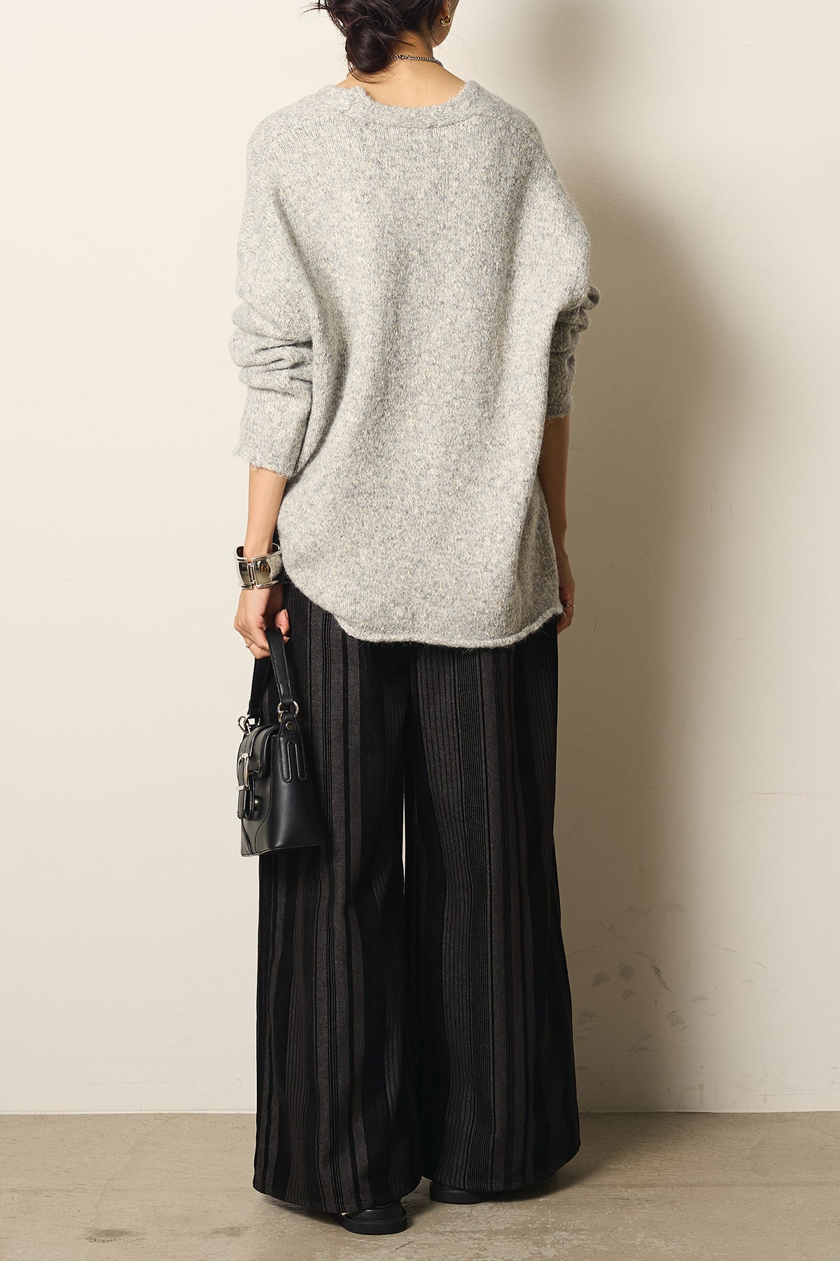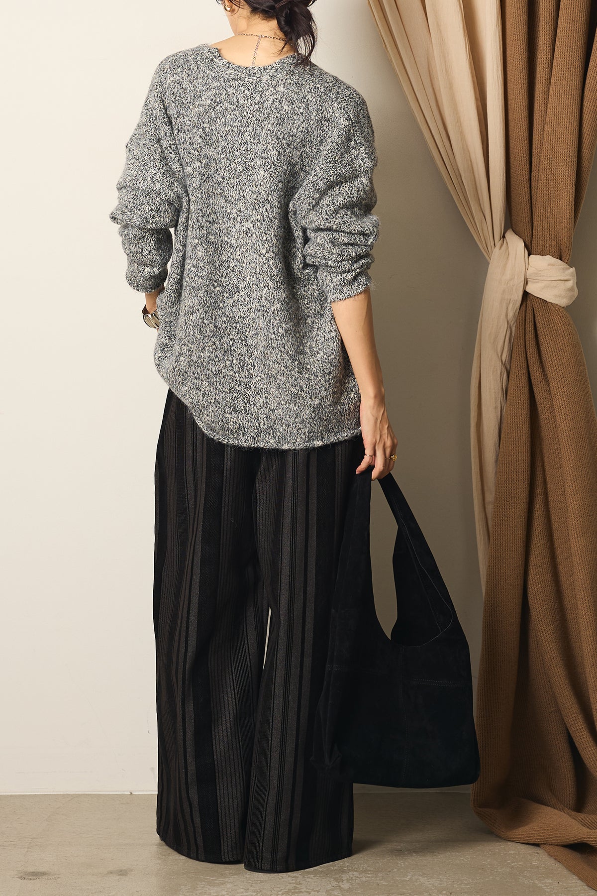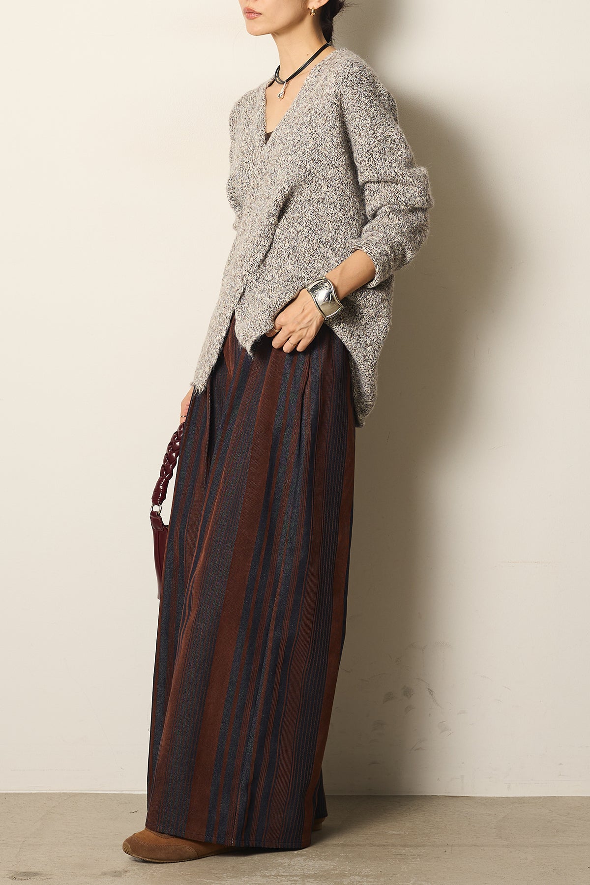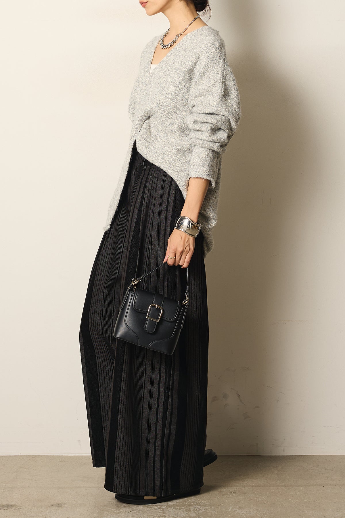 [SET]ヘアバンド付きクロスデザインミックスニットトップス+ランダムストライプ柄タックワイドパンツ(2set)