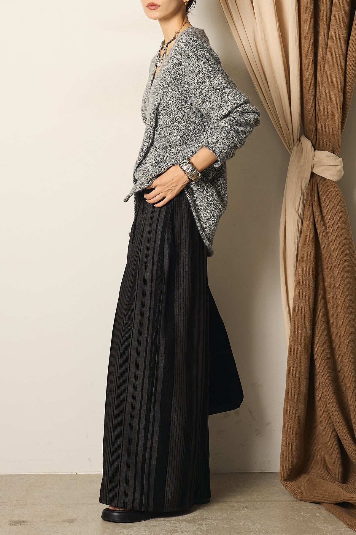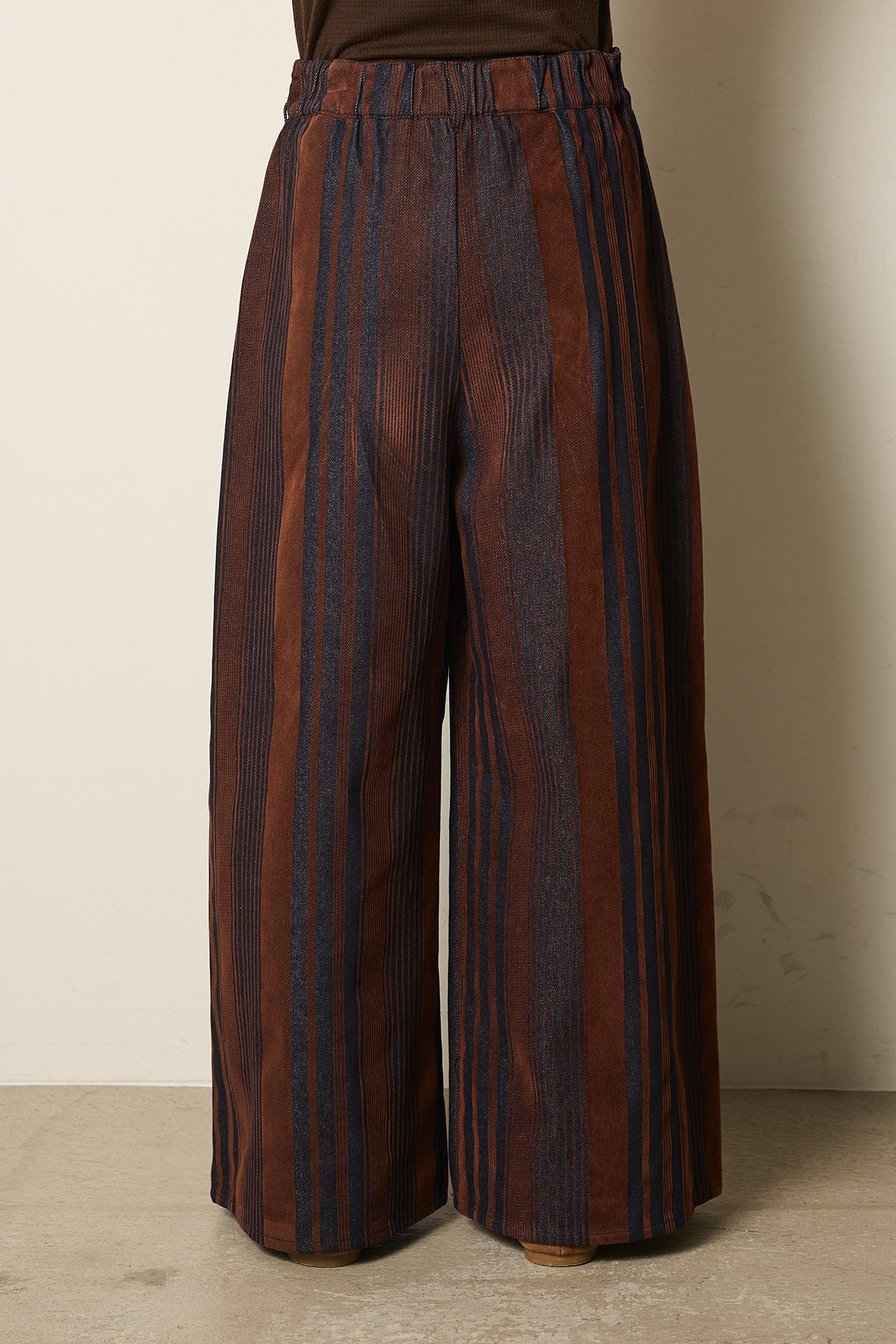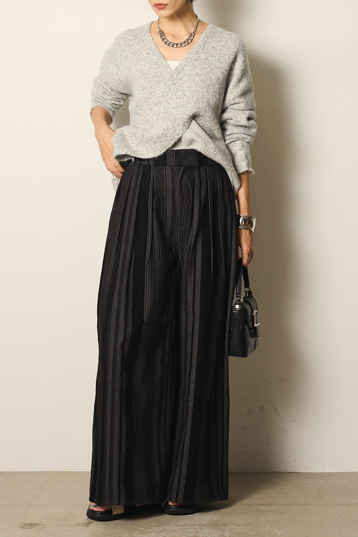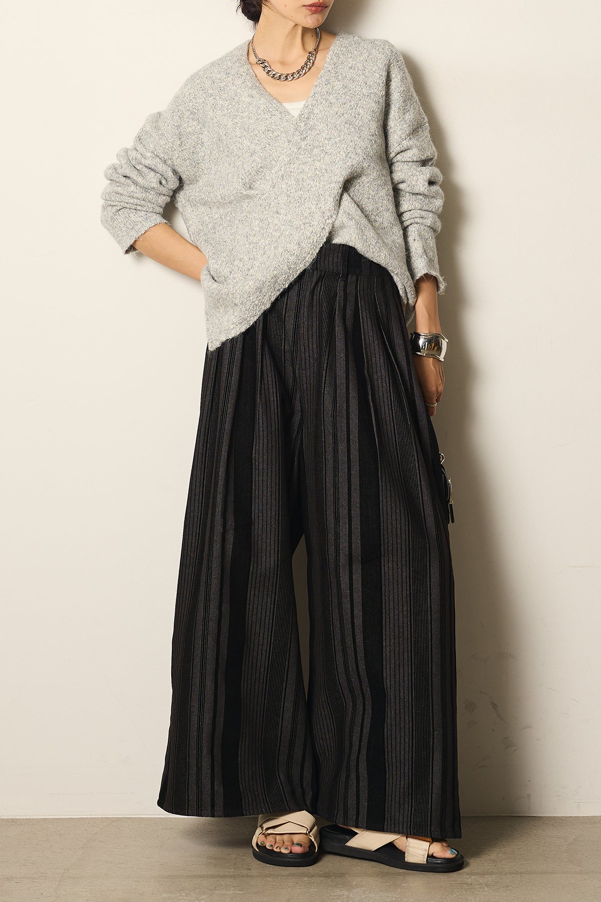 ランダムに配置されたストライプ柄が、動きのある表情を生み出すワイドパンツ。 フロントに深めのタックを入れることで、立体感のある美しいシルエットに仕上げました。 さらりとした落ち感のある素材が、上品さと抜け感を両立。 シンプルなトップスを合わせるだけで、スタイリングが決まる主役級の一本です。