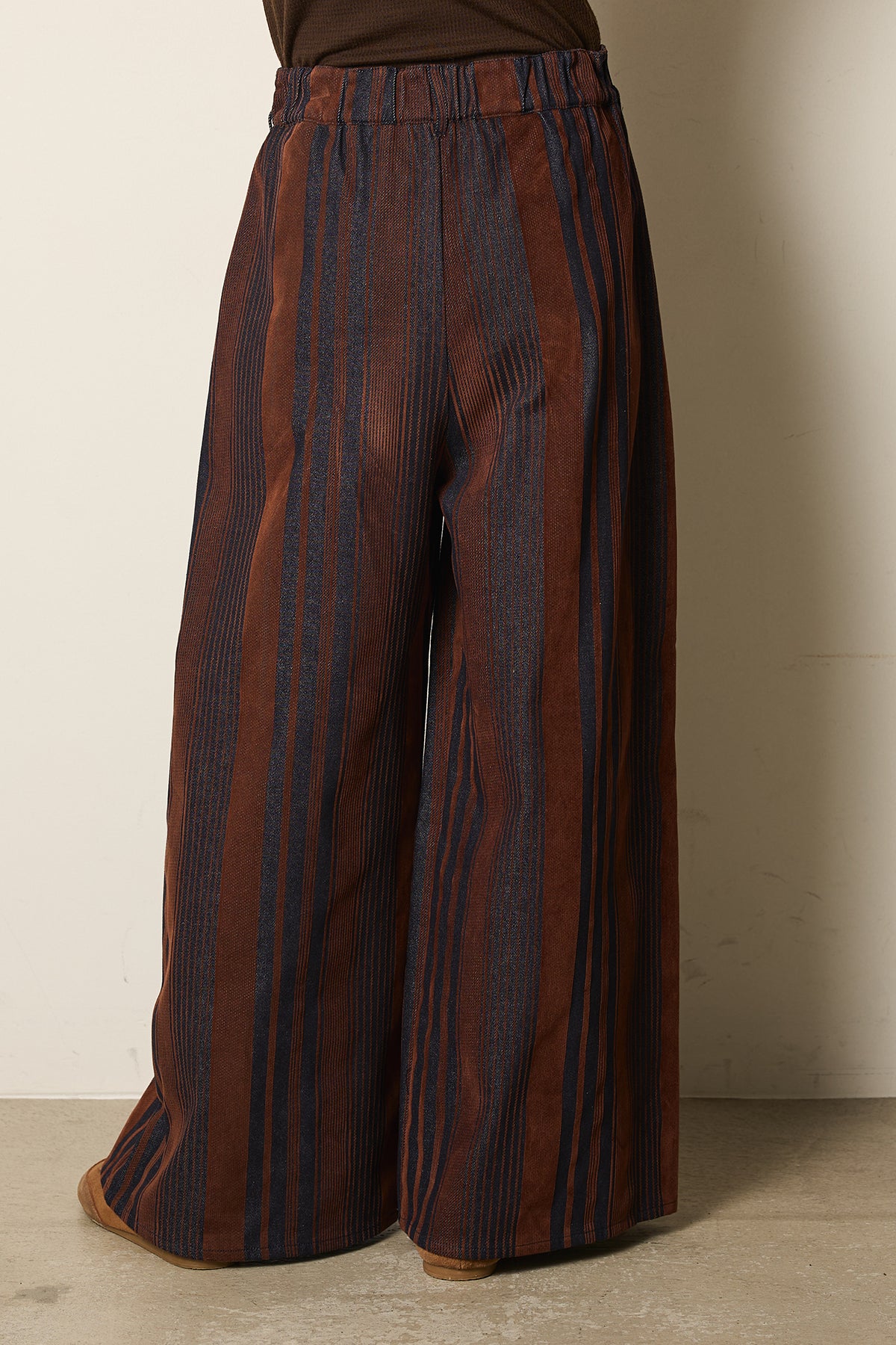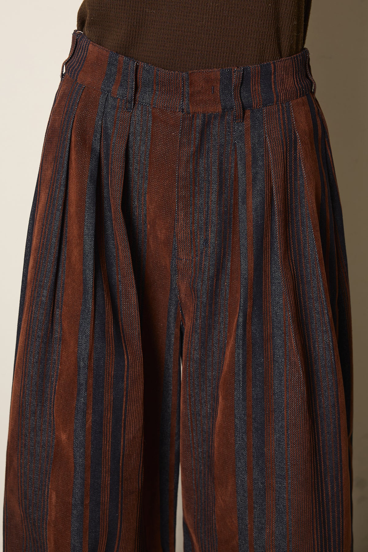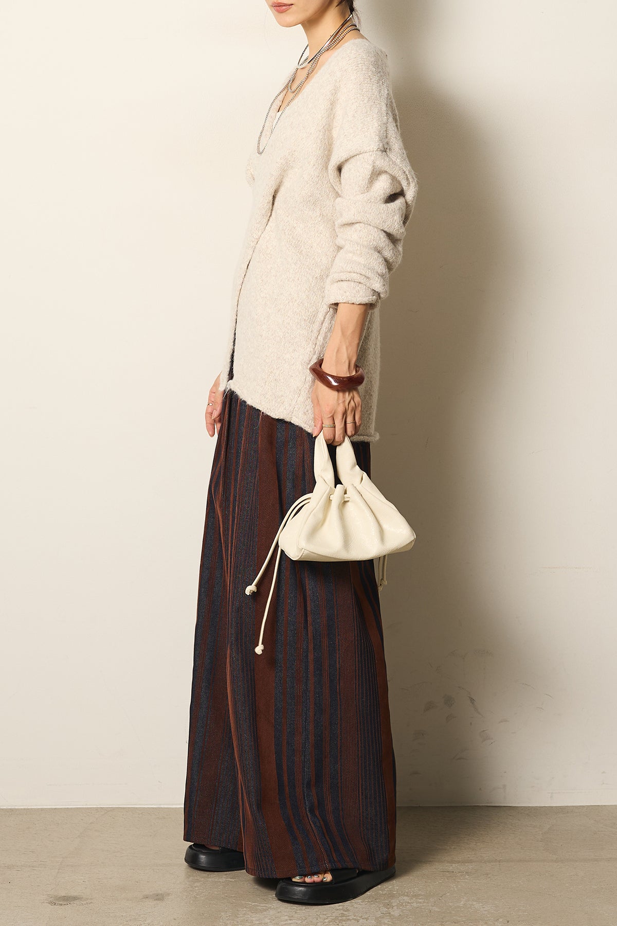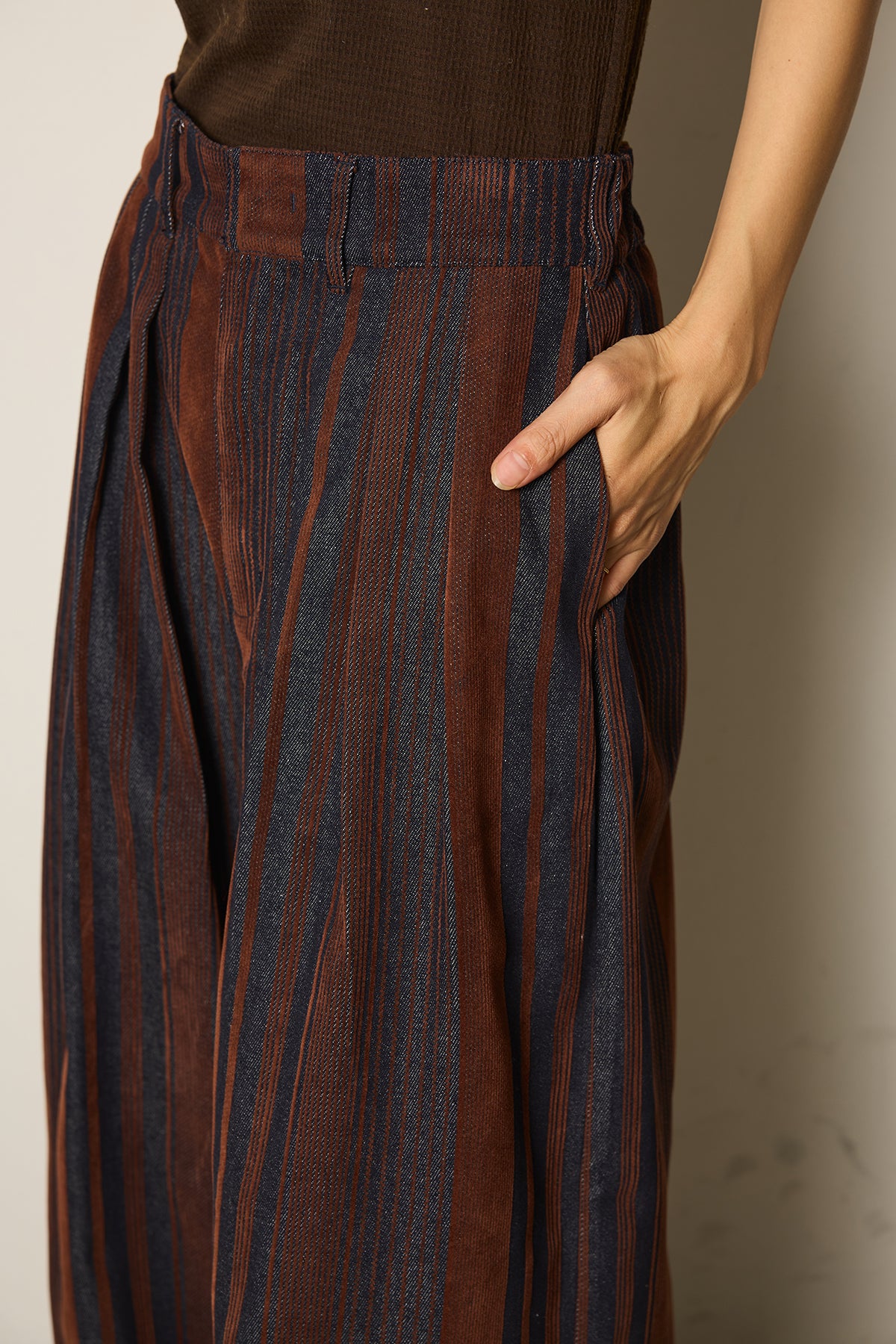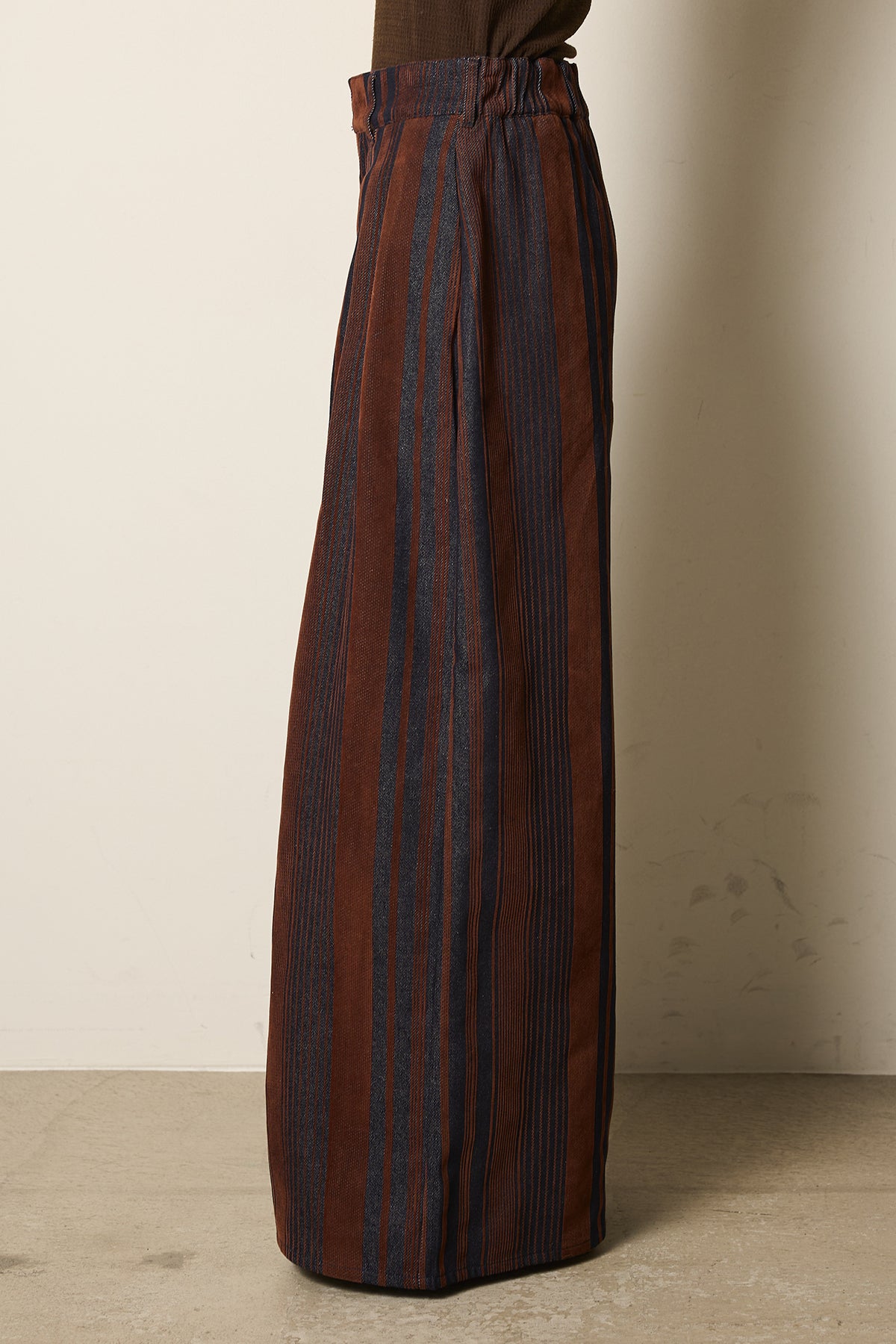 ランダムに配置されたストライプ柄が、動きのある表情を生み出すワイドパンツ。 フロントに深めのタックを入れることで、立体感のある美しいシルエットに仕上げました。 さらりとした落ち感のある素材が、上品さと抜け感を両立。 シンプルなトップスを合わせるだけで、スタイリングが決まる主役級の一本です。