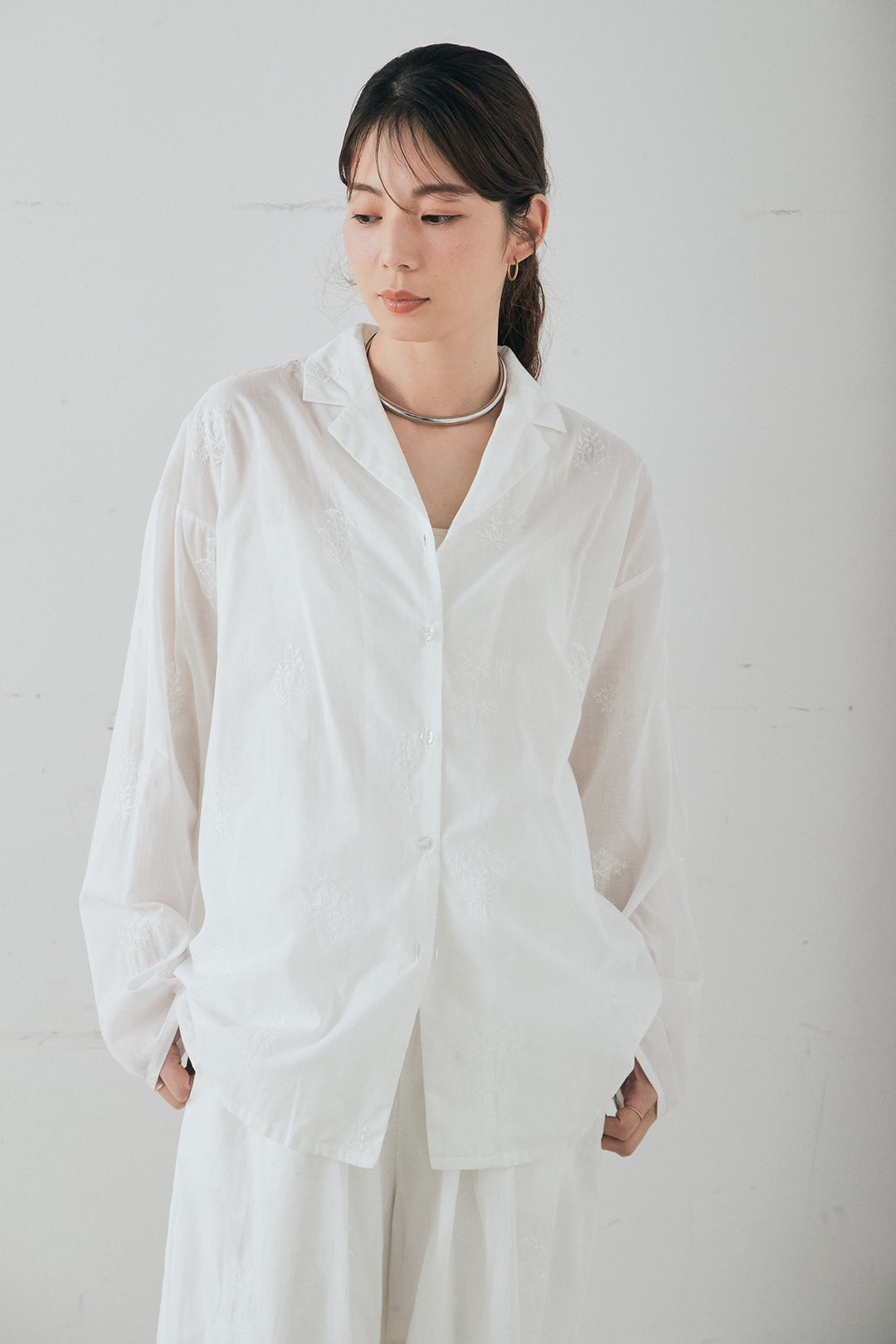 刺繍ローンオープンカラーシャツ