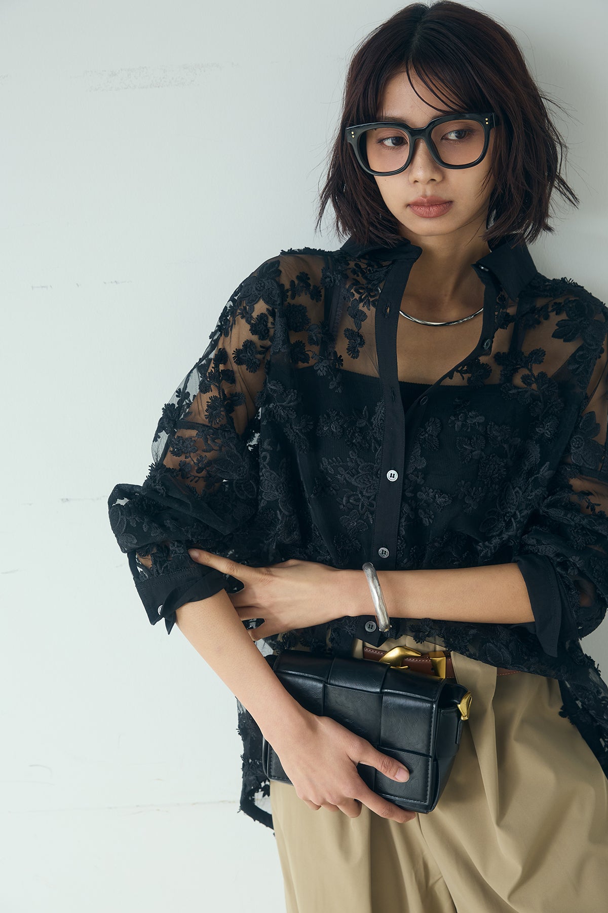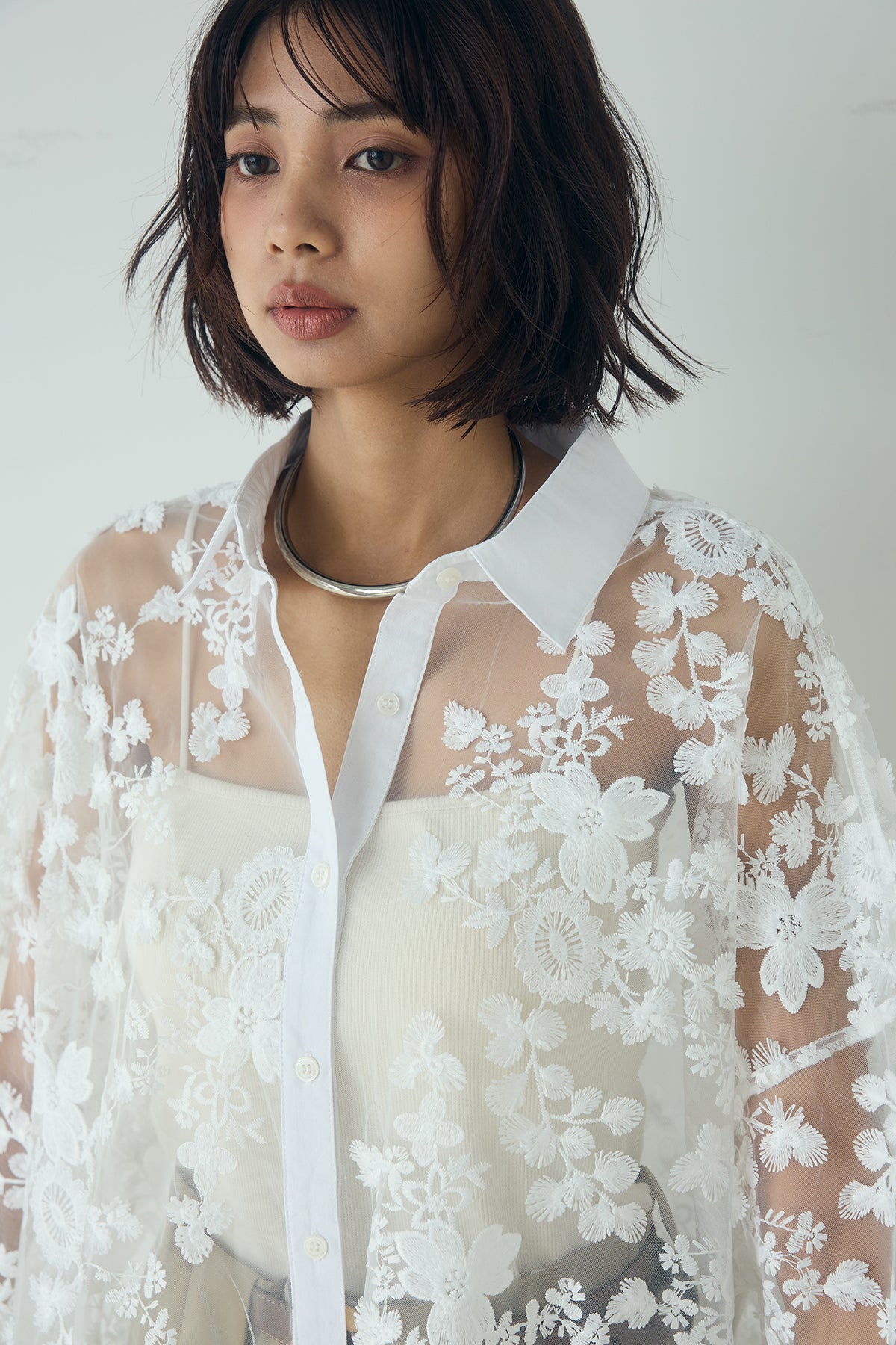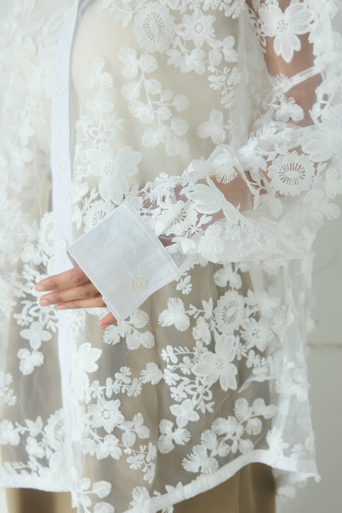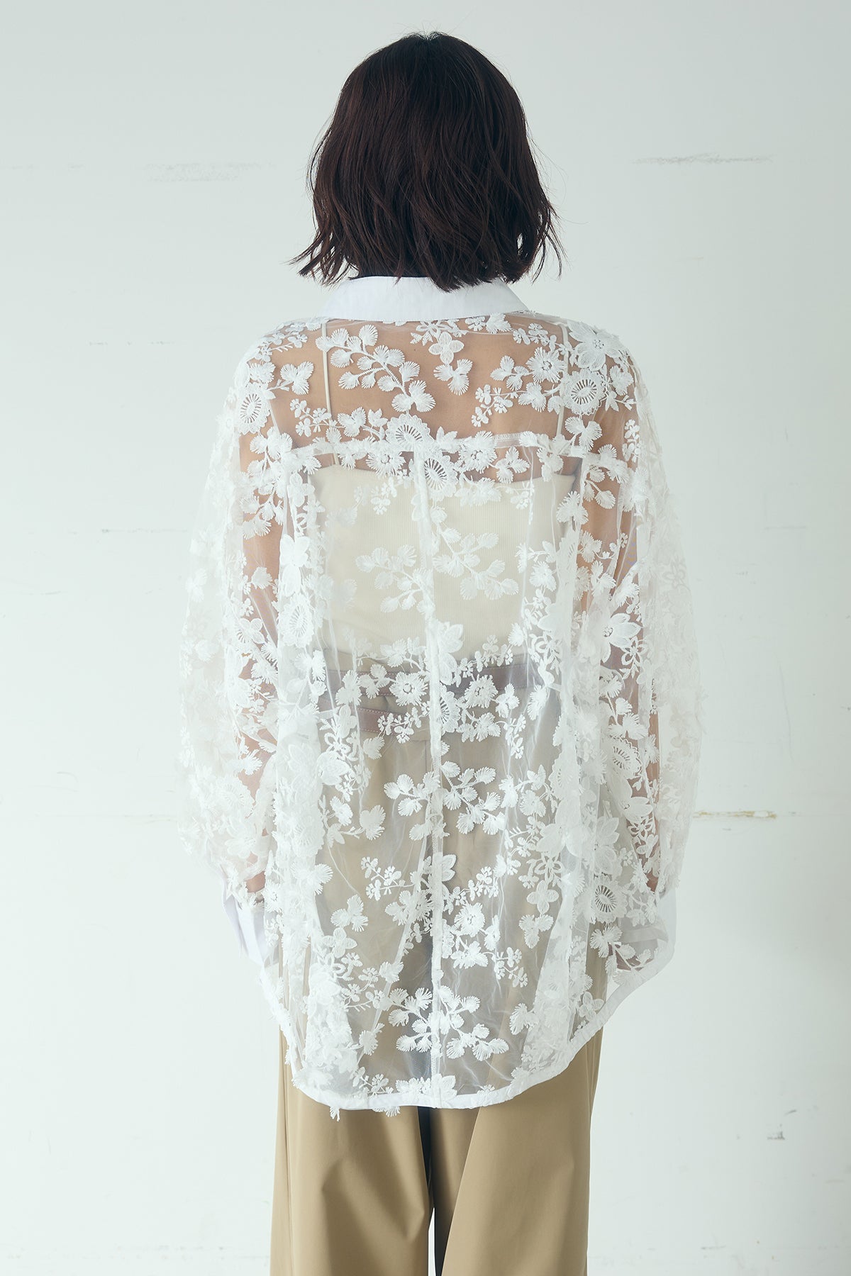 立体的にあしらわれたフラワー刺繍が目を惹く、華やかな印象のレースシャツ。 繊細なシアー素材に立体感のある刺繍を重ねることで、奥行きのある表情を生み出し、スタイリングに上品なアクセントを添えてくれる一着です。 全体に広がるフラワーモチーフの刺繍が、柔らかく女性らしい雰囲気を演出。 透け感のある素材が軽やかな抜け感を生み出し、シンプルなコーディネートをぐっと洗練された印象に仕上げます。 程よくゆとりのあるシルエットで、キャミソールやタンクトップの上からさらっと羽織るだけでこなれたスタイリングが完成。 ボタンを閉じてシャツとして着るのはもちろん、軽い羽織りとしても活躍します。 デニムやスラックス、スカートなど幅広いボトムスと合わせやすく、レイヤードスタイルも楽しめるアイテム。 シンプルなスタイリングに遊び心をプラスし、都会的でこなれたムードを演出してくれる主役級のアイテムです。