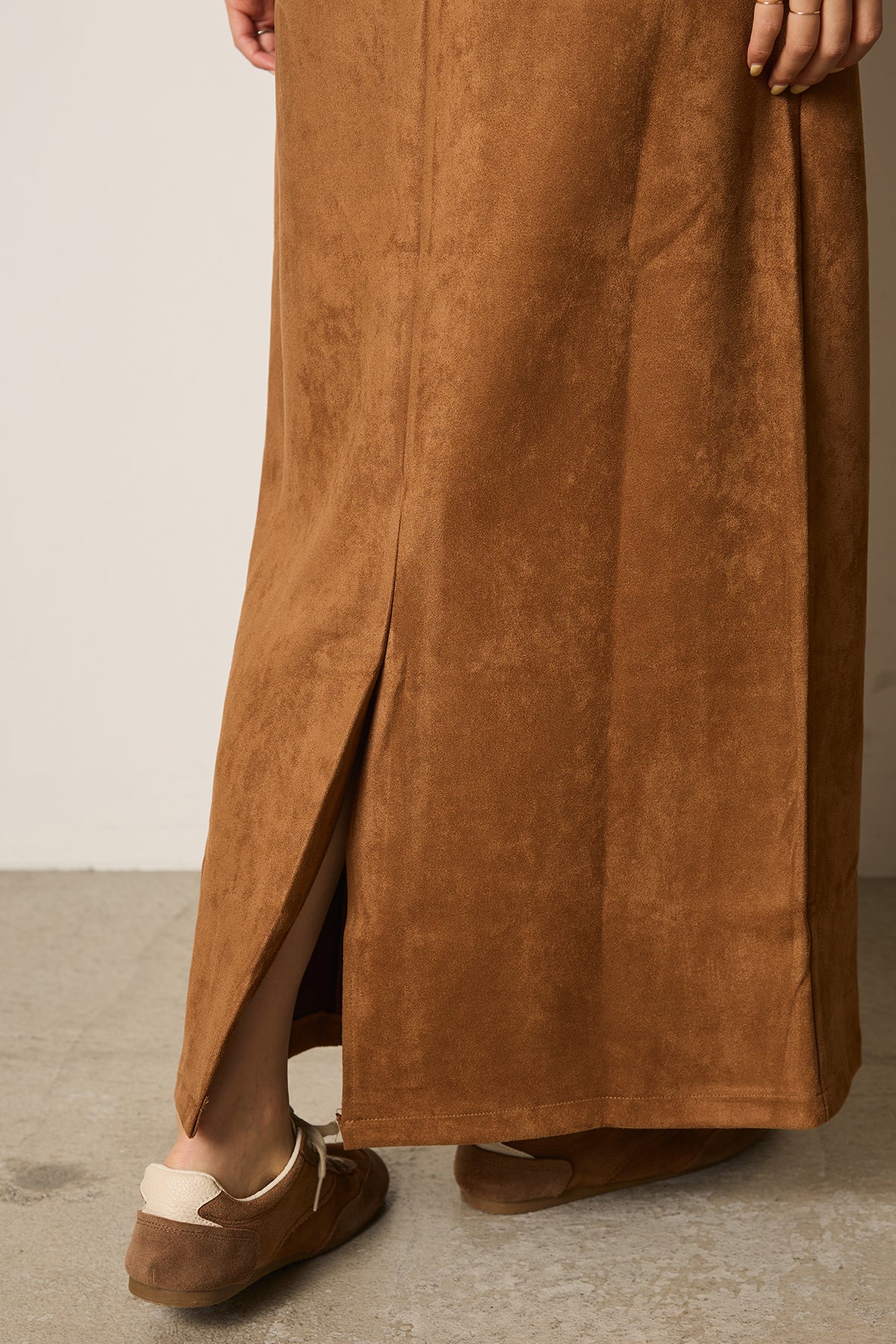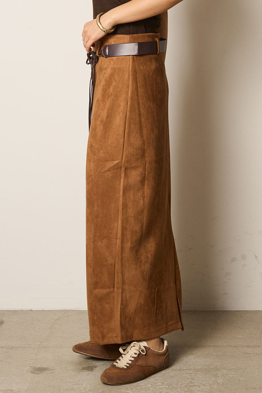 柔らかなフェイクスウェード素材を使用したワイドスカート。付属のベルトがウエストラインを引き締め、シンプルながらもこなれ感のあるスタイルに仕上げます。上品な質感と落ち感のあるシルエットで、ニットやブラウスとも好相性。秋冬のコーディネートに取り入れやすい一枚です。