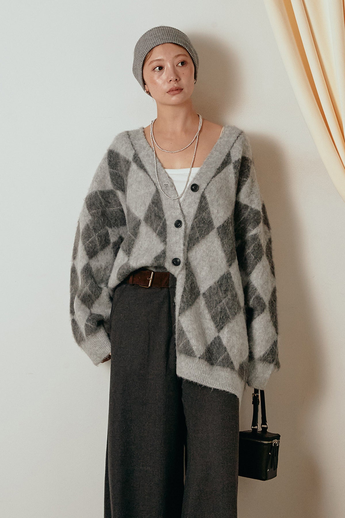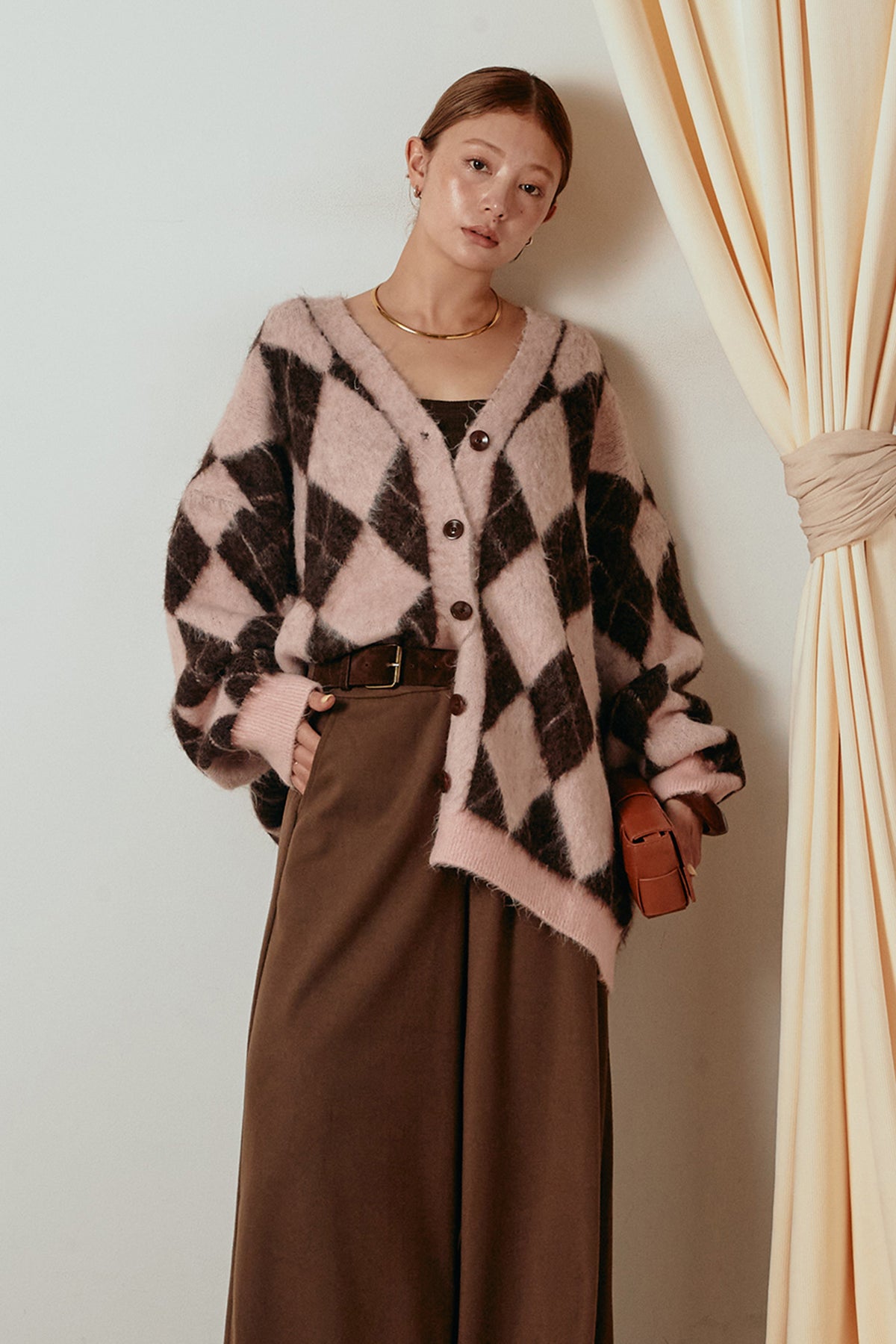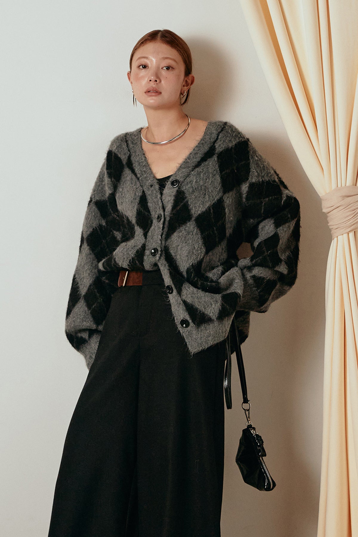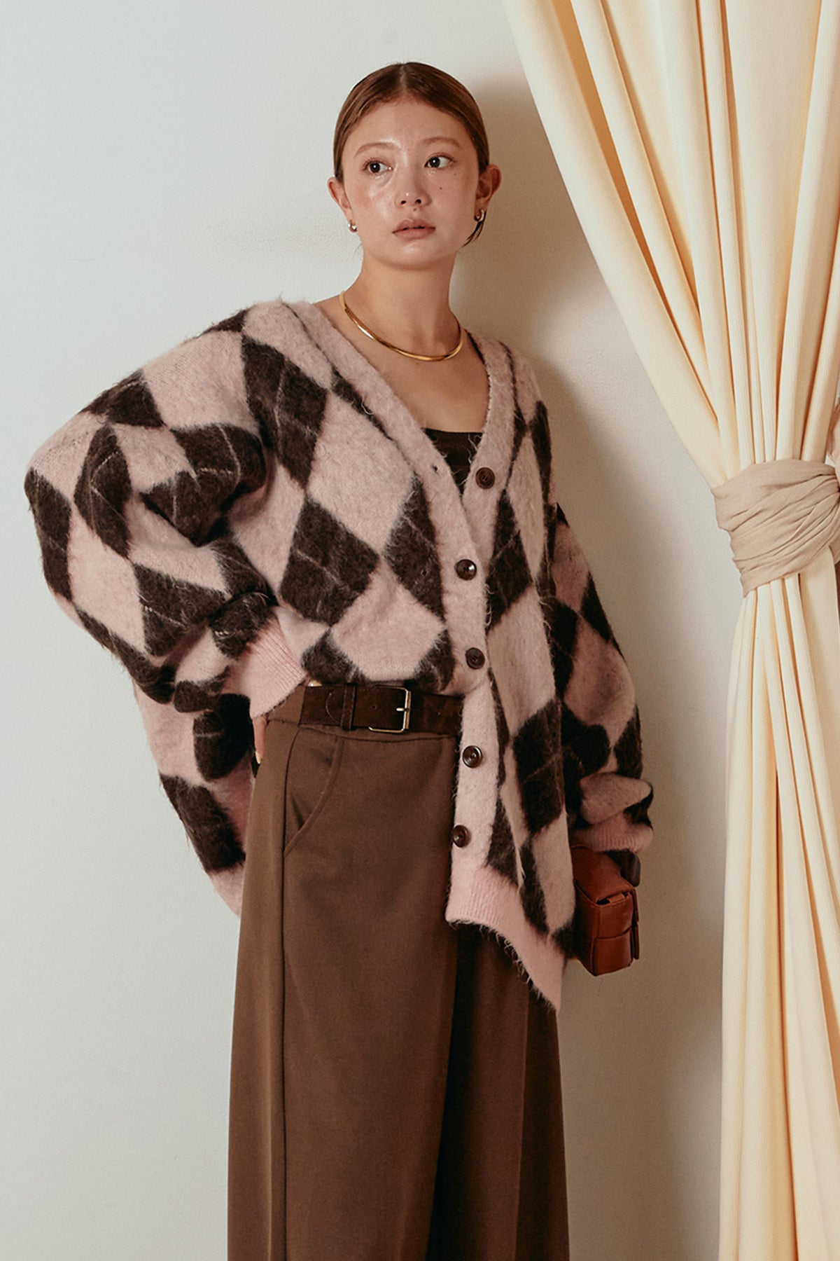 ふんわりとした起毛感が魅力のアーガイル柄ニットカーディガン。ゆとりのあるシルエットが抜け感を生み、羽織るだけでこなれた印象に仕上がります。大きめのダイヤ柄が存在感を放ち、シンプルなボトムスと合わせてもスタイリングが決まる一枚。秋冬の主役ニットとしておすすめです。