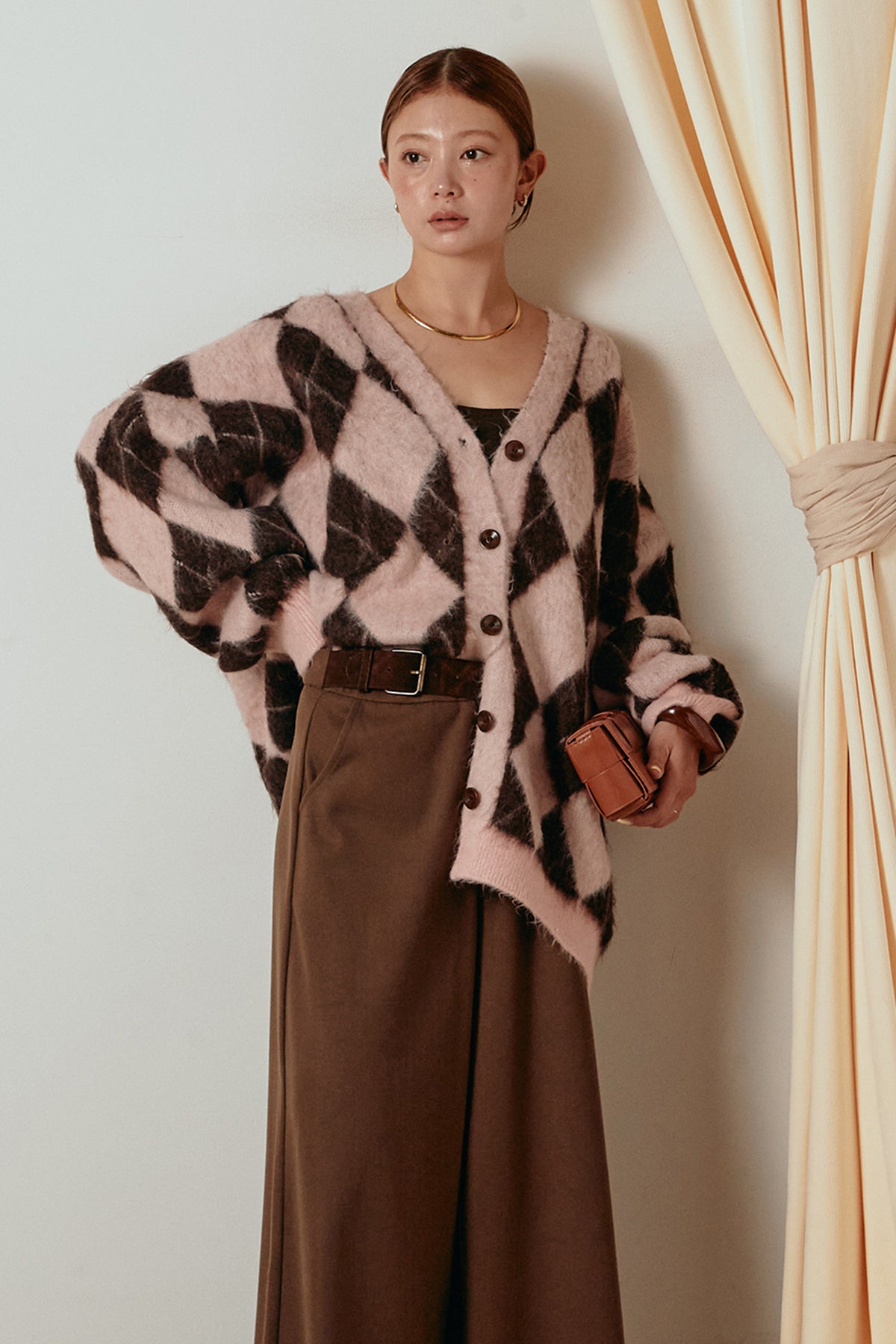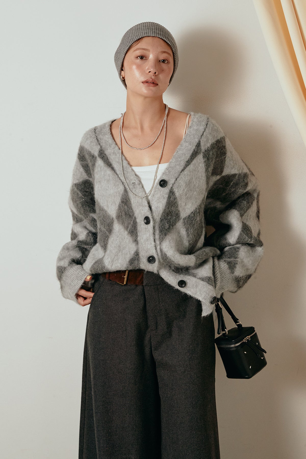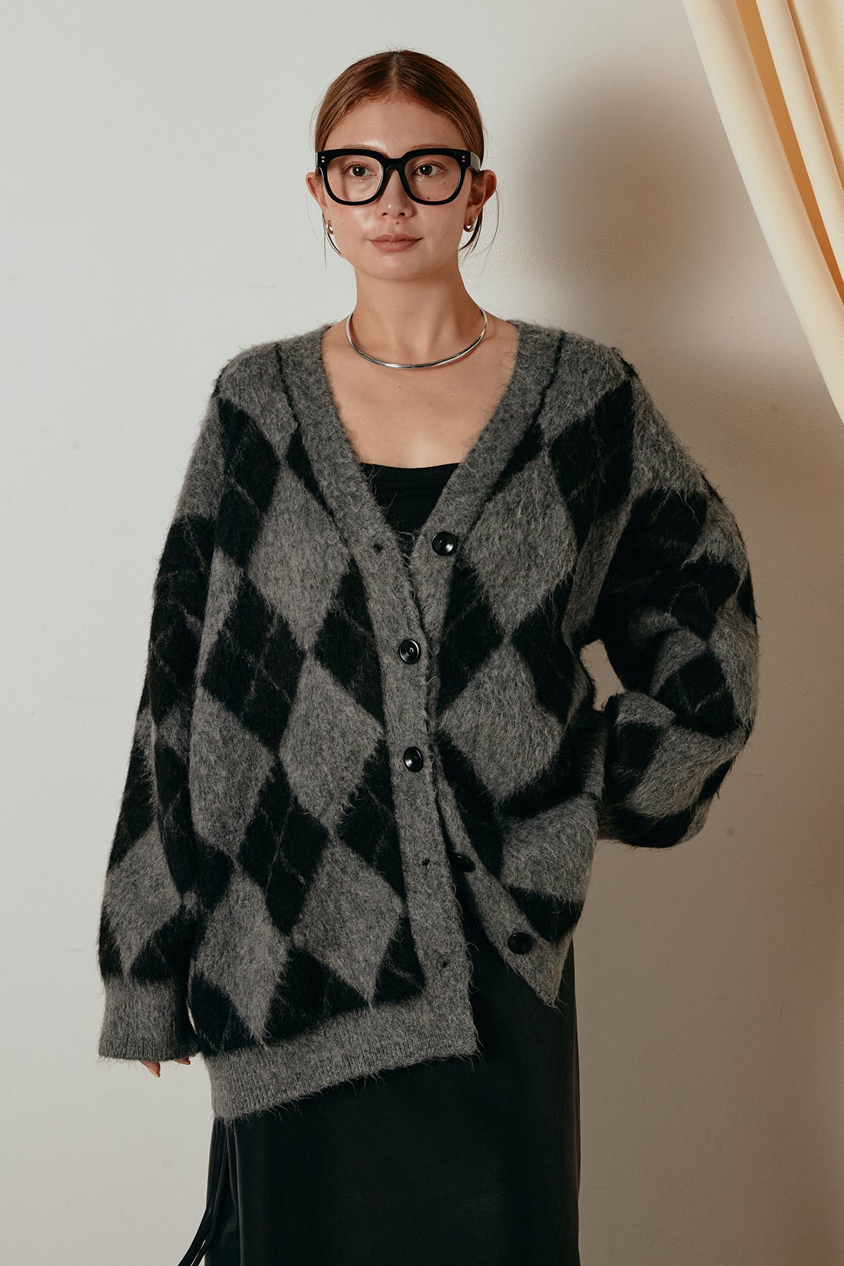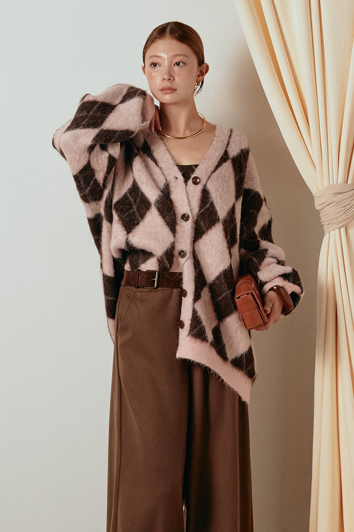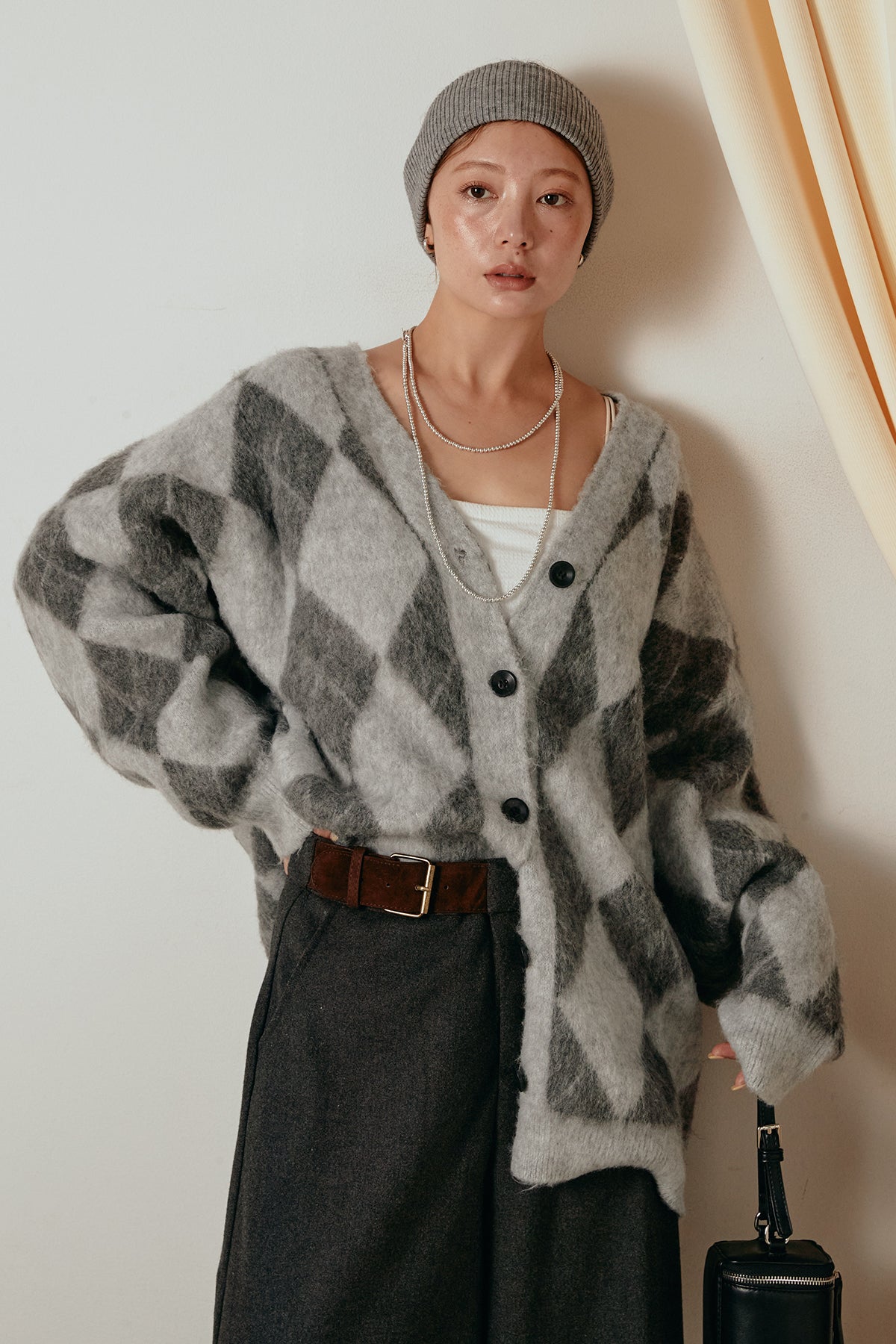 ふんわりとした起毛感が魅力のアーガイル柄ニットカーディガン。ゆとりのあるシルエットが抜け感を生み、羽織るだけでこなれた印象に仕上がります。大きめのダイヤ柄が存在感を放ち、シンプルなボトムスと合わせてもスタイリングが決まる一枚。秋冬の主役ニットとしておすすめです。