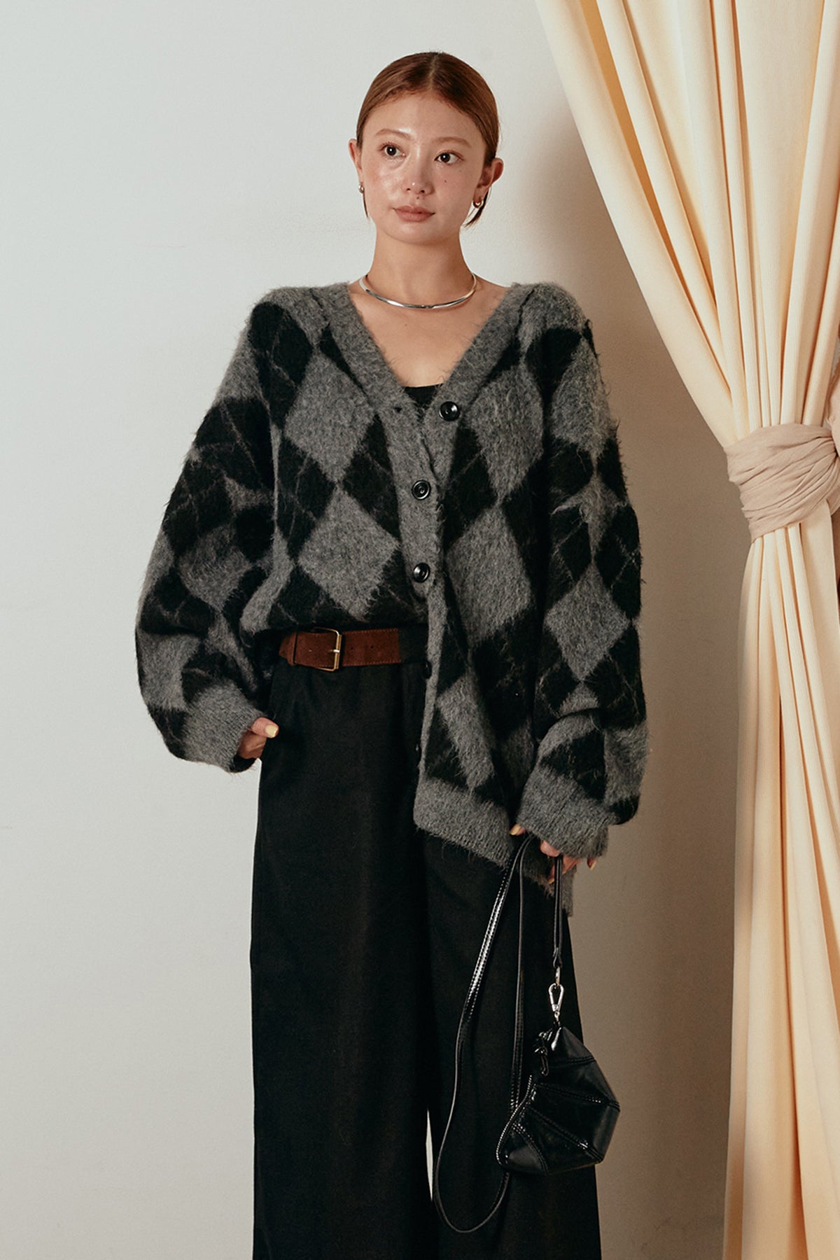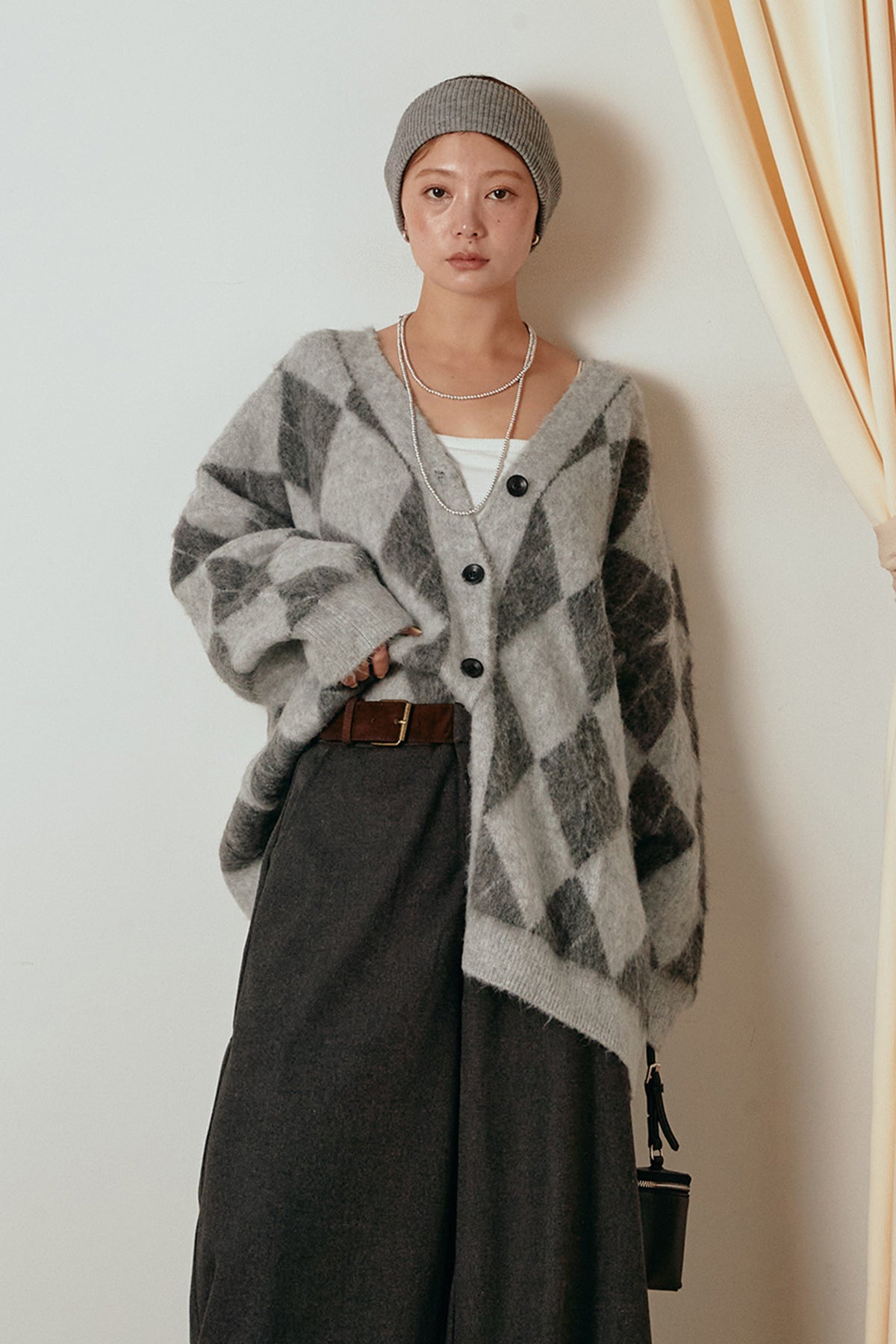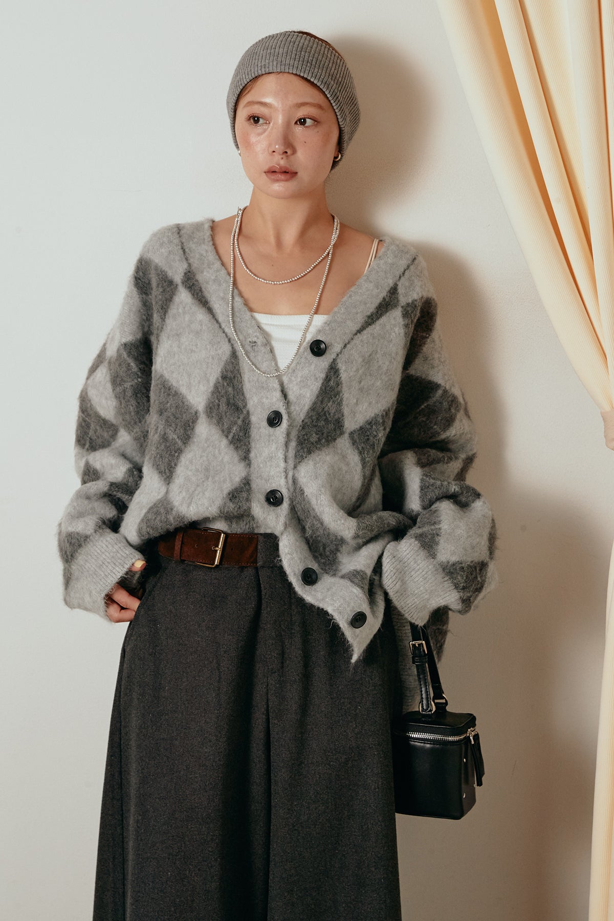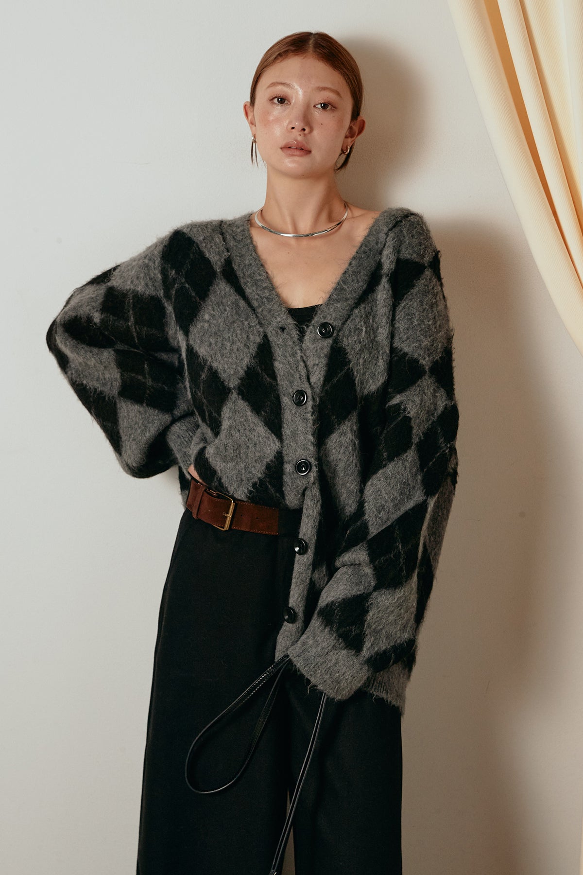 ふんわりとした起毛感が魅力のアーガイル柄ニットカーディガン。ゆとりのあるシルエットが抜け感を生み、羽織るだけでこなれた印象に仕上がります。大きめのダイヤ柄が存在感を放ち、シンプルなボトムスと合わせてもスタイリングが決まる一枚。秋冬の主役ニットとしておすすめです。