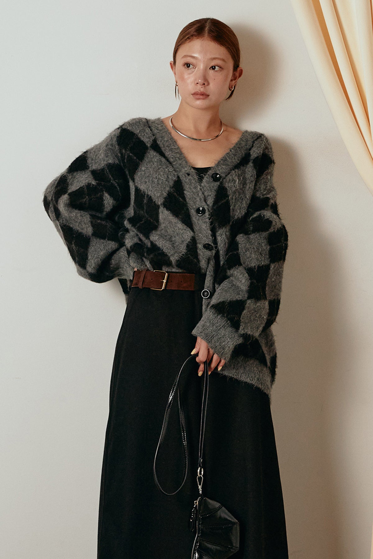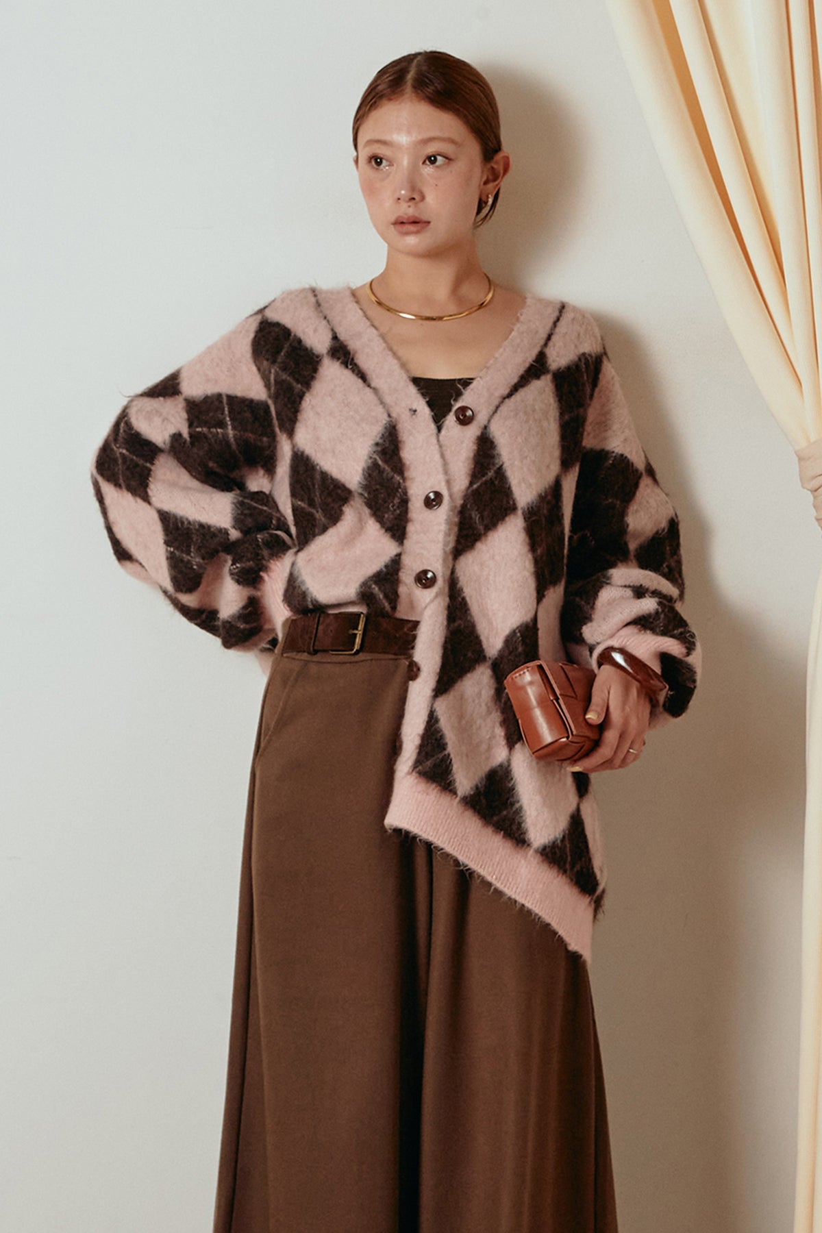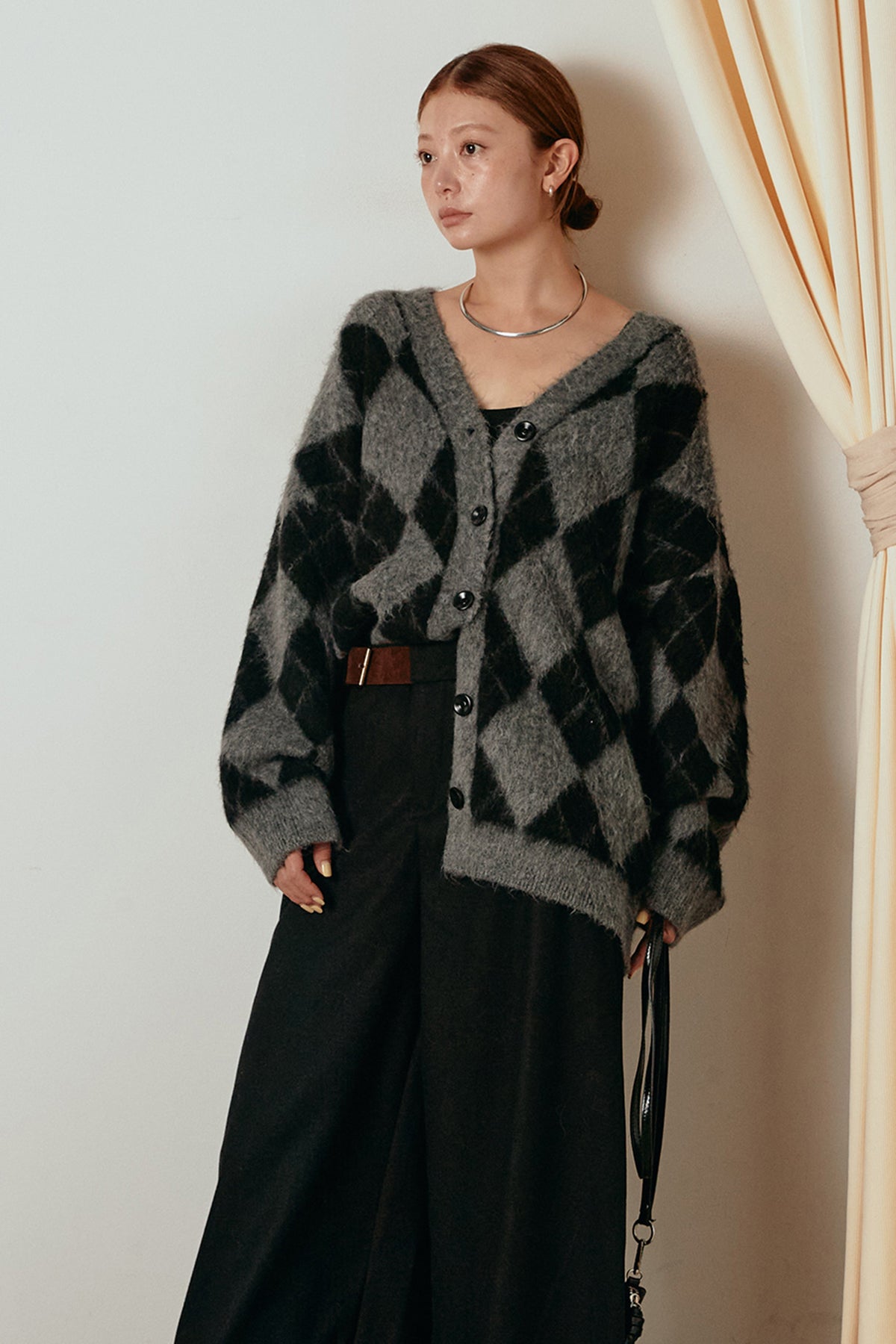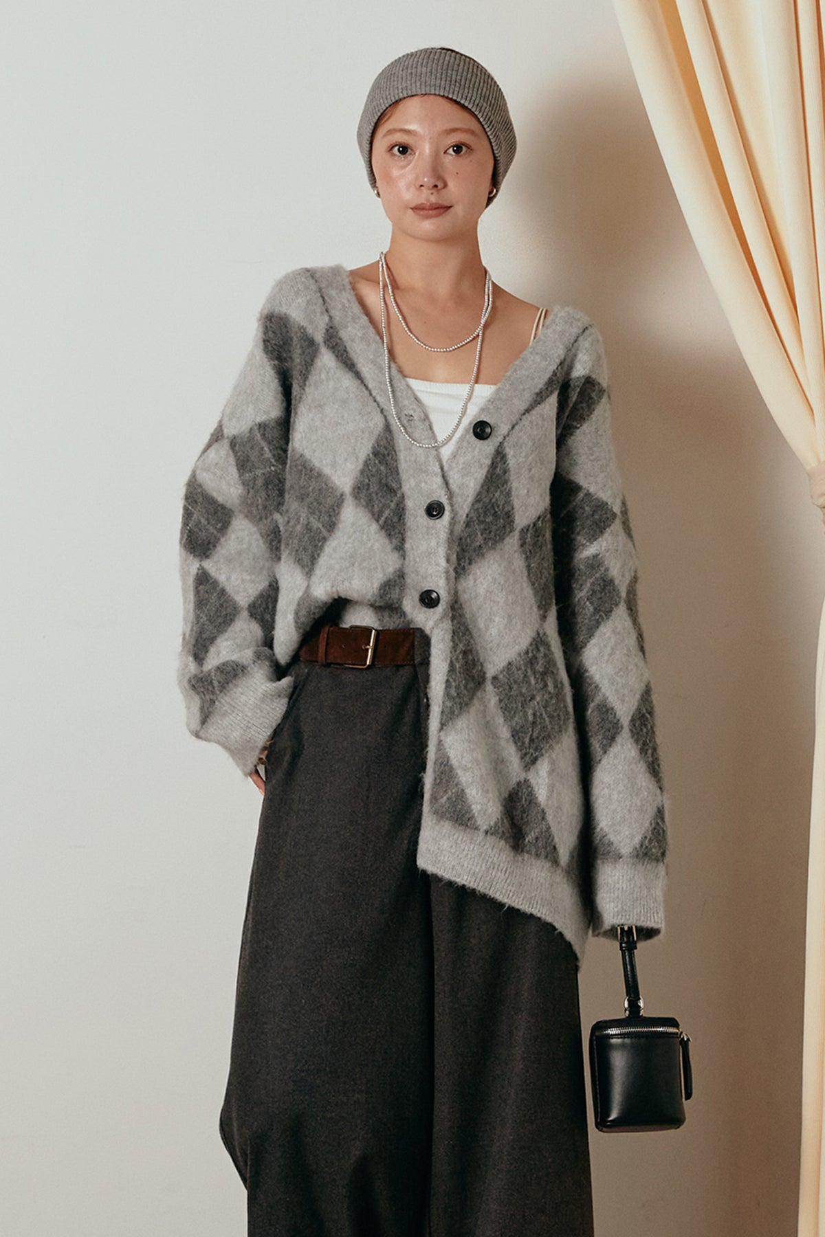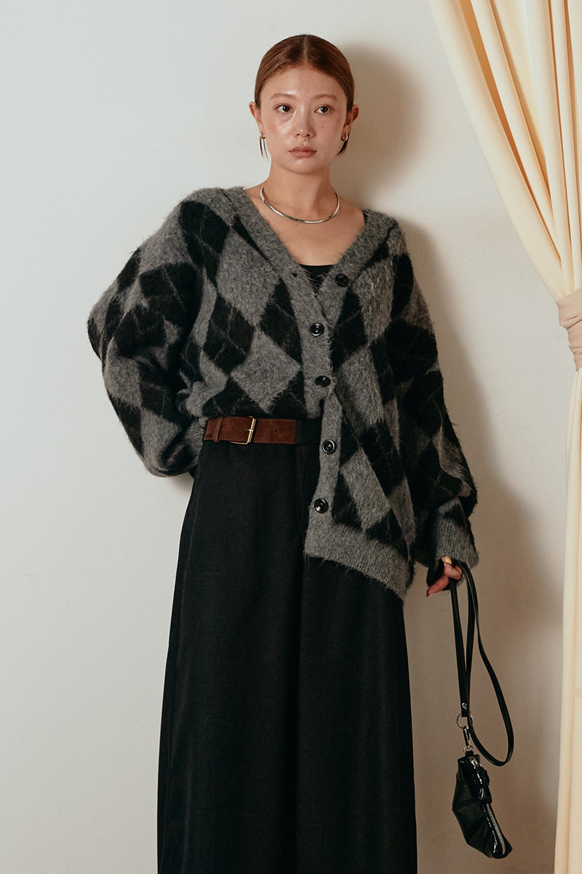 ふんわりとした起毛感が魅力のアーガイル柄ニットカーディガン。ゆとりのあるシルエットが抜け感を生み、羽織るだけでこなれた印象に仕上がります。大きめのダイヤ柄が存在感を放ち、シンプルなボトムスと合わせてもスタイリングが決まる一枚。秋冬の主役ニットとしておすすめです。