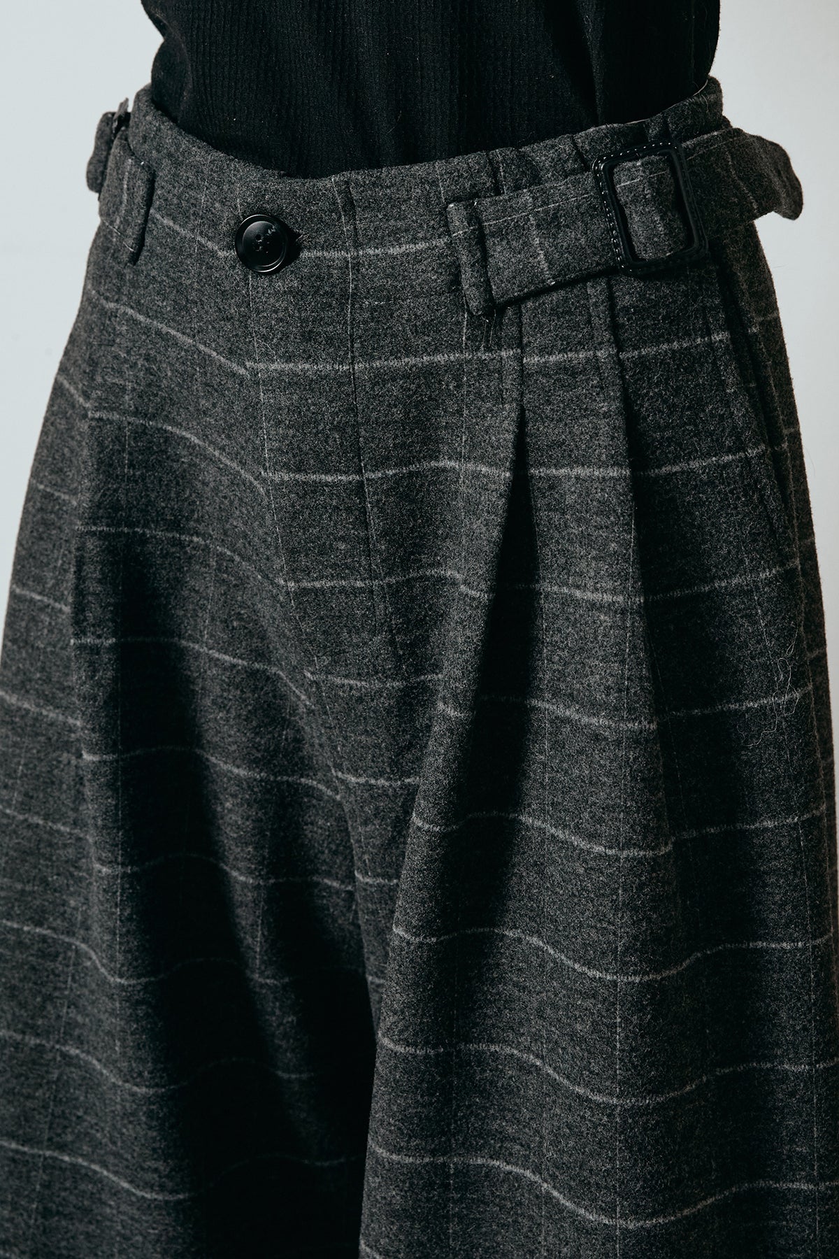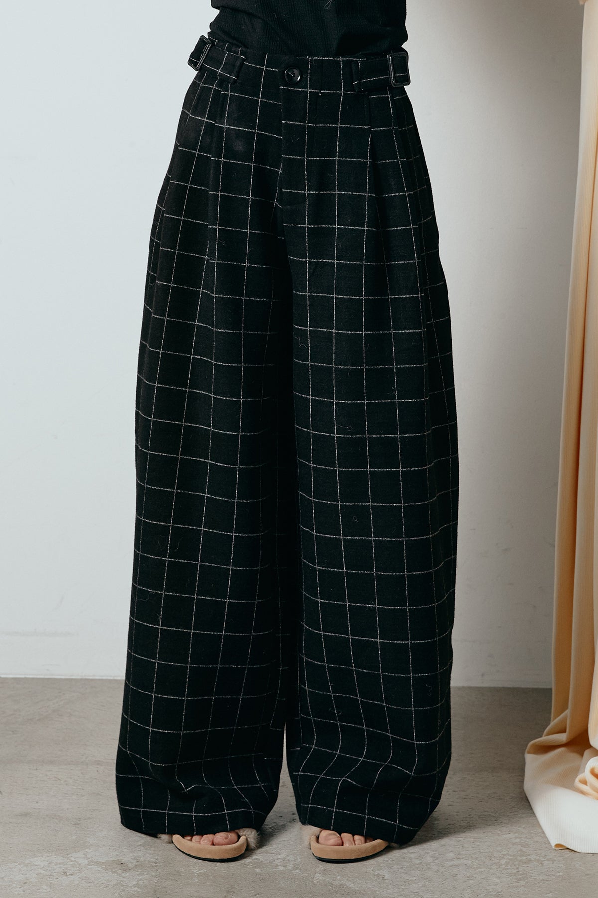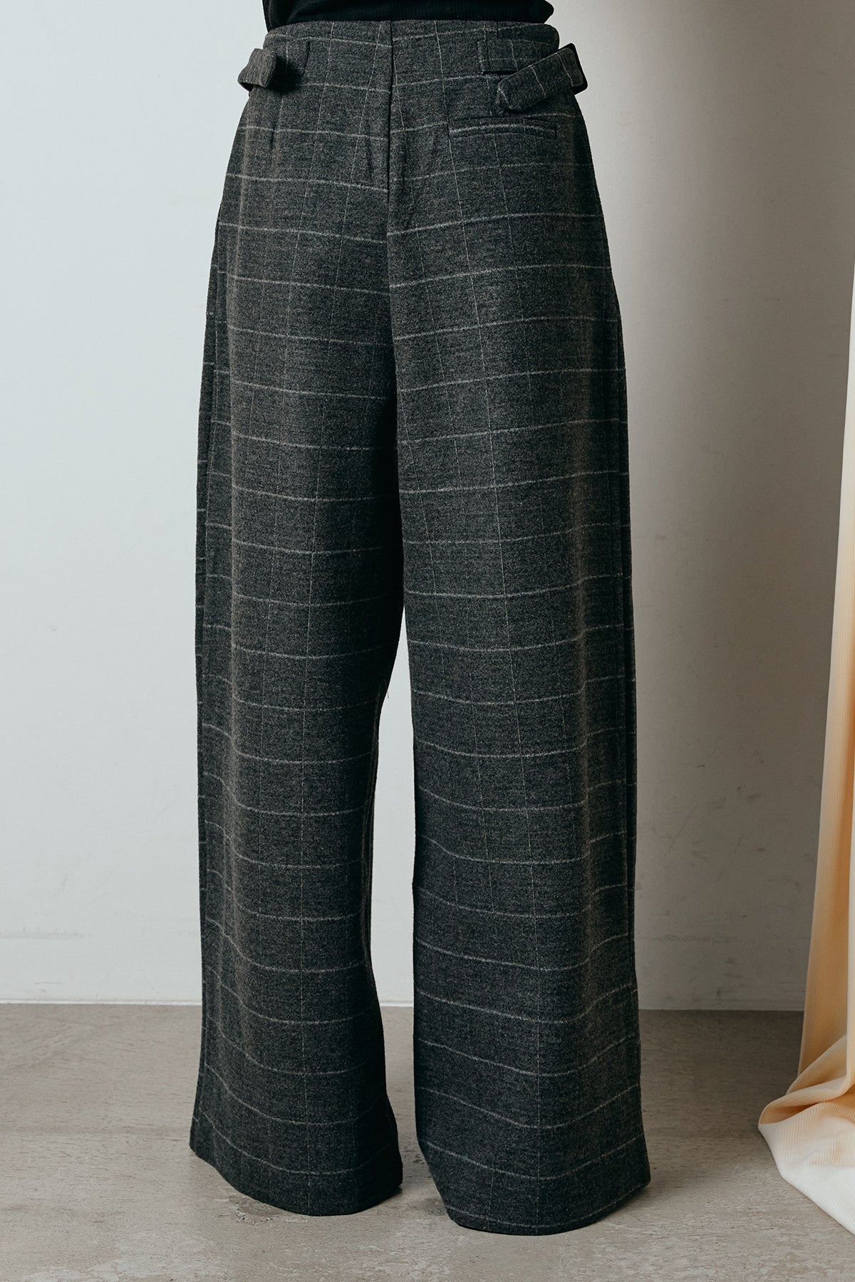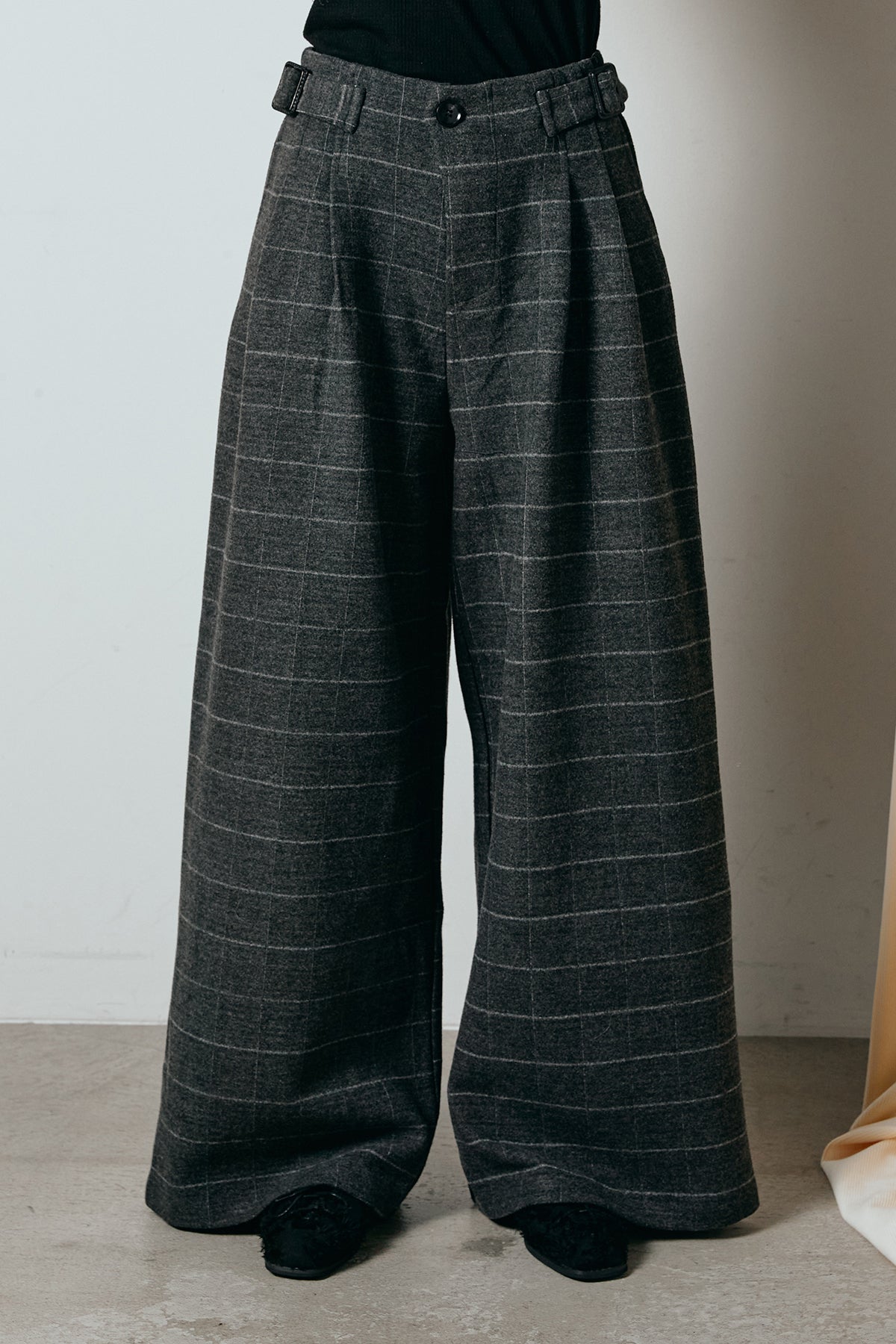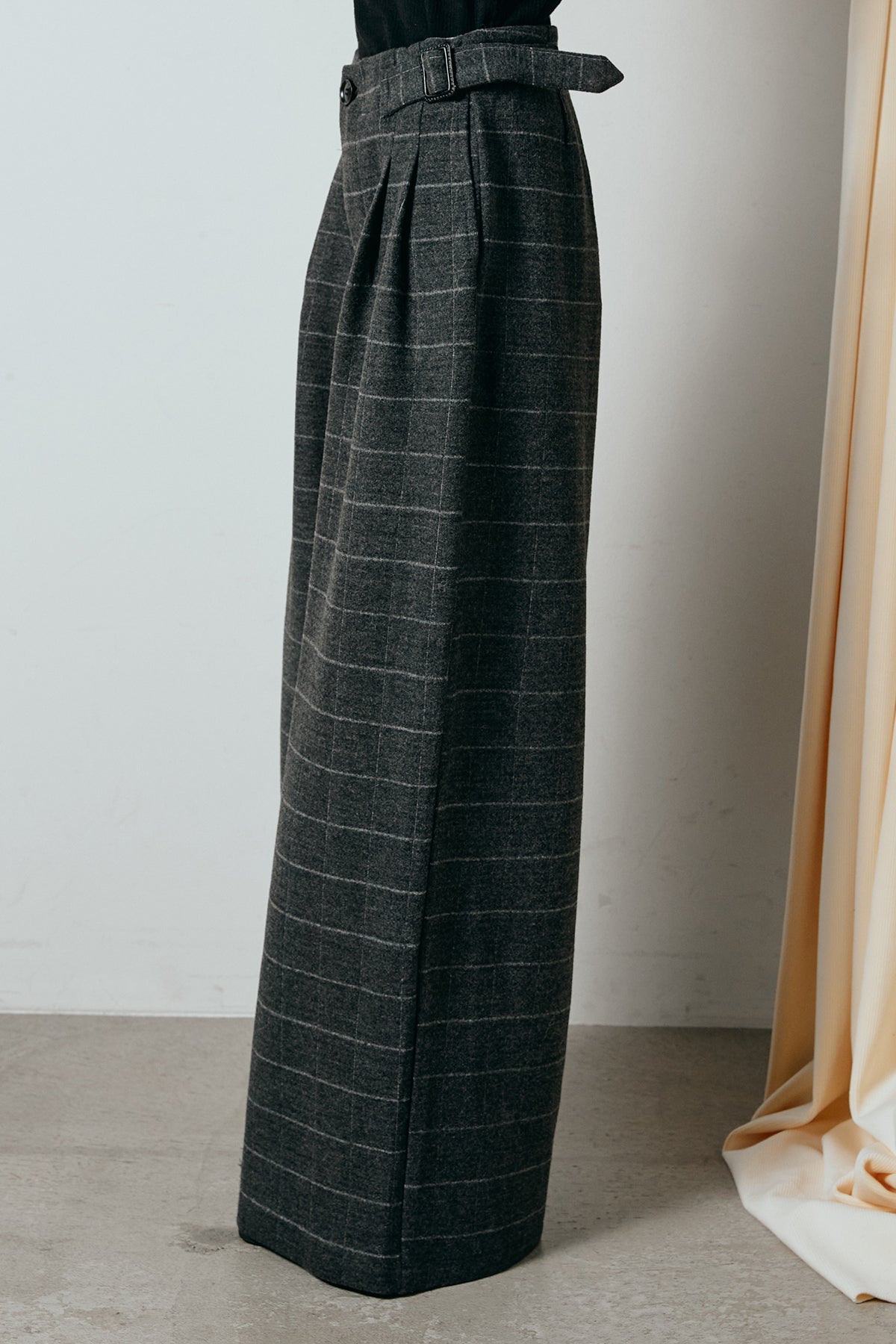 上品なスクエアチェック柄が印象的なワイドパンツ。 しっかりとした生地感でシルエットを美しく保ち、落ち感のあるラインが脚をすっきりと見せてくれます。 ウエストのベルトディテールがアクセントとなり、タックインスタイルも様になります。 ジャケットを合わせてクラシックに、ニットやスウェットと合わせて抜け感を出すのもおすすめです。