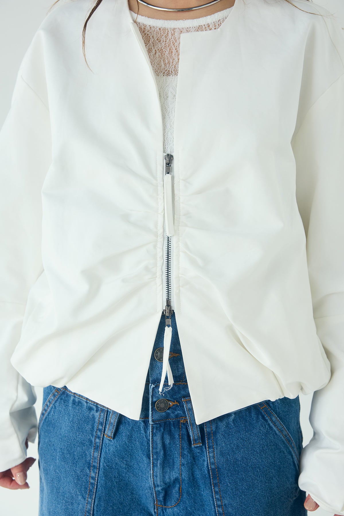 ノーカラーフロントギャザージップアウター フロントに寄せたギャザーが立体感を生み、シンプルながら印象に残るデザインのジップアウター。 ノーカラー仕様ですっきりとした首元をつくり、インナーとのレイヤードも映える一枚です。程よいボリューム感の袖が全体のバランスを整え、デニムからスカートまで幅広いボトムスと好相性。軽やかな着心地で、スタイリングにさりげない変化を加えてくれます。