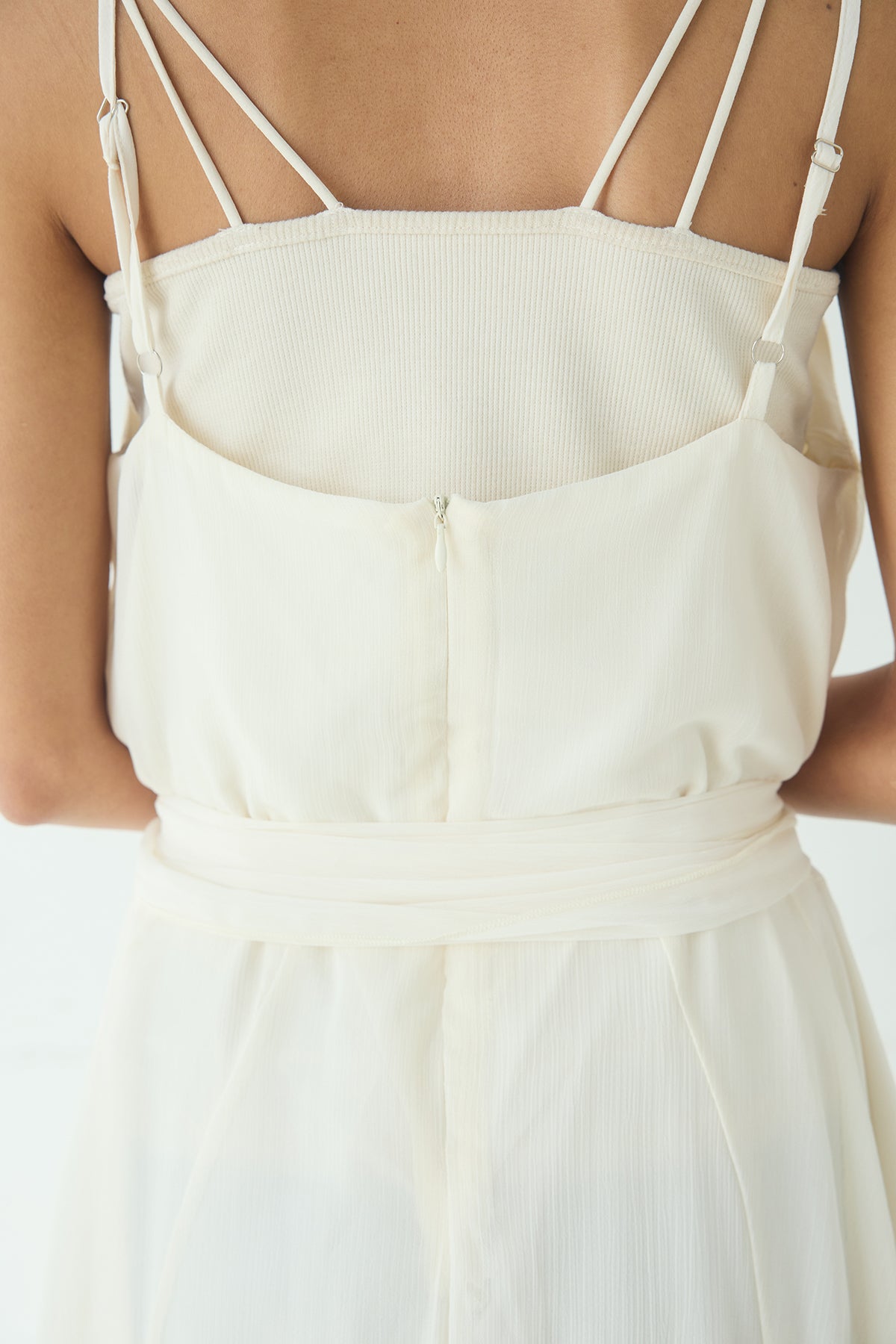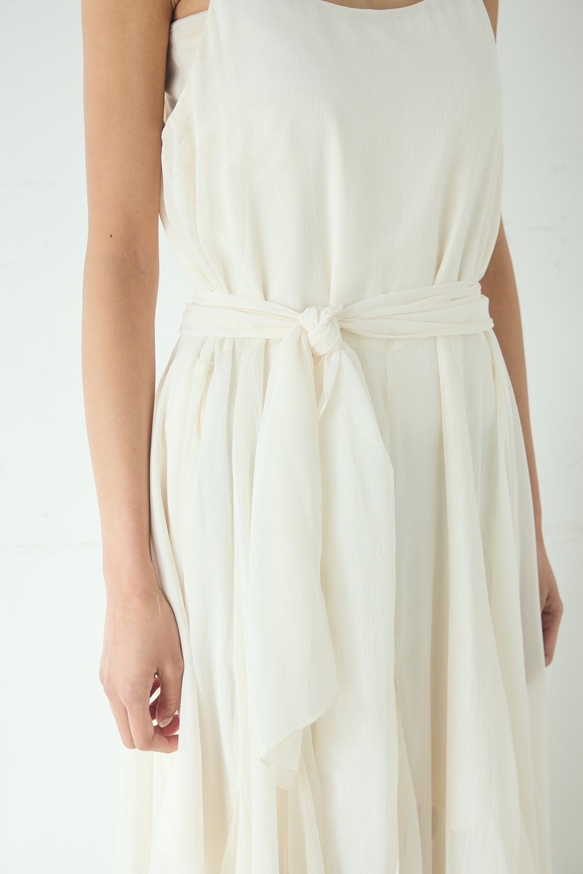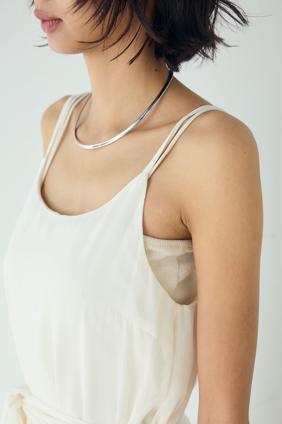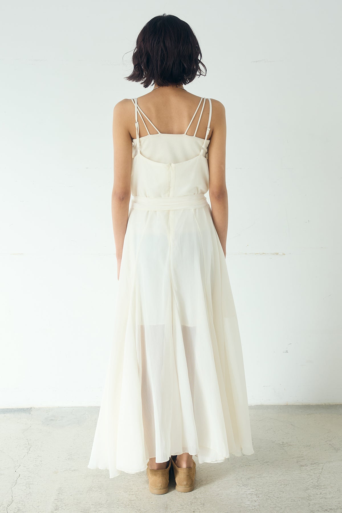 シアーフリルキャミワンピース 軽やかなシアー素材にフリルのニュアンスを重ねた、動きのある表情が魅力のキャミワンピース。 縦に流れるシルエットが全体をすっきりと見せつつ、レイヤード次第で印象の変化も楽しめる一枚です。インナーとの組み合わせで季節をまたいだ着こなしが可能で、スタイリングに奥行きをプラスします。