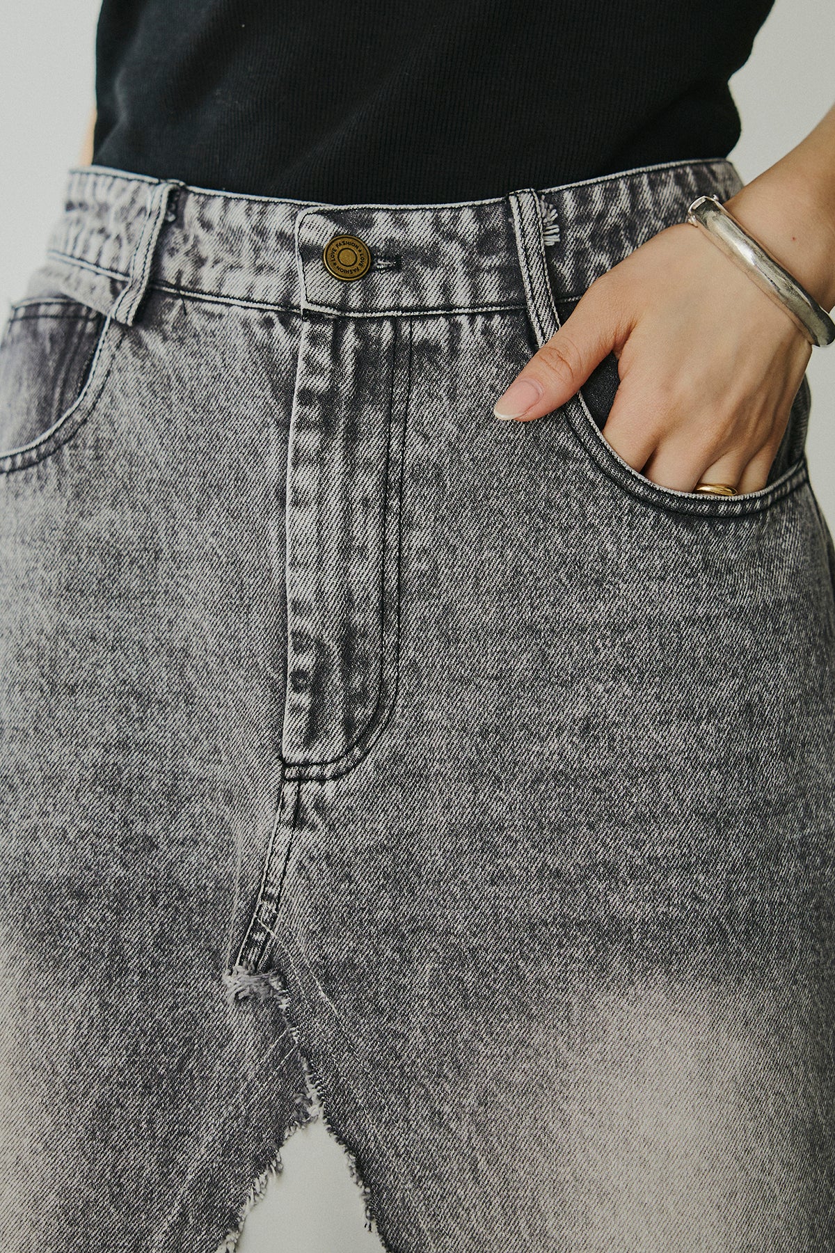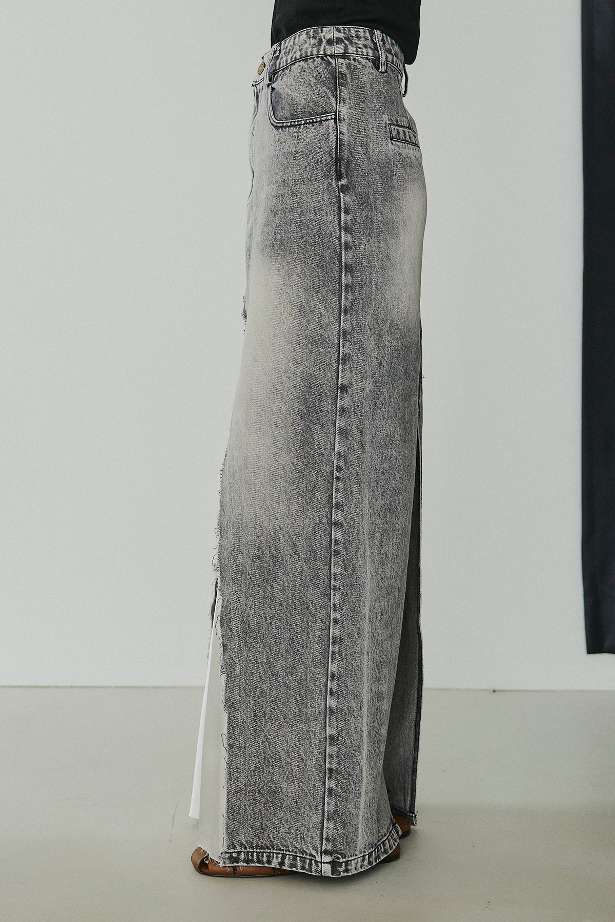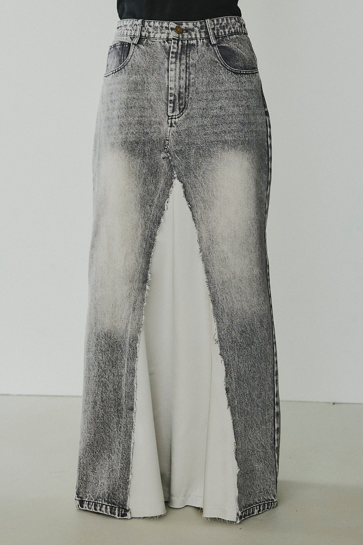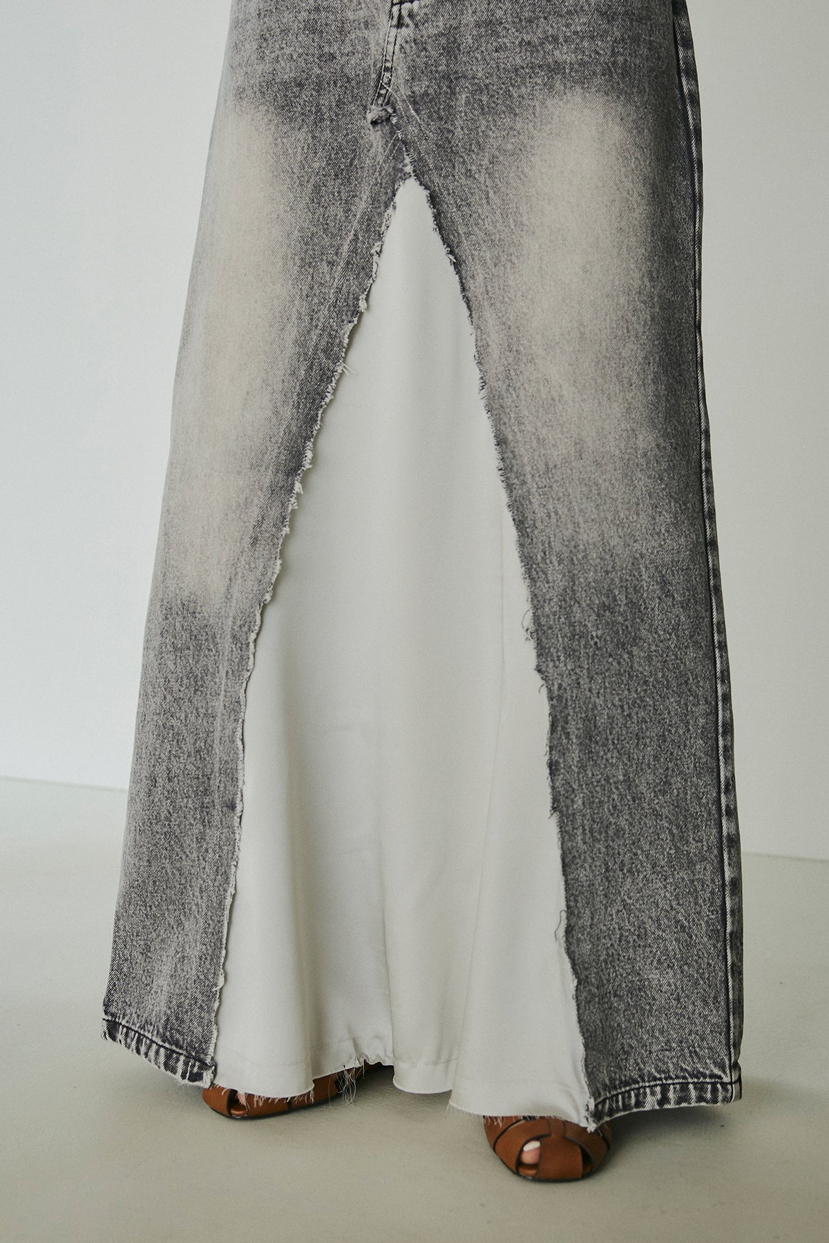 異素材のコントラストが目を惹く、サテン切り替えデザインのデニムスカート。 カジュアルなデニムに光沢感のあるサテンを組み合わせることで、シンプルながらも洗練された印象に仕上げた一着です。 切り替え部分が立体感と動きを生み出し、歩くたびに揺れる軽やかなシルエットを演出。 程よく広がるラインで、女性らしさとこなれ感を両立しています。 ウエストはすっきりとしたデザインで、トップスインのスタイリングもバランスよく決まる仕様。 デニムならではの程よいカジュアルさで、デイリーに取り入れやすいのも魅力です。 シンプルなトップスと合わせるだけでコーディネートが完成し、スタイリングの主役として活躍。 シンプルなスタイリングに遊び心をプラスし、都会的でこなれたムードを演出してくれる一着です。