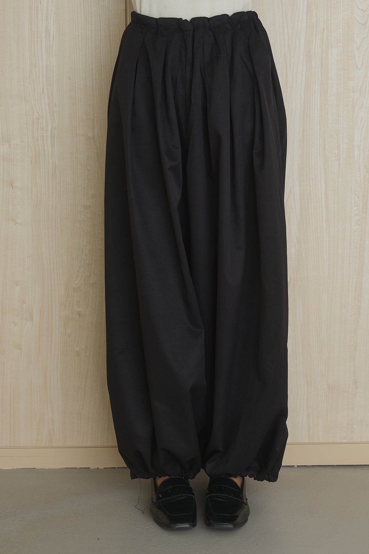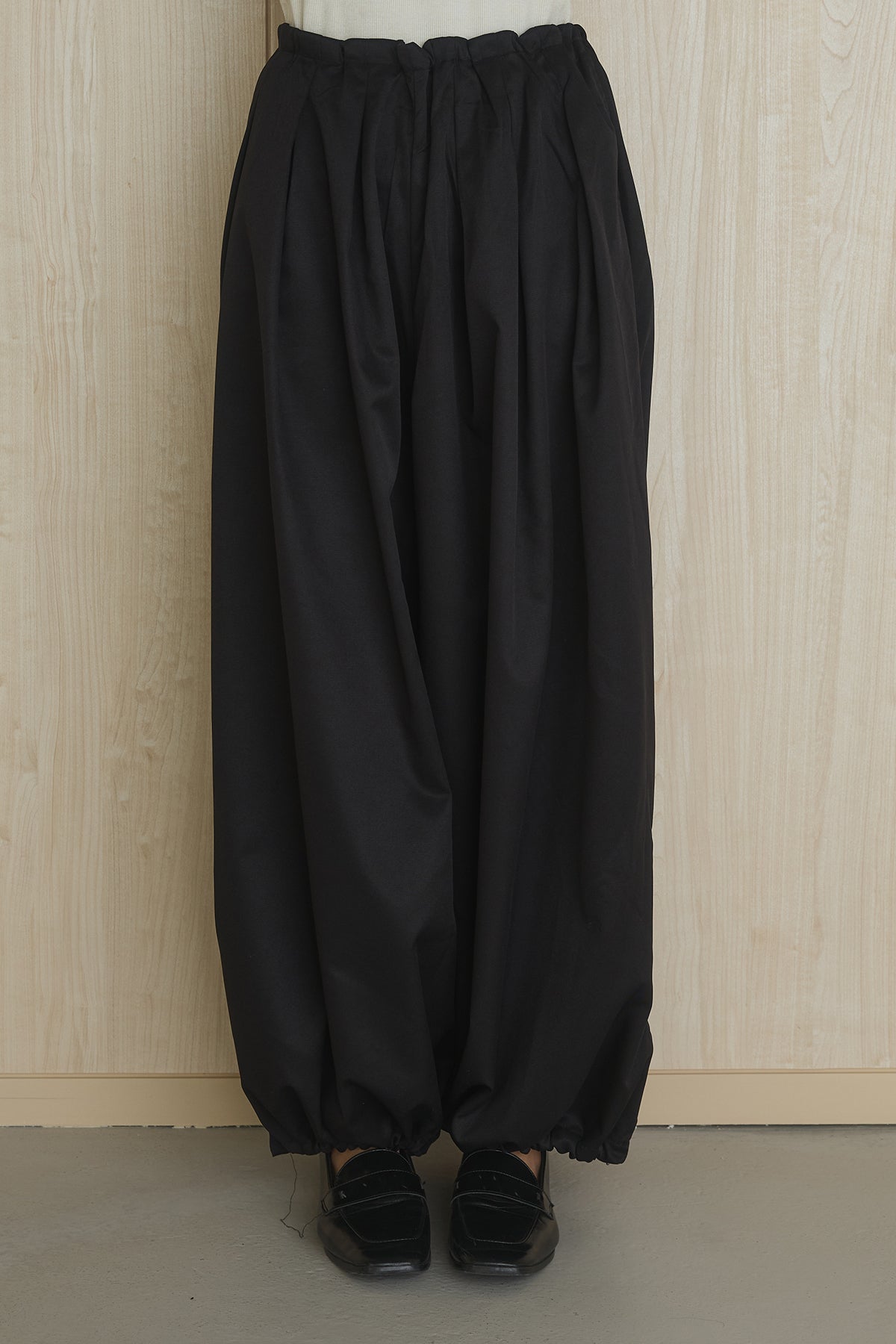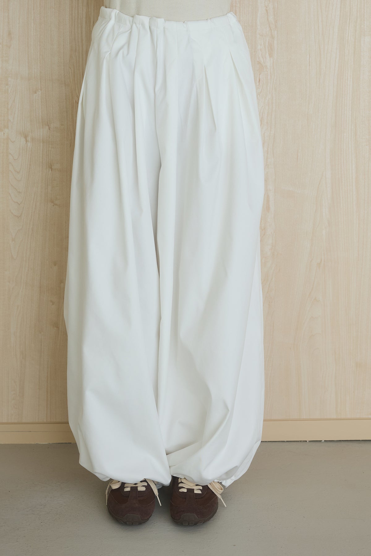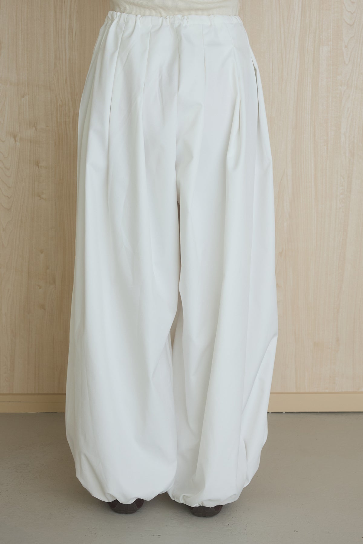 裾にかけて丸みのあるシルエットを描く、裾絞りデザインのワイドパンツ。 ボリューム感のあるフォルムが特徴で、シンプルながらも存在感のある一着です。 ウエストのタックが立体感を生み出し、腰まわりはすっきりとした印象に。 裾を絞ることで生まれるバルーンシルエットが、こなれた雰囲気を演出します。 軽やかでさらっとした素材感で、快適な穿き心地も魅力。 コンパクトなトップスと合わせたメリハリのあるスタイルはもちろん、ゆったりとしたトップスとのリラックス感あるコーディネートもおすすめです。 スタイリングに動きと個性をプラスし、洗練された印象に仕上げてくれるアイテムです。