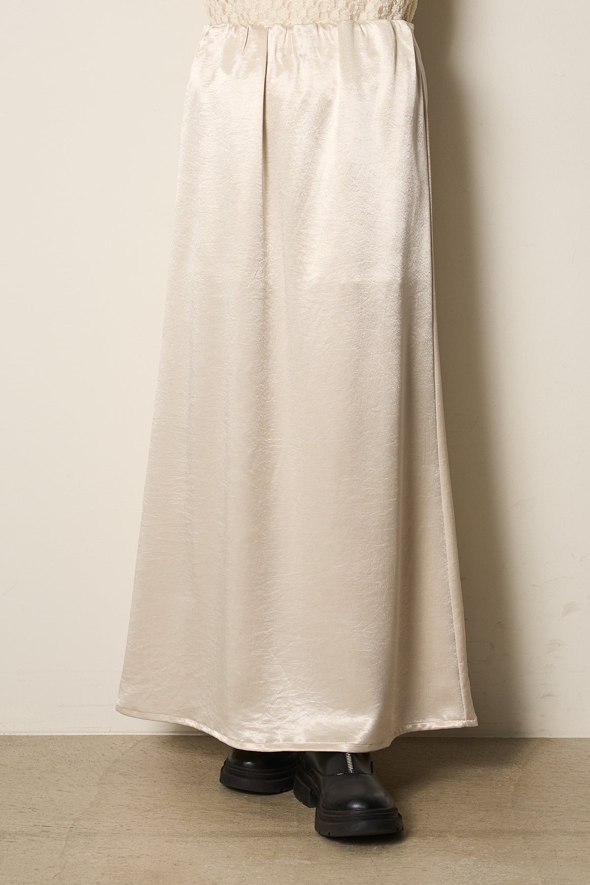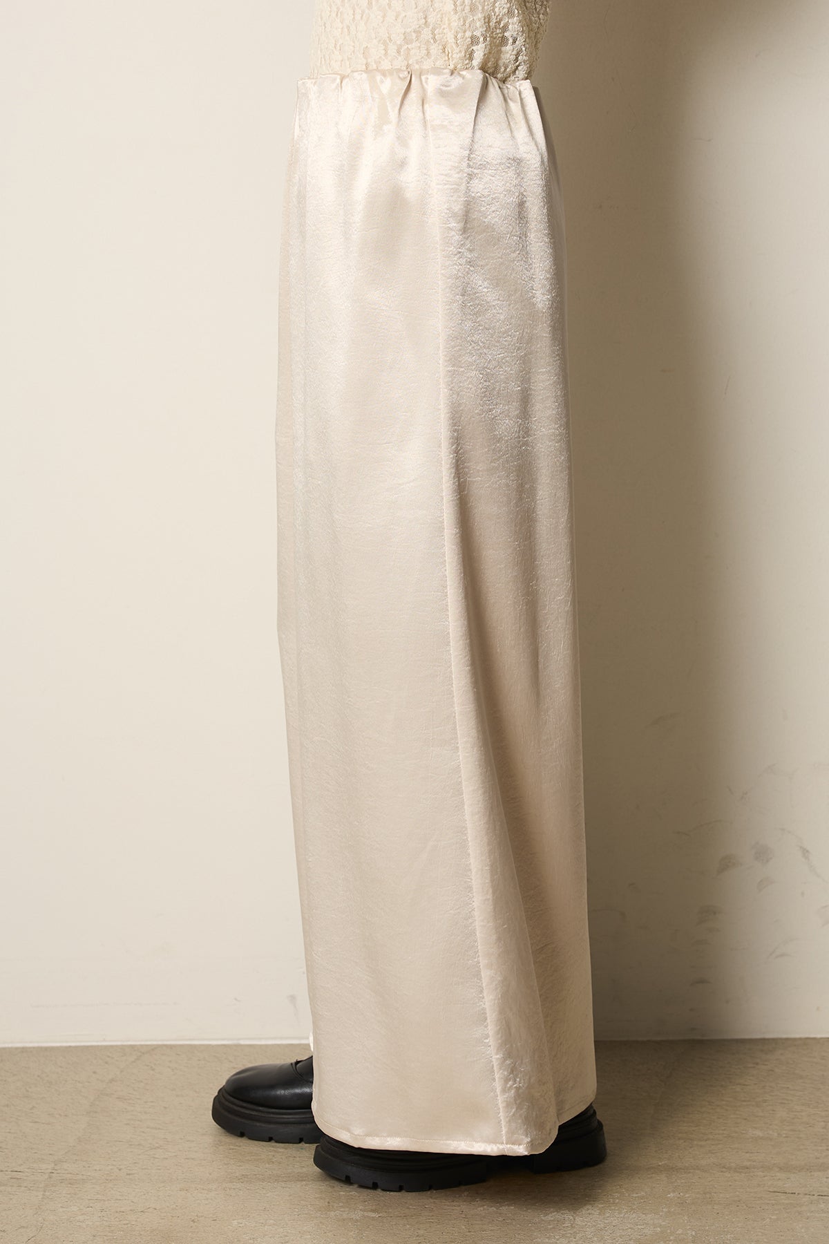 上品な光沢感が魅力のサテン素材を使用したセミフレアシルエットのワイドスカート。 歩くたびに揺れる美しいドレープが女性らしさを引き立て、華やかなスタイリングを演出します。 デイリーから特別なシーンまで活躍する万能アイテムです。