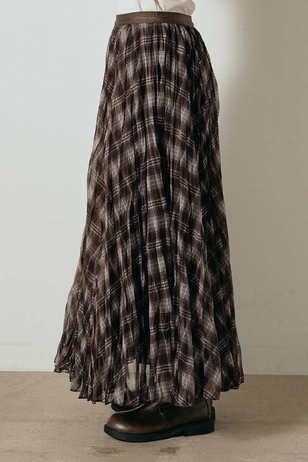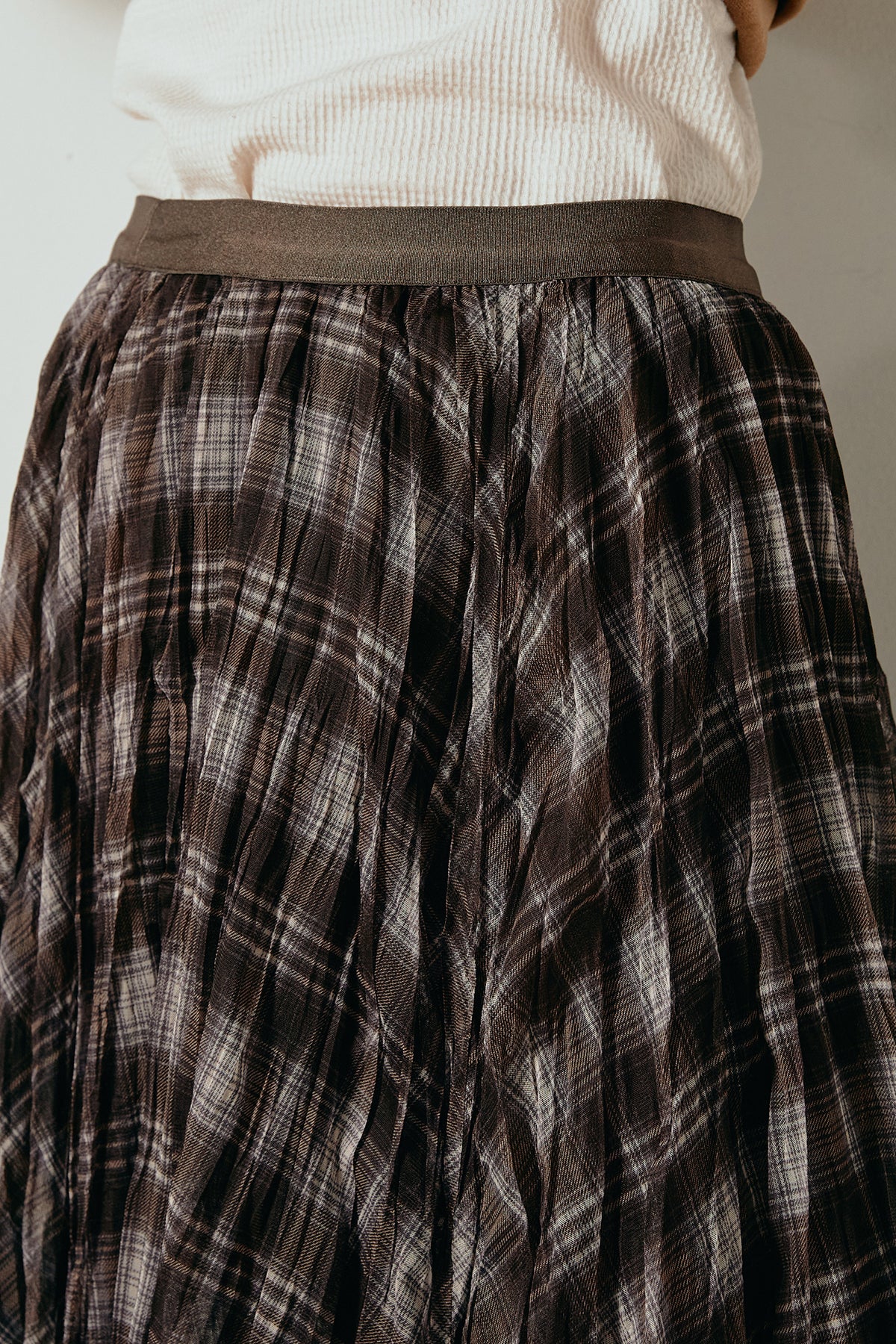 柔らかく落ち感のあるシフォン素材にプリーツ加工を施したタータンチェック柄スカート。ランダムなシワ感がラフな雰囲気を引き立て、程よい抜け感を添えます。軽やかな透け感はレイヤードスタイルにも最適で、インナー次第で季節を問わず活躍。ウエストゴム仕様でリラックスした穿き心地ながら、揺れるシルエットが動くたびに表情をプラス。デイリーからトレンド感のあるスタイリングまで幅広く取り入れられる一枚です。