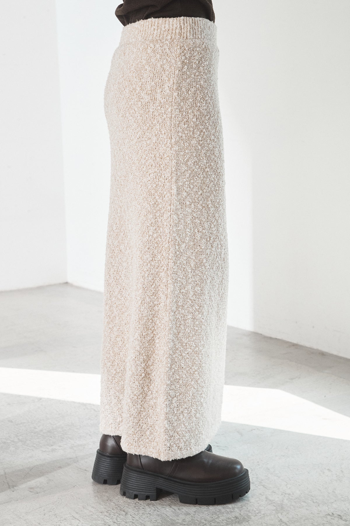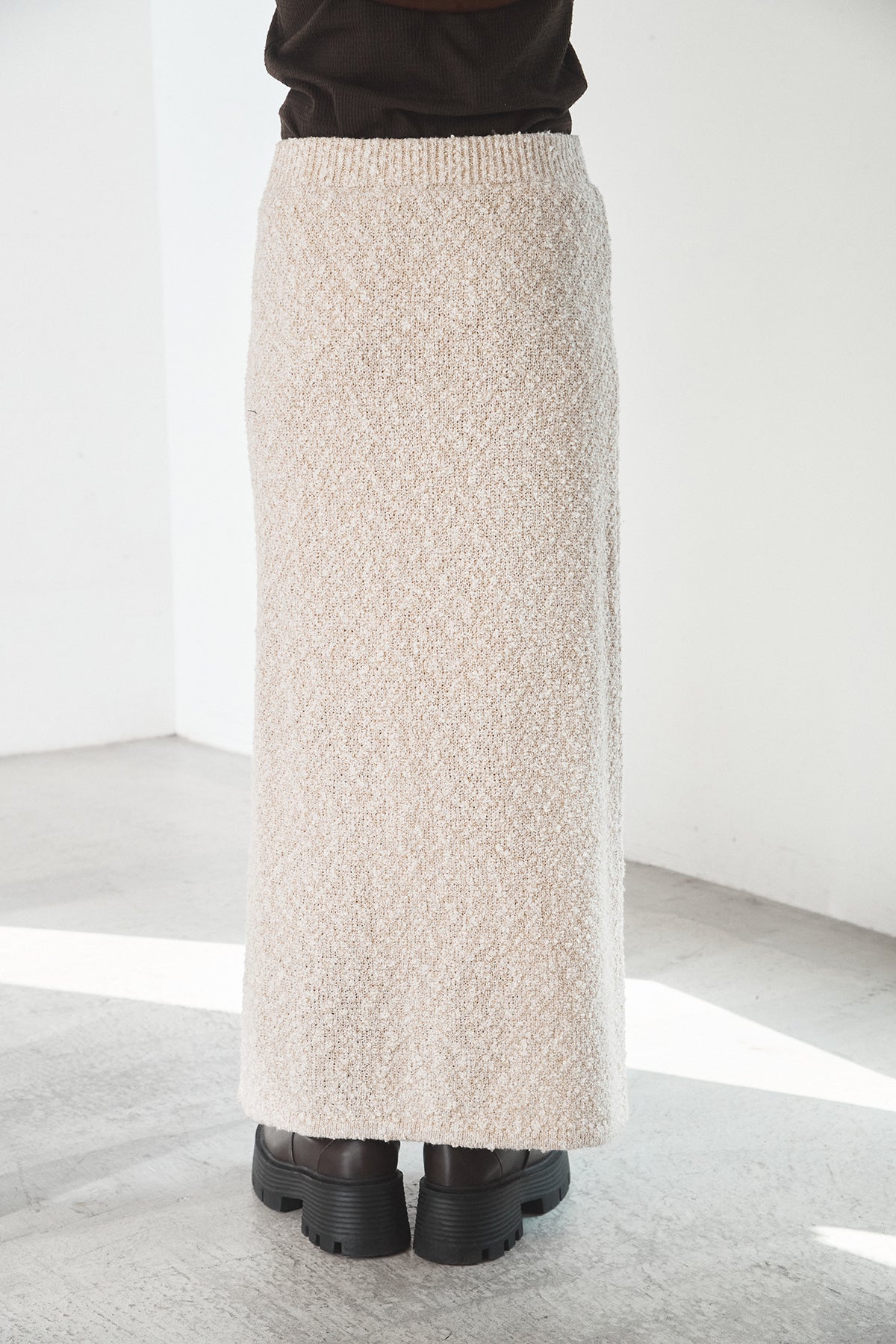 ツイード調の表情豊かな素材感が目を引く、MIXスラブスカート。複数の糸を織り交ぜたようなニュアンスのある風合いで、シンプルながらも奥行きのある印象に仕上げています。すとんと落ちるIラインシルエットが縦のラインを強調し、すっきりとしたバランスを演出。ウエストはゴム仕様で、リラックスした穿き心地も魅力です。ニットやスウェットなど幅広いトップスと好相性で、季節感のあるスタイリングに活躍します。