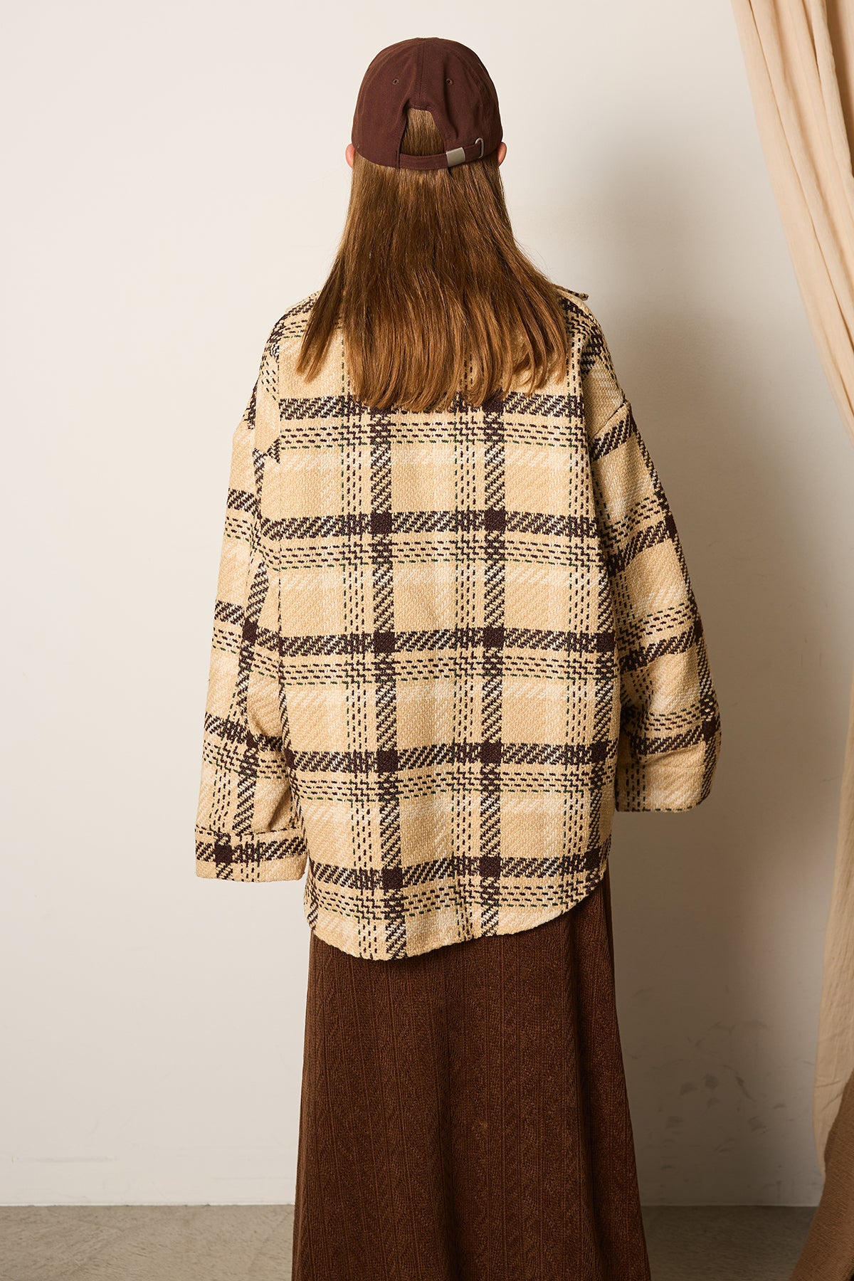 存在感のあるチェック柄が目を引くツイードジャケット。起毛感のある柔らかな風合いで、シーズンらしい温もりをプラスします。ゆとりのあるシルエットに大きめのポケットをあしらい、実用性とデザイン性を兼ね備えた一枚。羽織るだけでコーディネートが華やぐアイテムです。