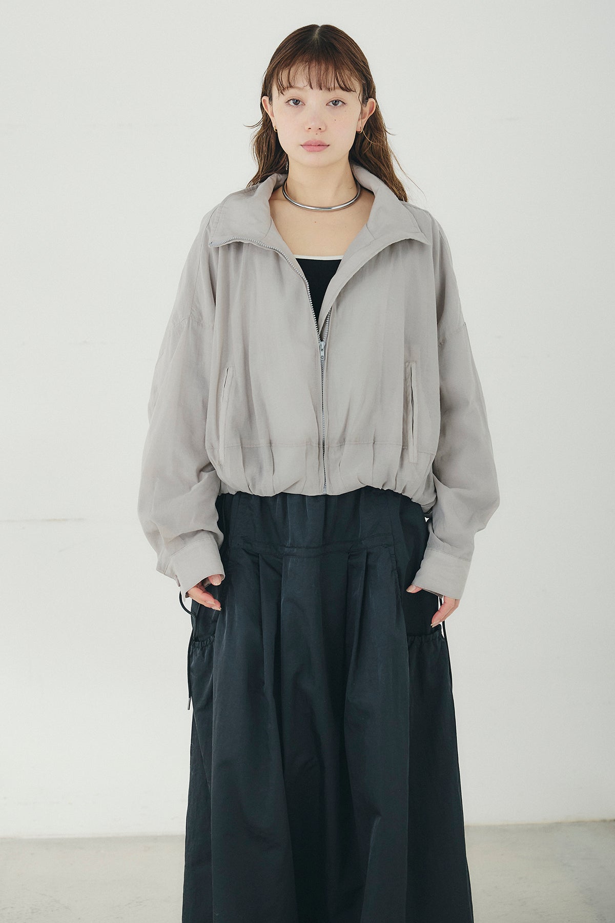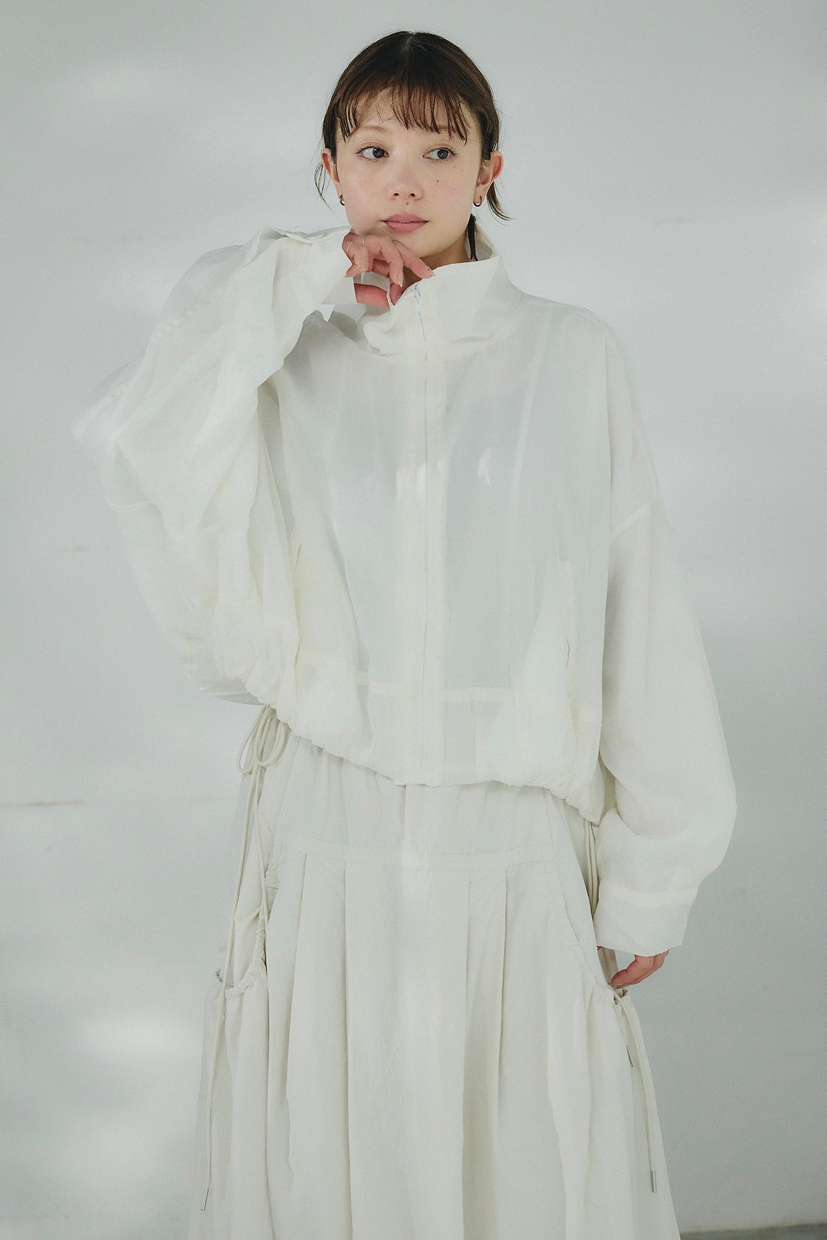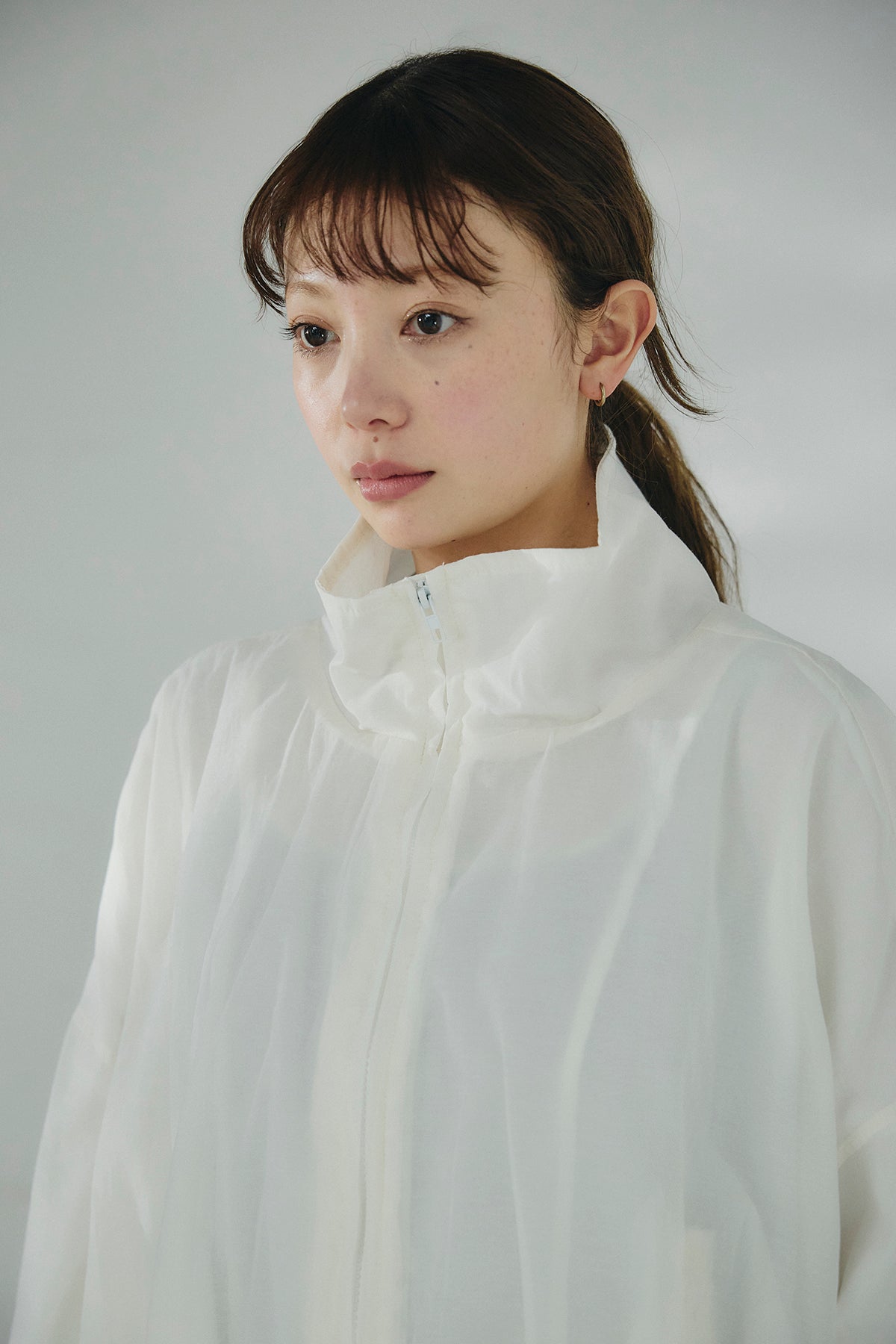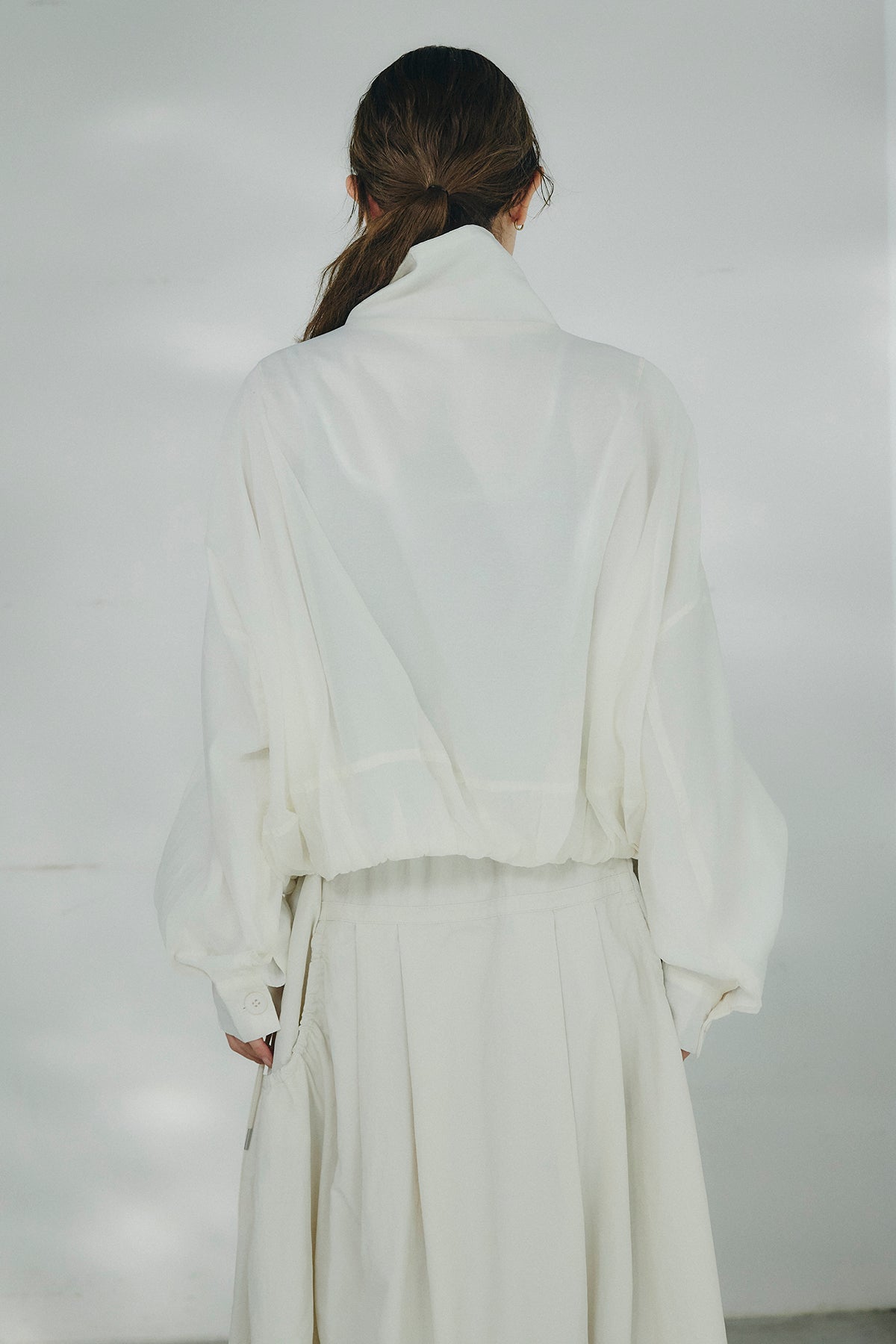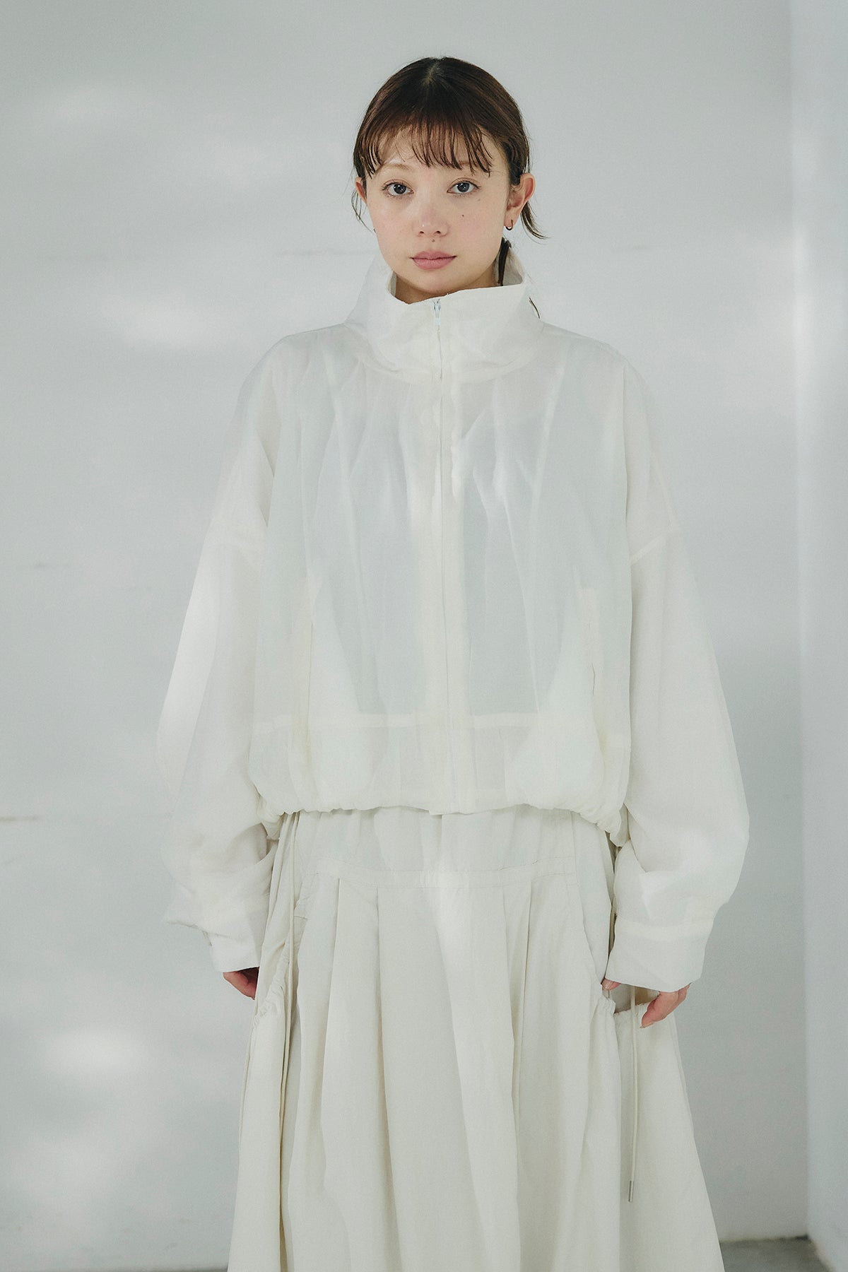 軽やかな透け感が印象的なスタンドネックのシアーブルゾン。ほどよいハリのある素材が立体的なシルエットを描き、さっと羽織るだけで抜け感のあるバランスに仕上がります。首元を包み込むスタンドネックが上品なアクセントになり、カジュアルになりすぎず洗練された印象に。ゆとりのあるフォルムとボリュームスリーブが動きのある表情を生み、インナーとのレイヤードも楽しめます。軽量で持ち運びもしやすく、季節の変わり目や冷房対策にも活躍する、着回し力の高い一着です。