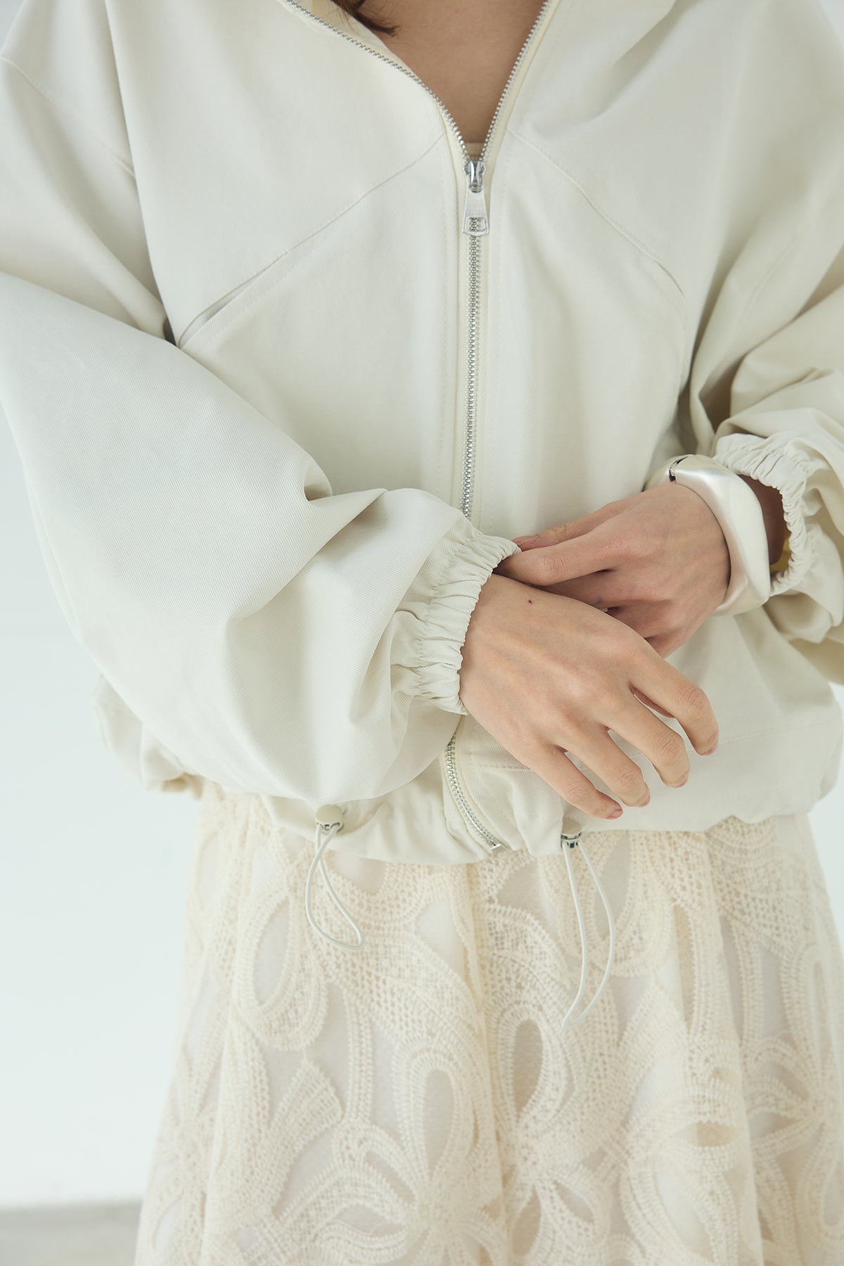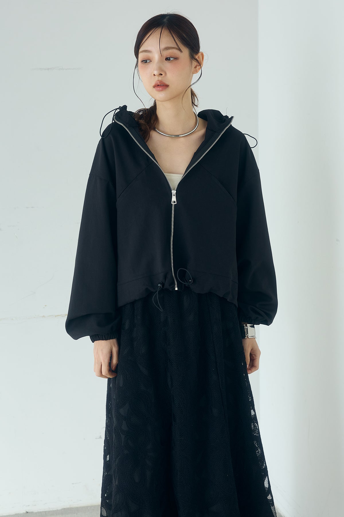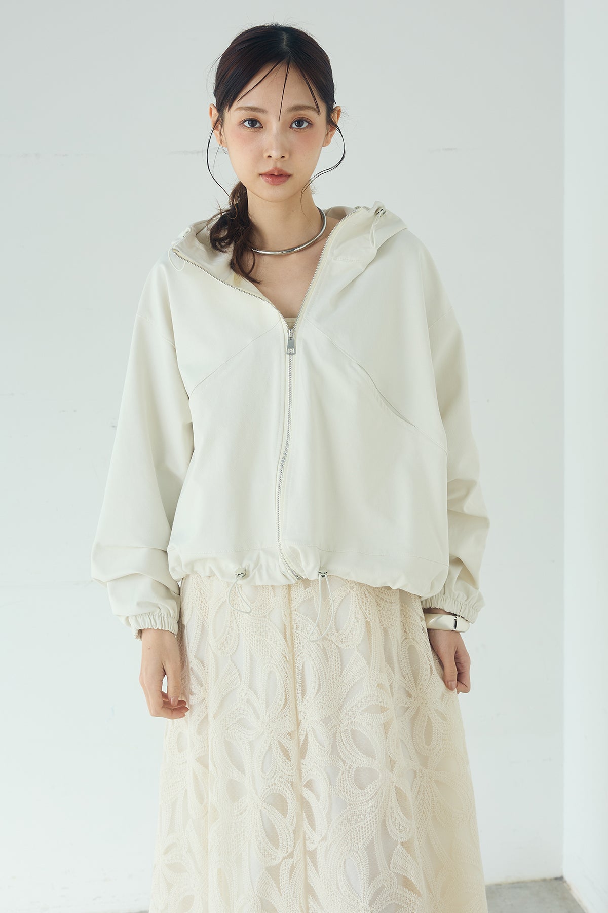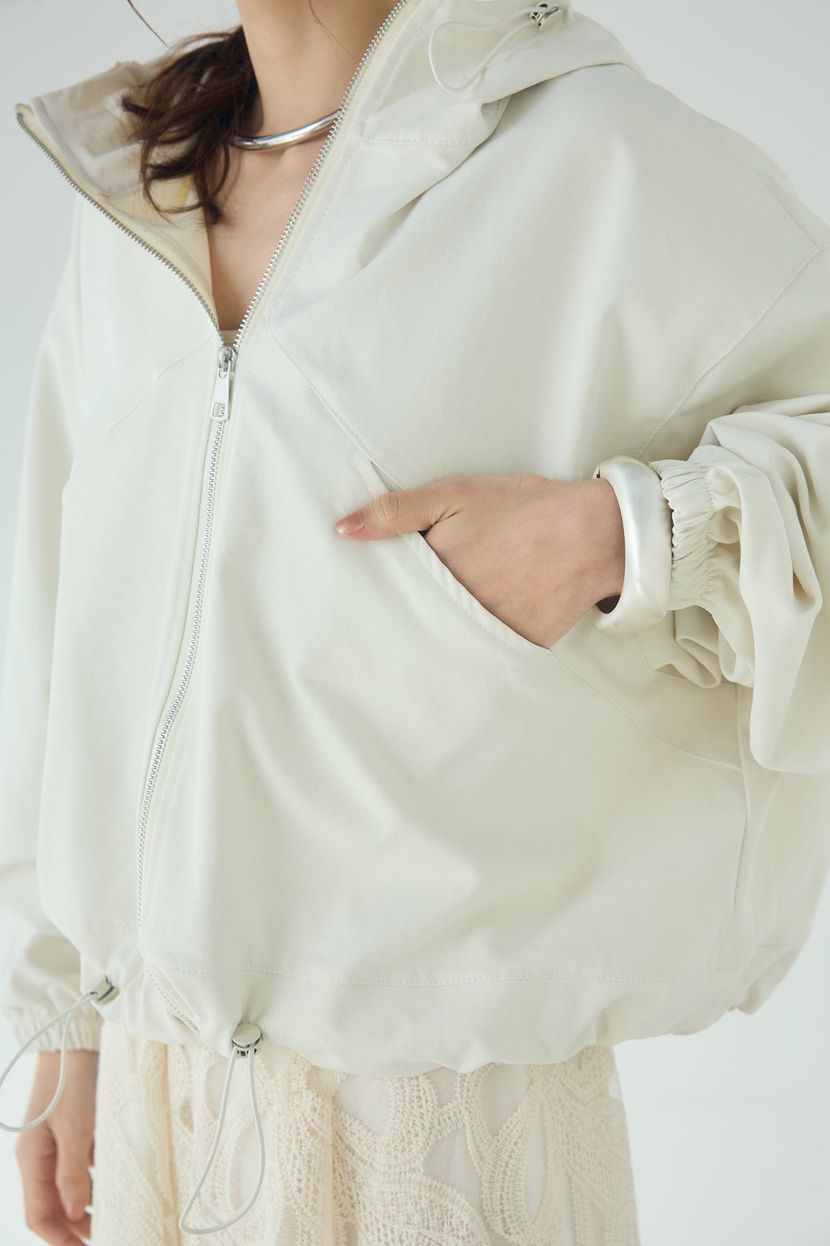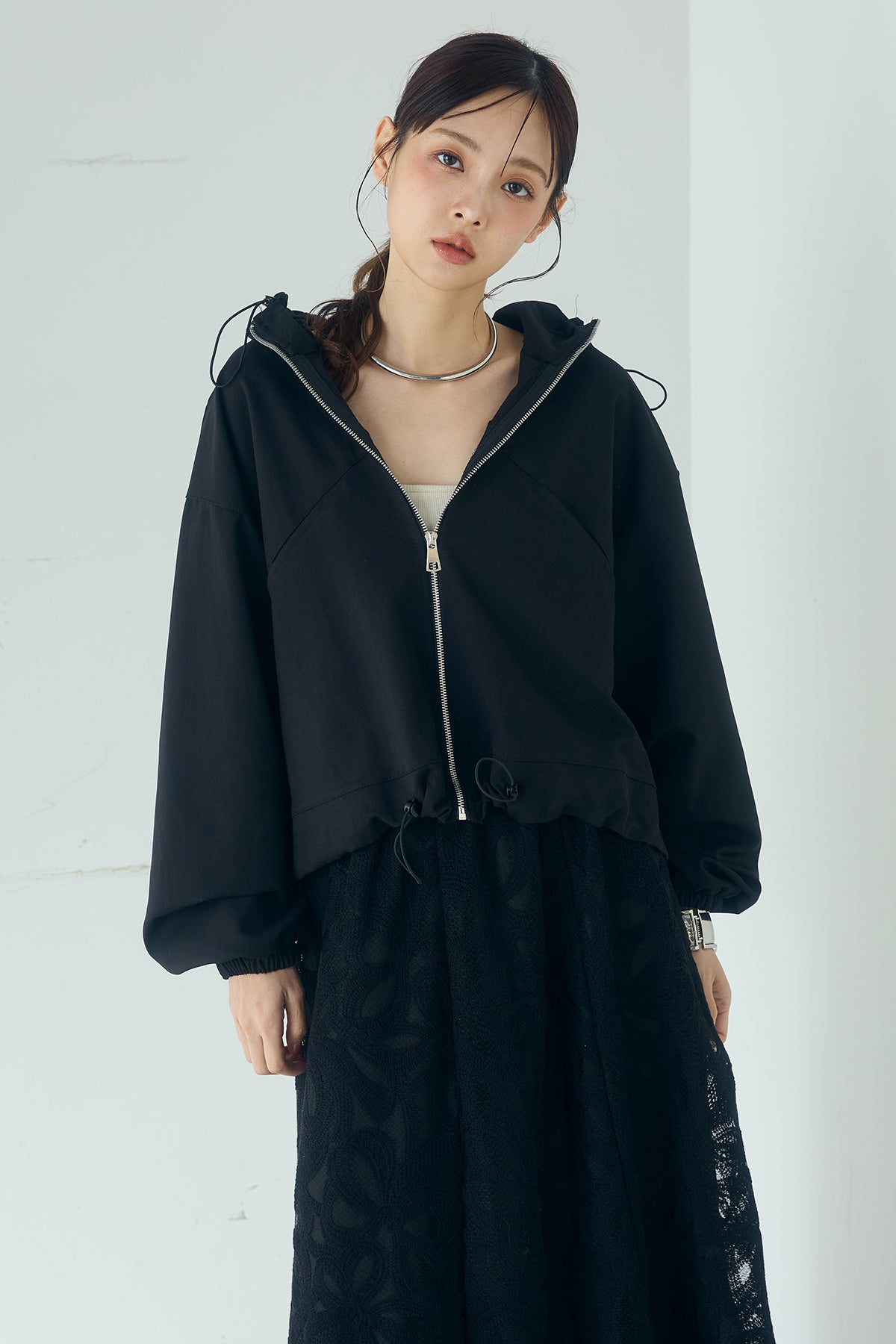軽やかに羽織れて、シルエットの変化も楽しめる一着。 ネックと裾にドローストリングを施したデザインブルゾン。絞り具合を調整することでシルエットにニュアンスが生まれ、その日のスタイリングや気分に合わせた着こなしが楽しめます。 ゆとりのあるサイズ感と程よいボリュームスリーブが抜け感をプラスし、さっと羽織るだけでバランスの整った印象に。フロントジップ仕様で着脱もしやすく、軽やかな着心地も魅力です。 ワイドパンツやスカート、ワンピースとも相性が良く、日常使いからお出かけまで幅広く活躍。季節の変わり目にも取り入れやすい、着回し力の高いアウターです。
