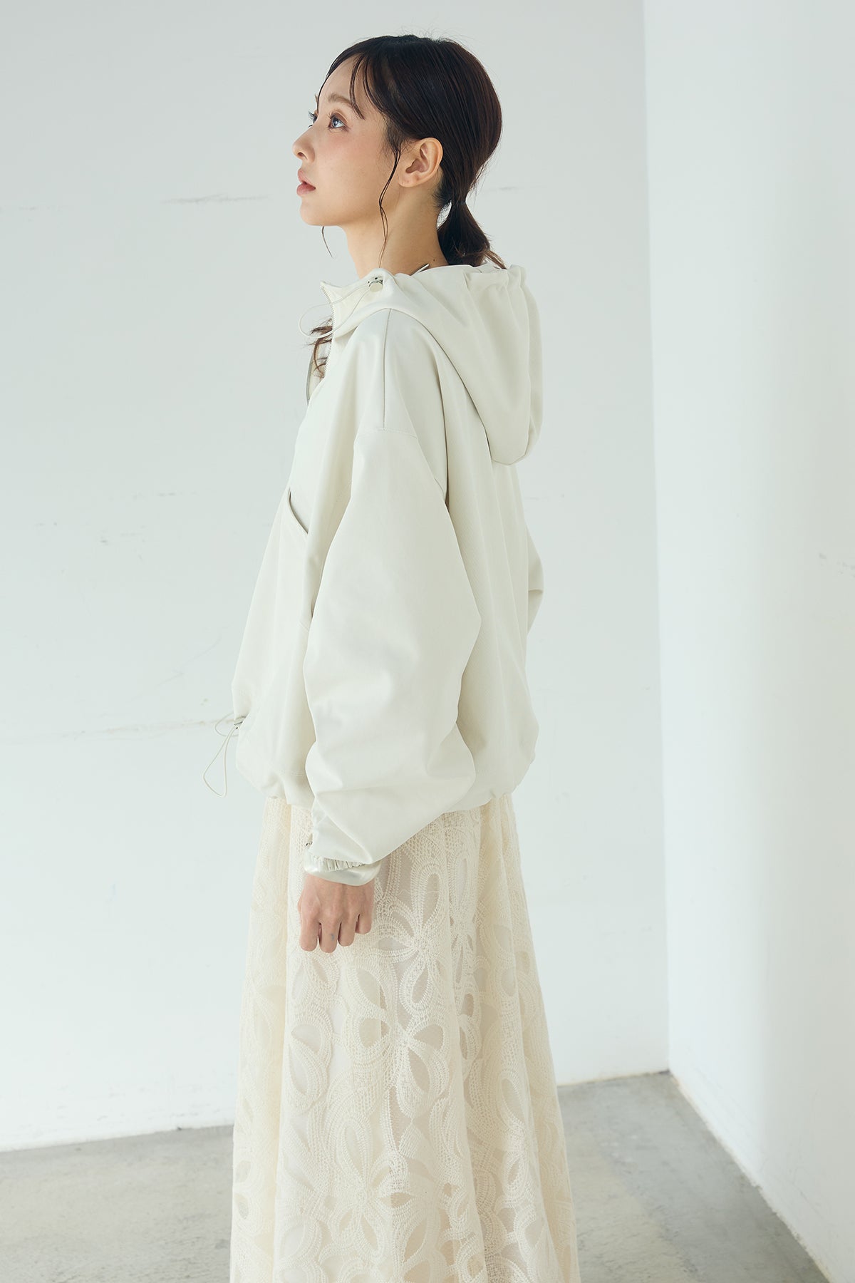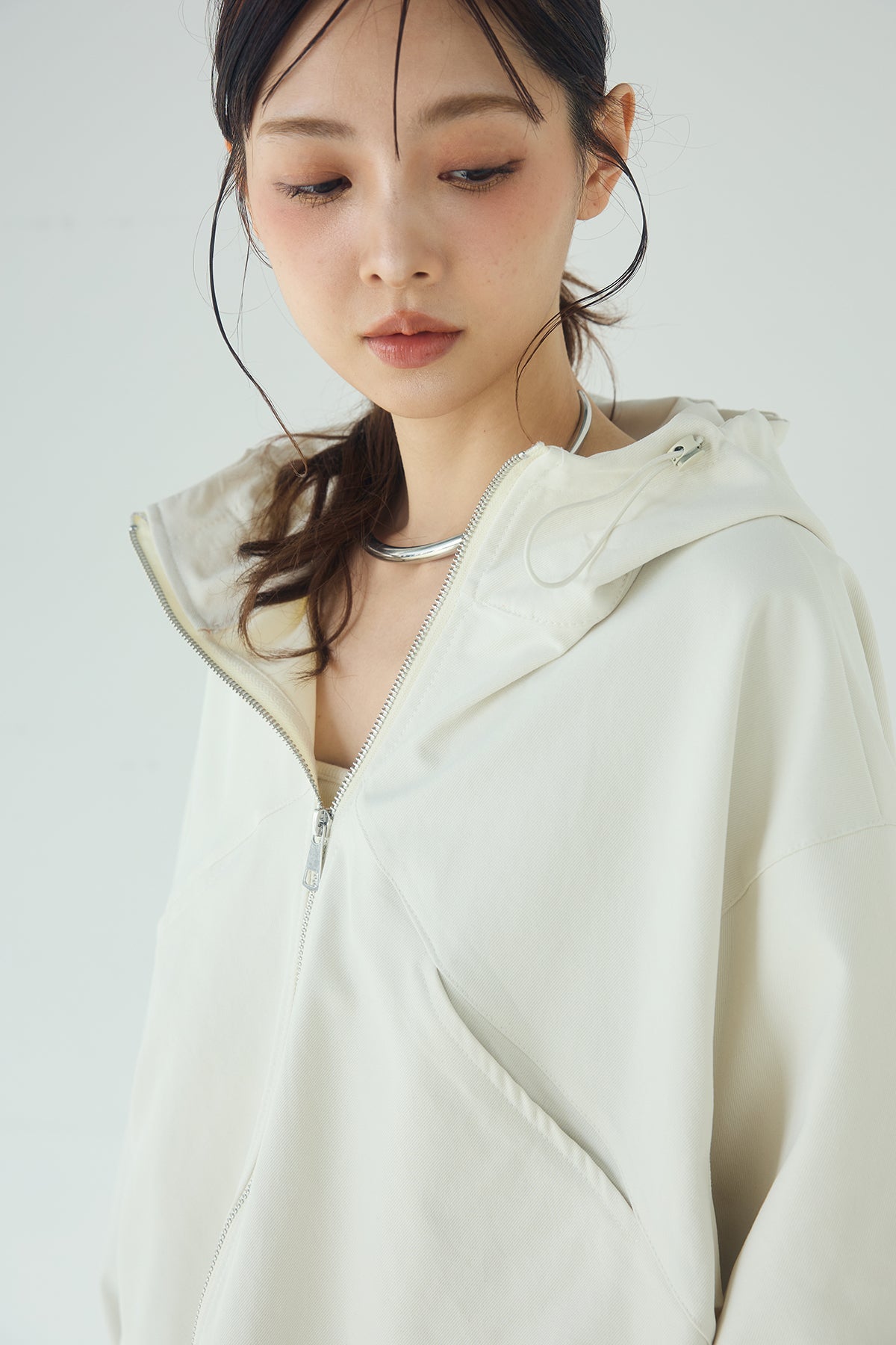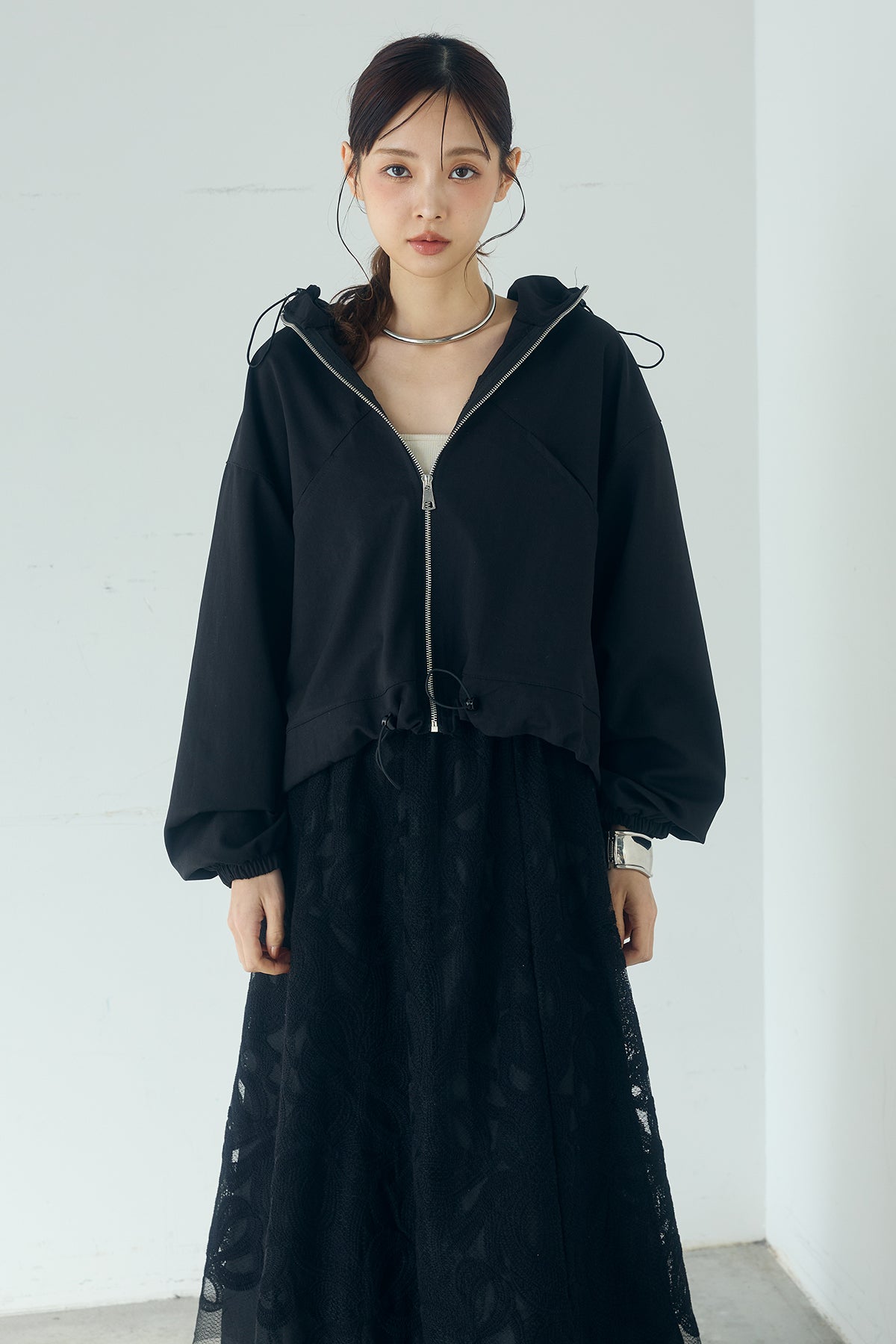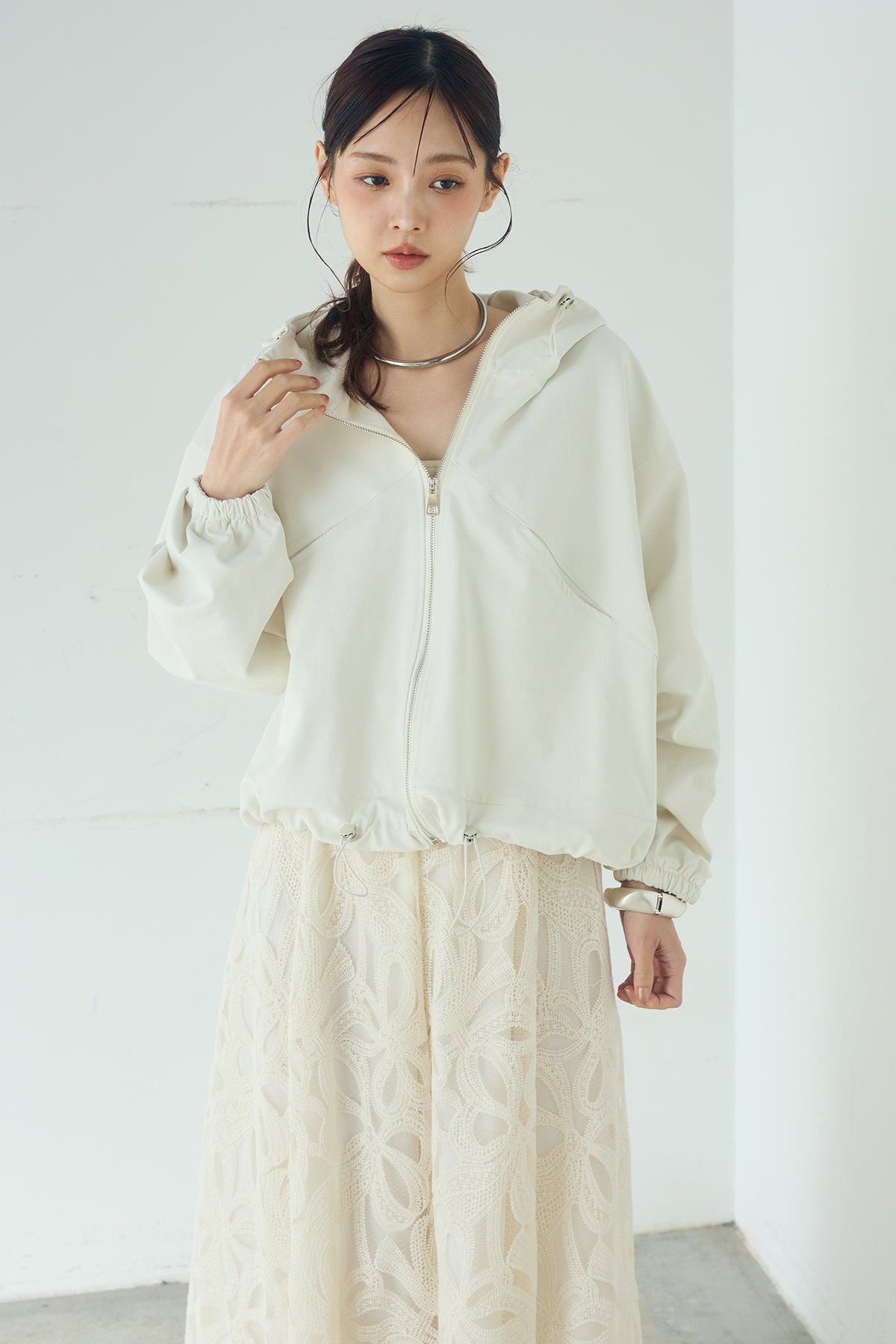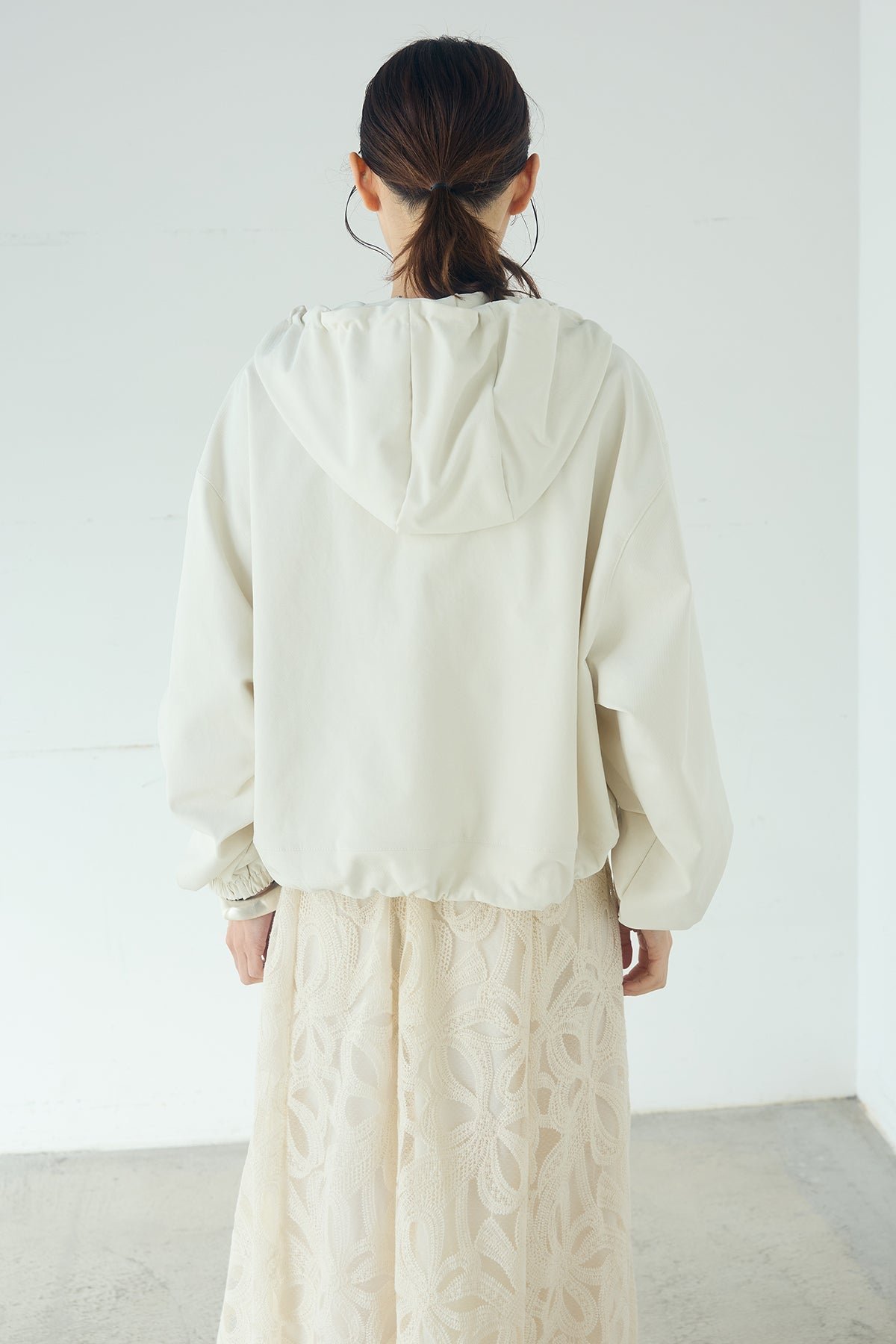 軽やかに羽織れて、シルエットの変化も楽しめる一着。 ネックと裾にドローストリングを施したデザインブルゾン。絞り具合を調整することでシルエットにニュアンスが生まれ、その日のスタイリングや気分に合わせた着こなしが楽しめます。 ゆとりのあるサイズ感と程よいボリュームスリーブが抜け感をプラスし、さっと羽織るだけでバランスの整った印象に。フロントジップ仕様で着脱もしやすく、軽やかな着心地も魅力です。 ワイドパンツやスカート、ワンピースとも相性が良く、日常使いからお出かけまで幅広く活躍。季節の変わり目にも取り入れやすい、着回し力の高いアウターです。