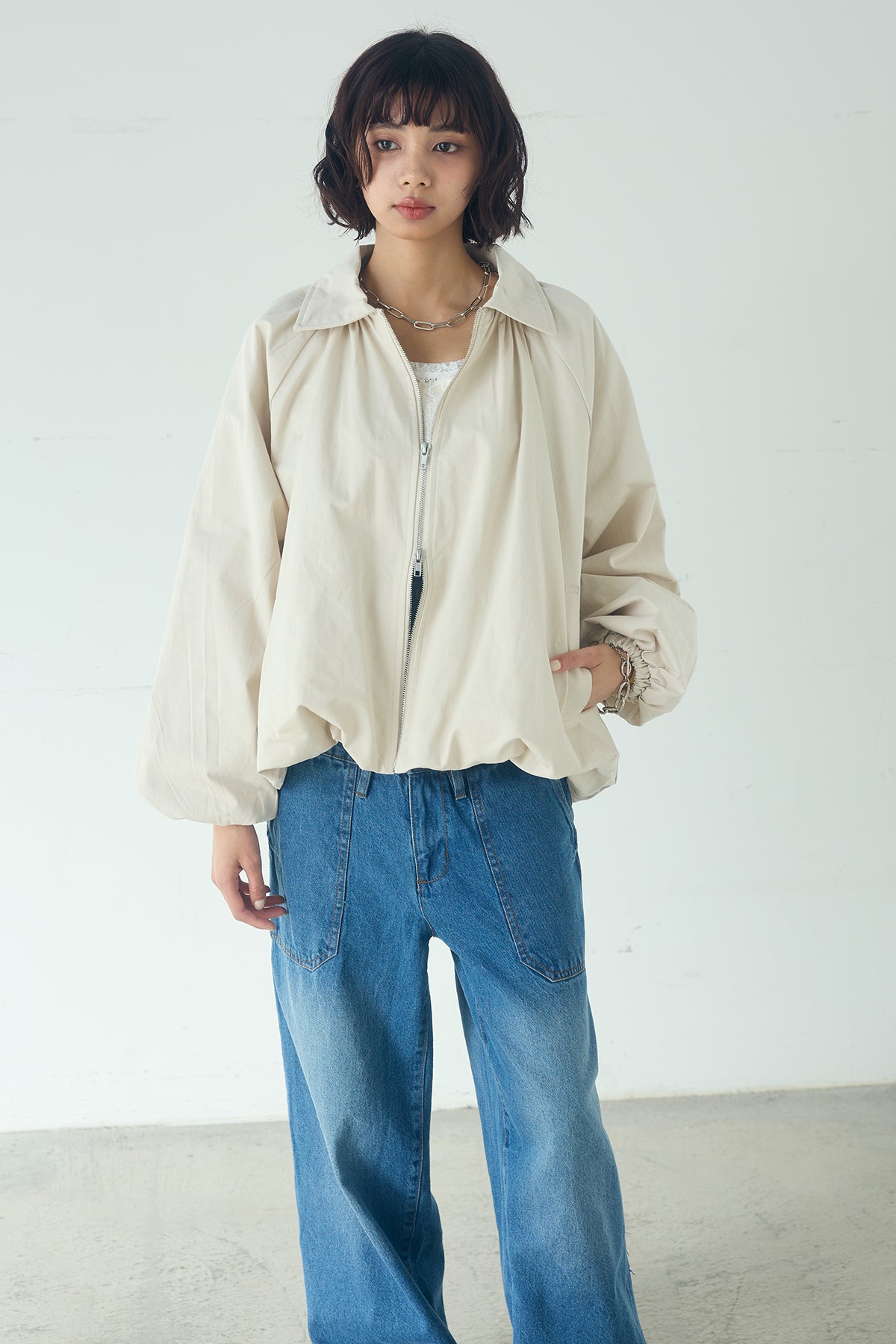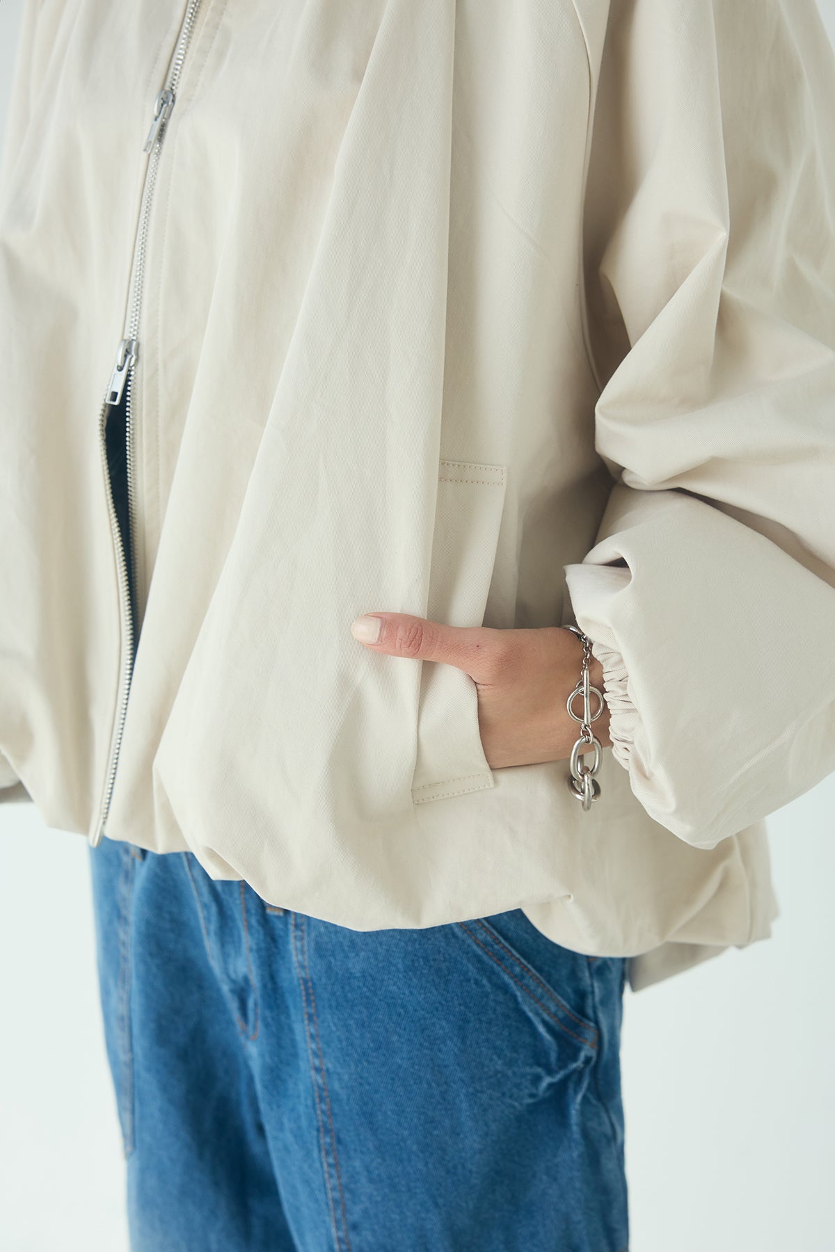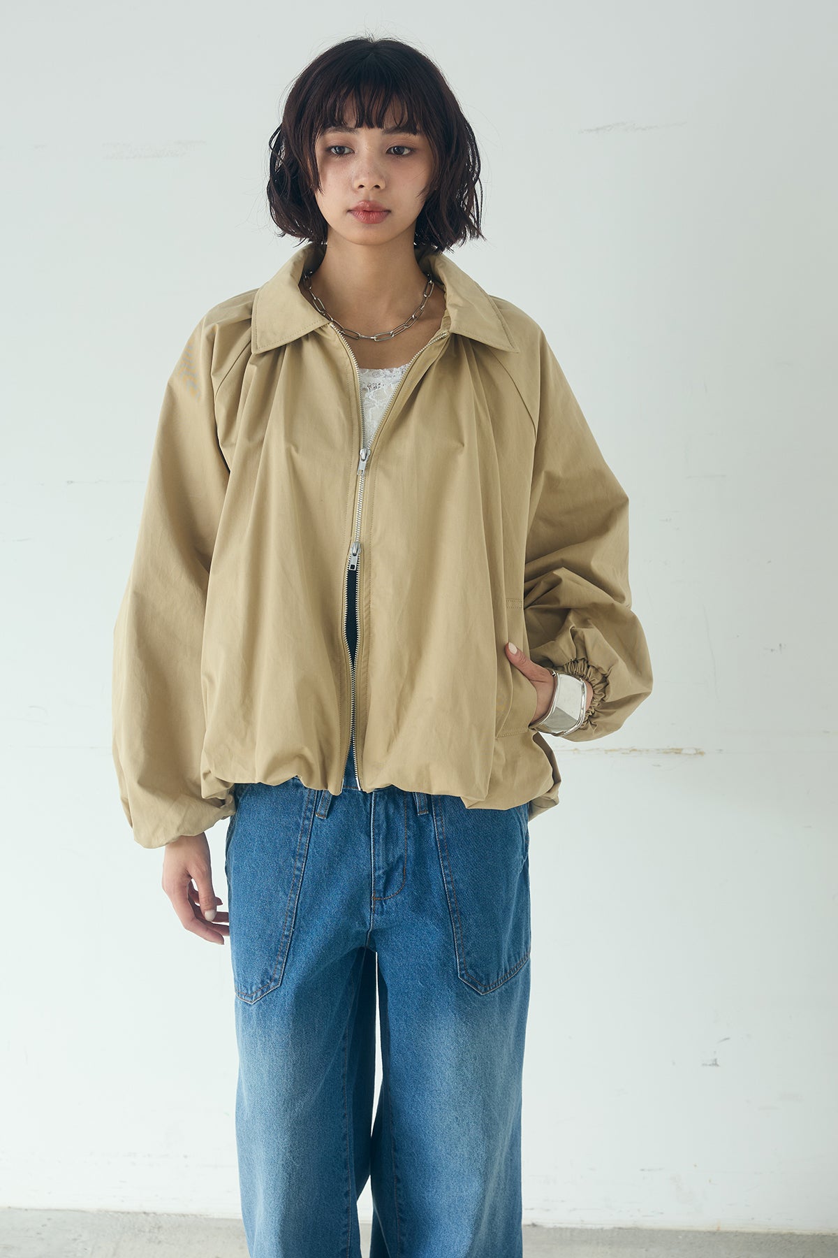 綿ツイルバルーンジャケット 程よいハリ感のある綿ツイル素材を活かし、丸みのあるバルーンシルエットで仕上げたライトアウター。 ラグランスリーブが肩まわりをやわらかく見せ、裾にかけて自然な立体感を演出します。フロントジップ仕様で着脱しやすく、パンツやスカートともバランスが取りやすい一着です。