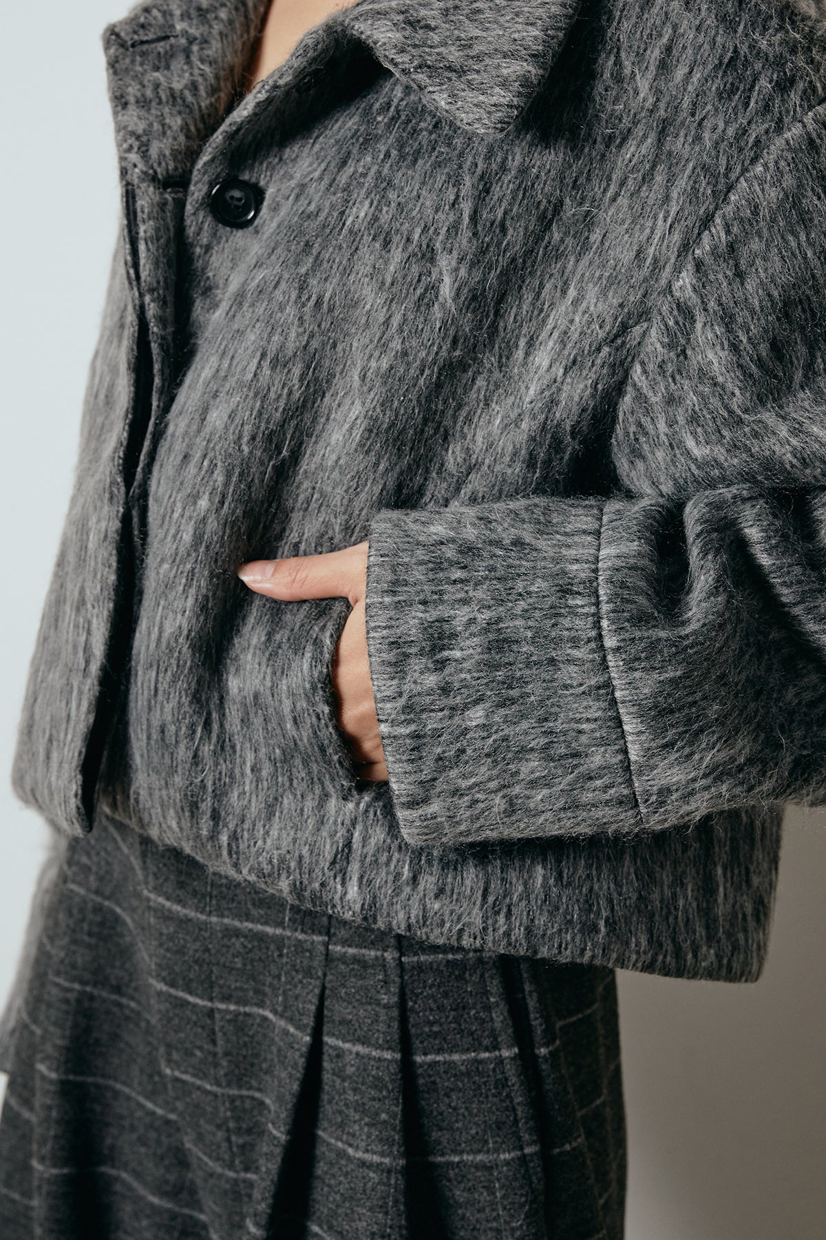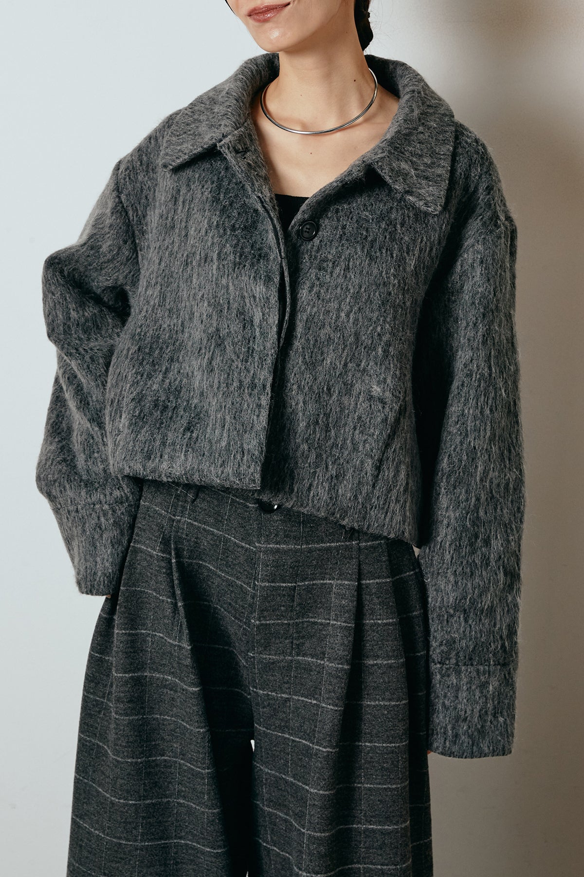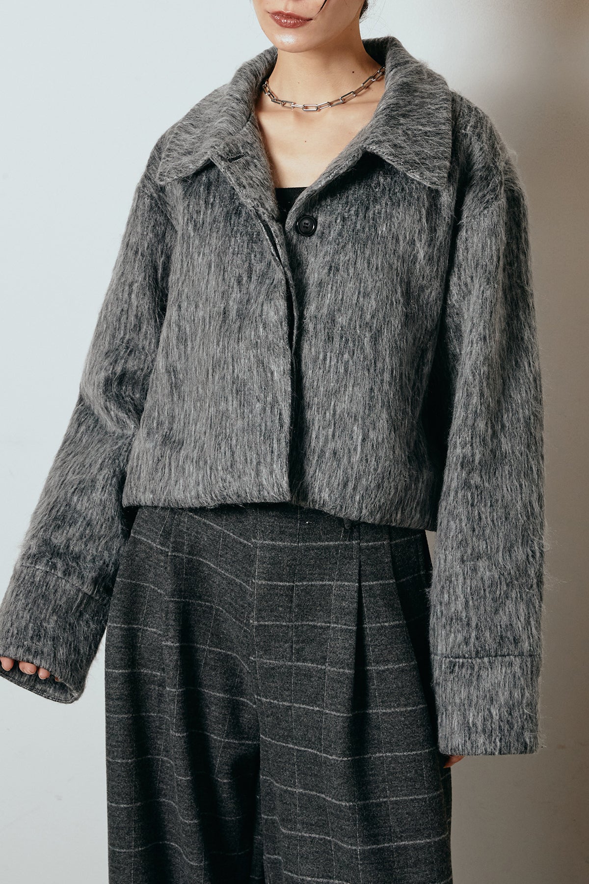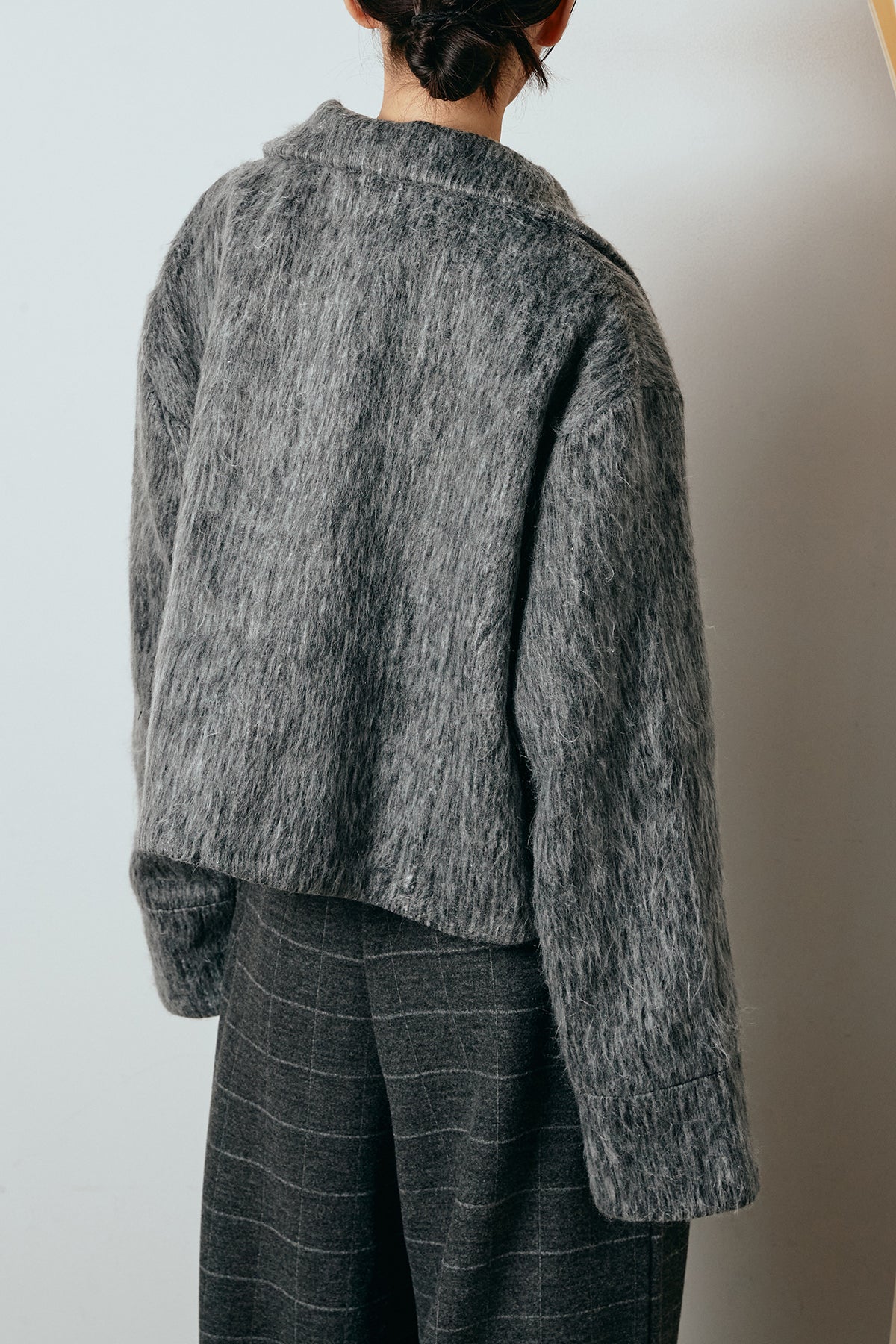 ふわっとした毛足のシャギー素材が魅力のショートジャケット。 軽やかな着心地ながら、見た目にもあたたかみのある質感が季節感を引き立てます。 程よくゆとりを持たせたシルエットとショート丈のバランスが、ボトムとの相性も抜群。 デニムやスラックスにはもちろん、スカート合わせでクラシックにまとめるのもおすすめです。