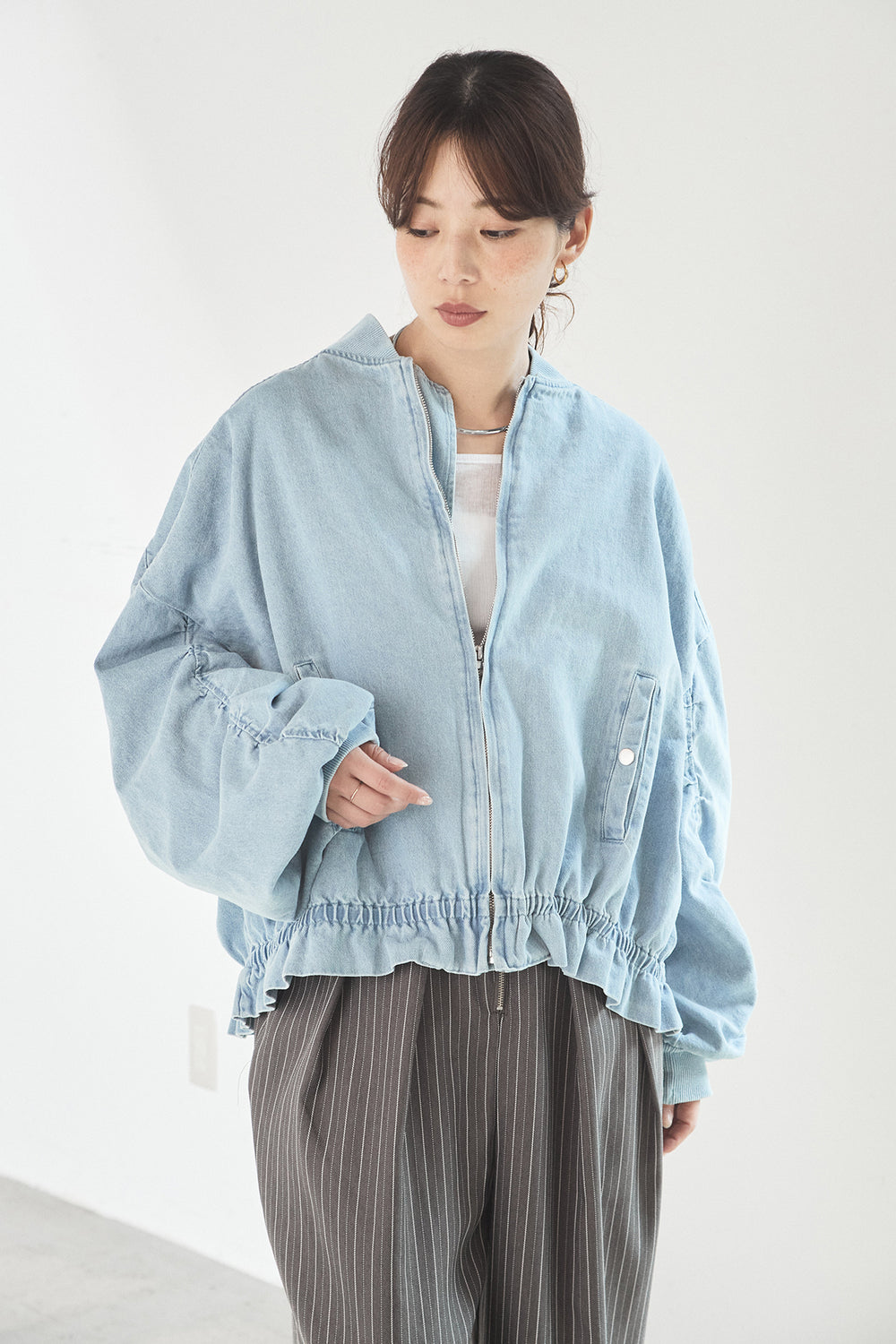 袖シャーリング裾フリルデニムブルゾン