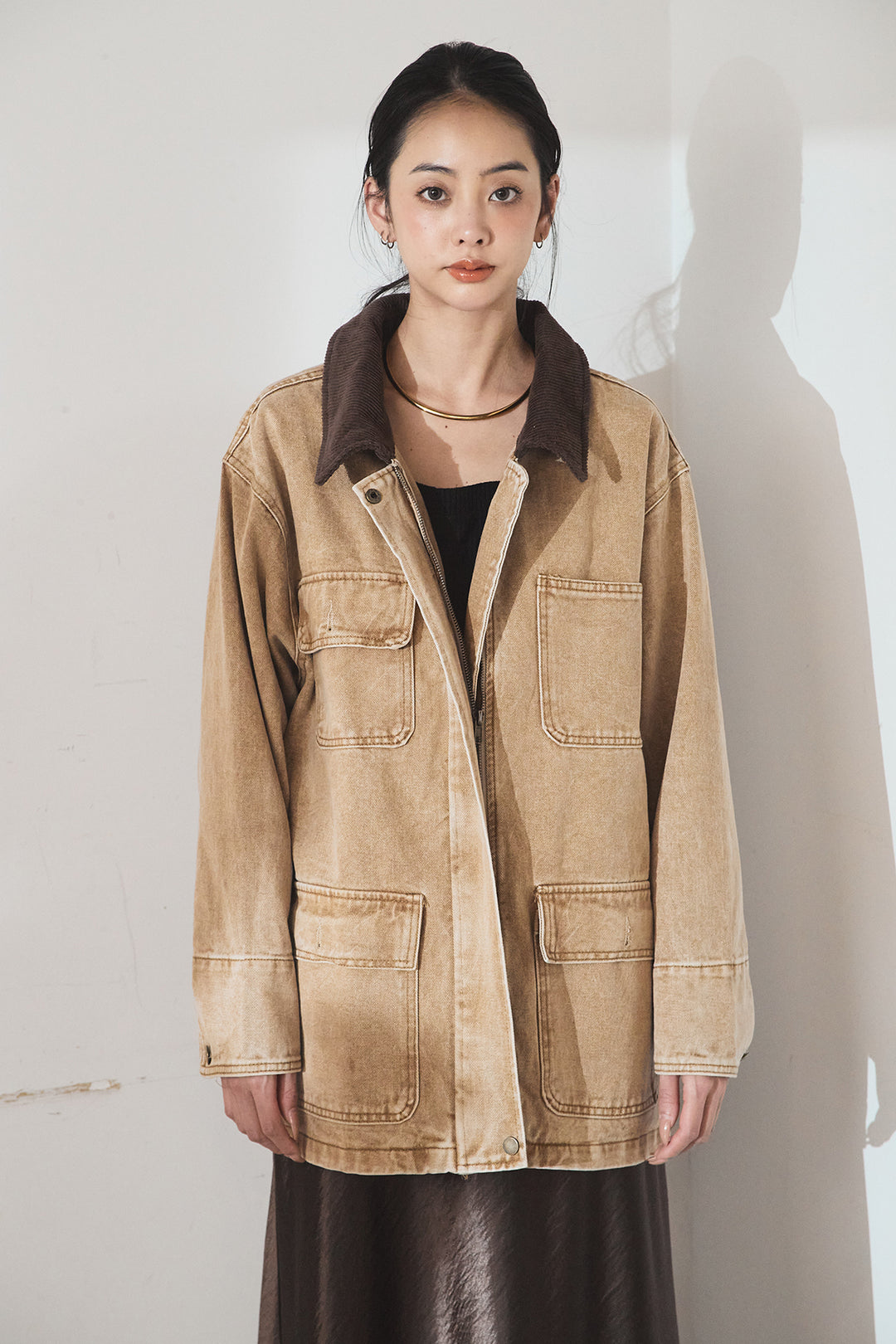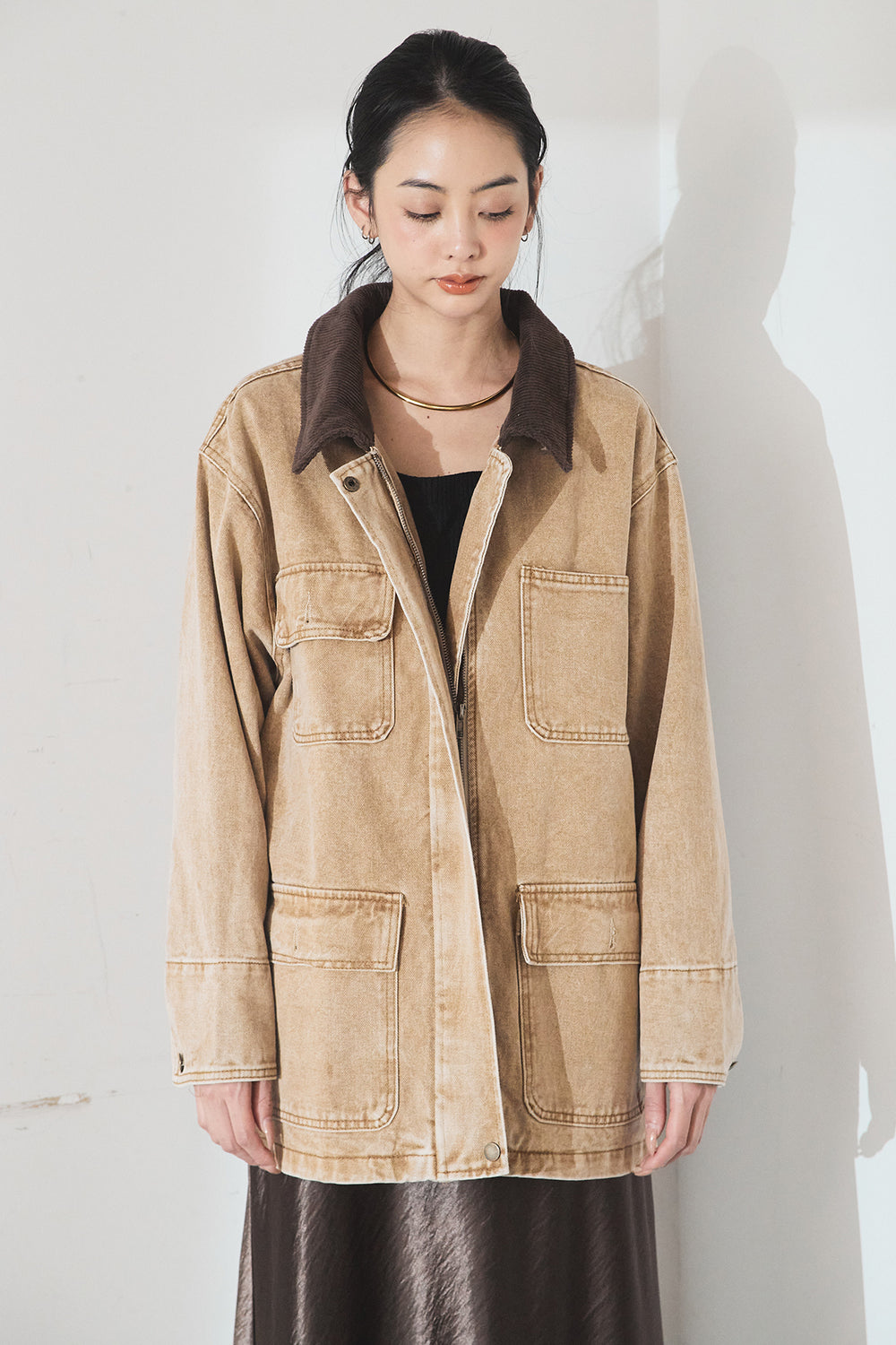 襟コーデュロイジップデニム調カバーオール