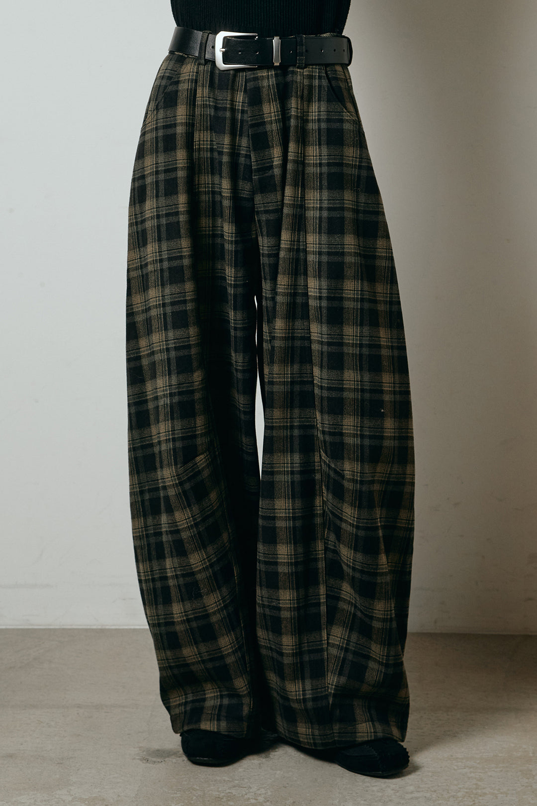 ベルト付きタータンチェックカーブワイドパンツ