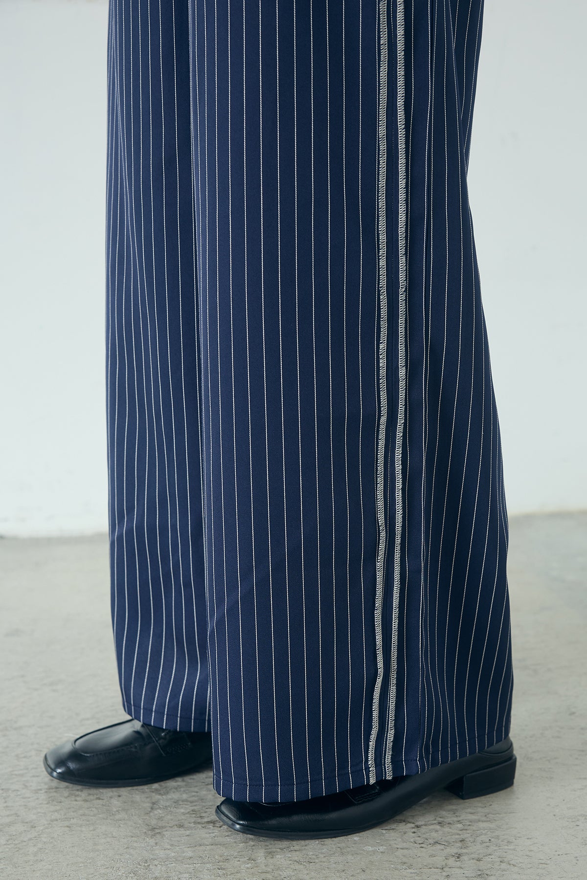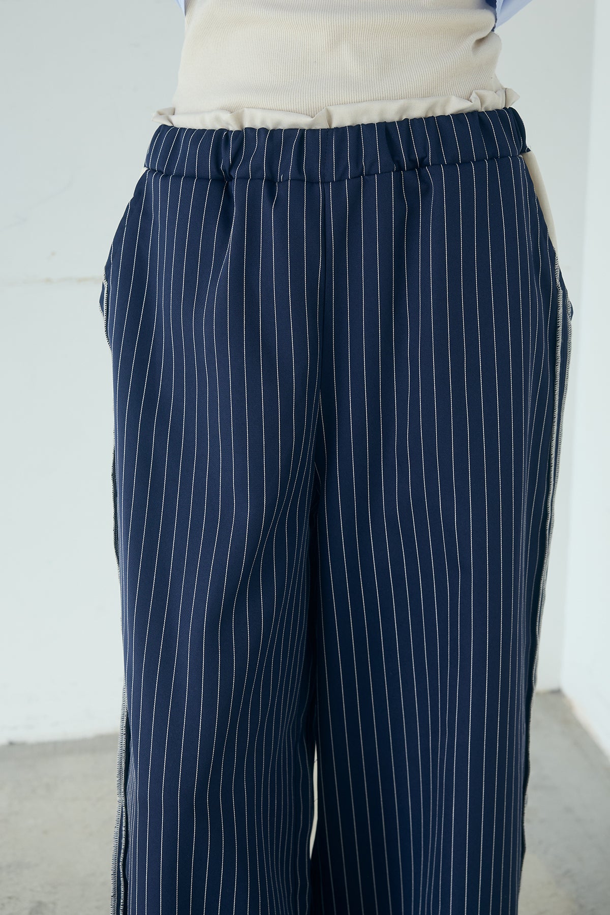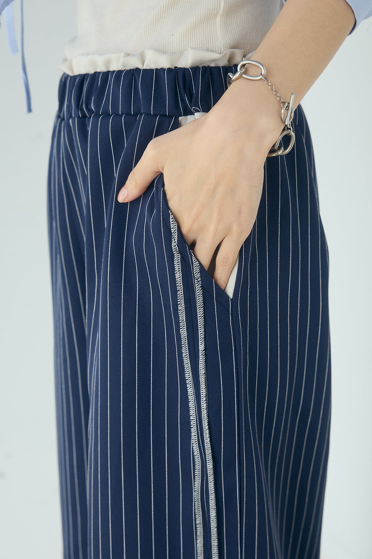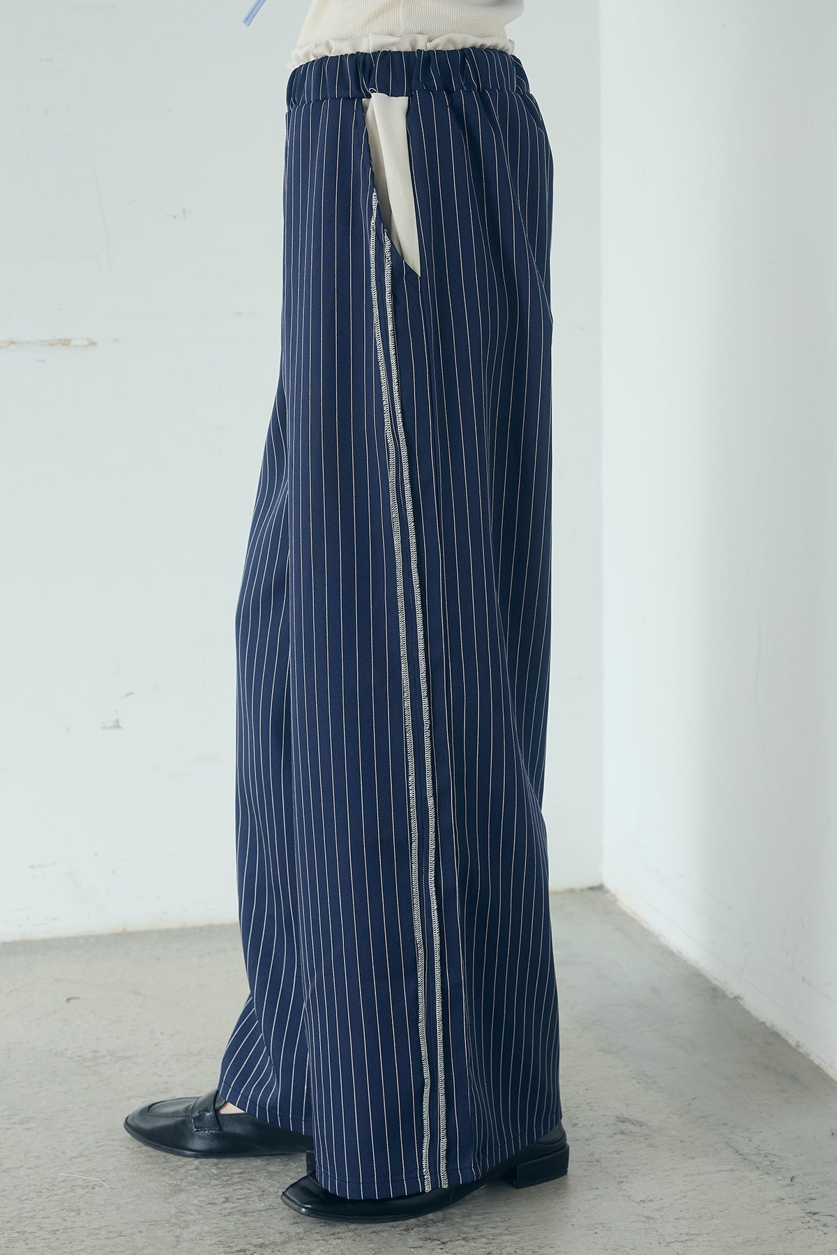 抜け感ときちんと感を両立した、大人のイージーパンツ。 ストライプ柄が縦のラインを引き立て、すっきりとした印象に仕上げてくれるトラックイージーパンツ。リラックスした穿き心地ながらも、スタイリング全体をスマートにまとめてくれる一本です。 ウエストはドローストリング仕様で調整しやすく、ストレスフリーな着用感を実現。程よくゆとりのあるストレートシルエットが自然な落ち感を生み、動きのある表情を楽しめます。 シャツやジャケットを合わせたきれいめな着こなしから、カットソーやスウェットとのラフなスタイルまで幅広く対応。日常使いはもちろん、旅行やリラックスシーンにも取り入れやすいアイテムです。