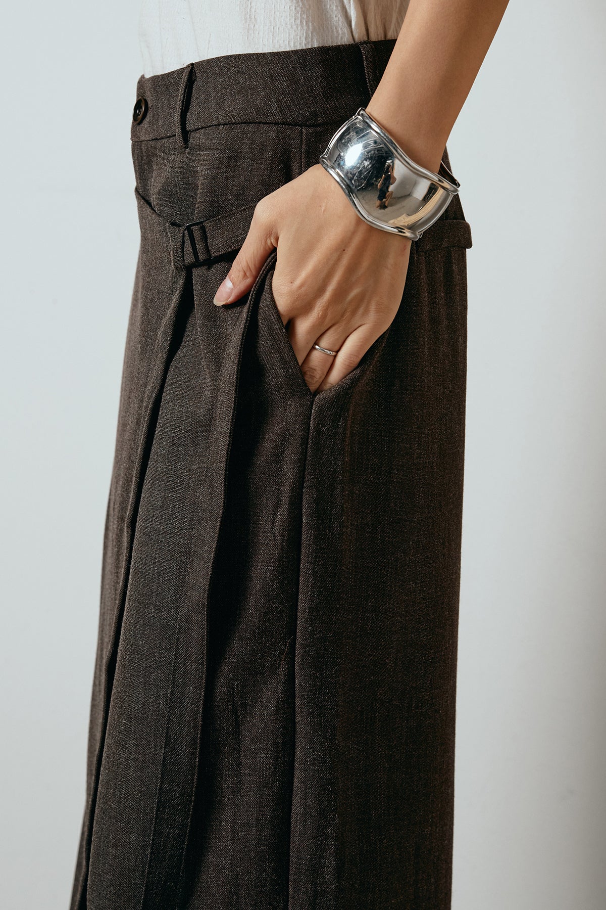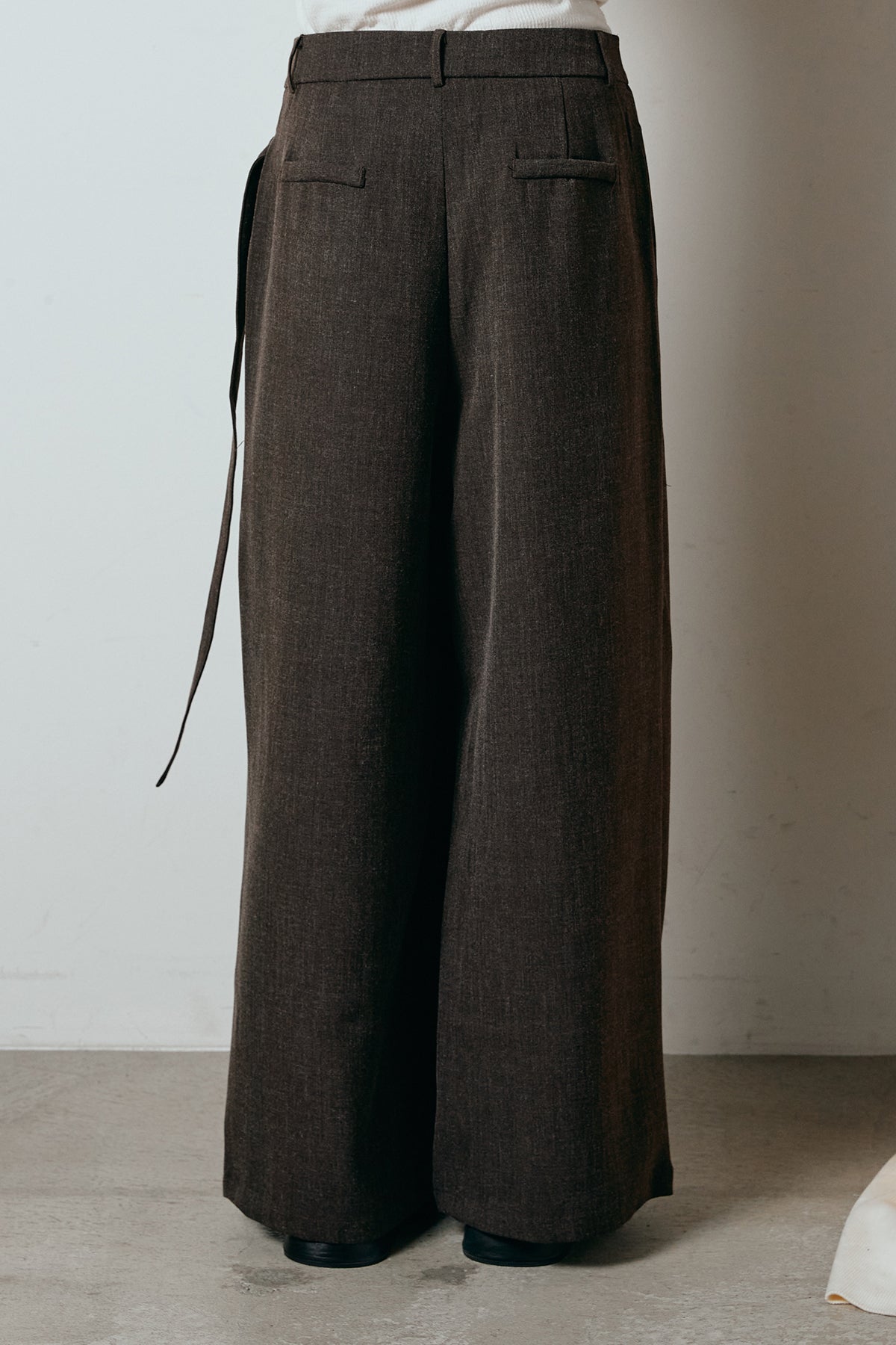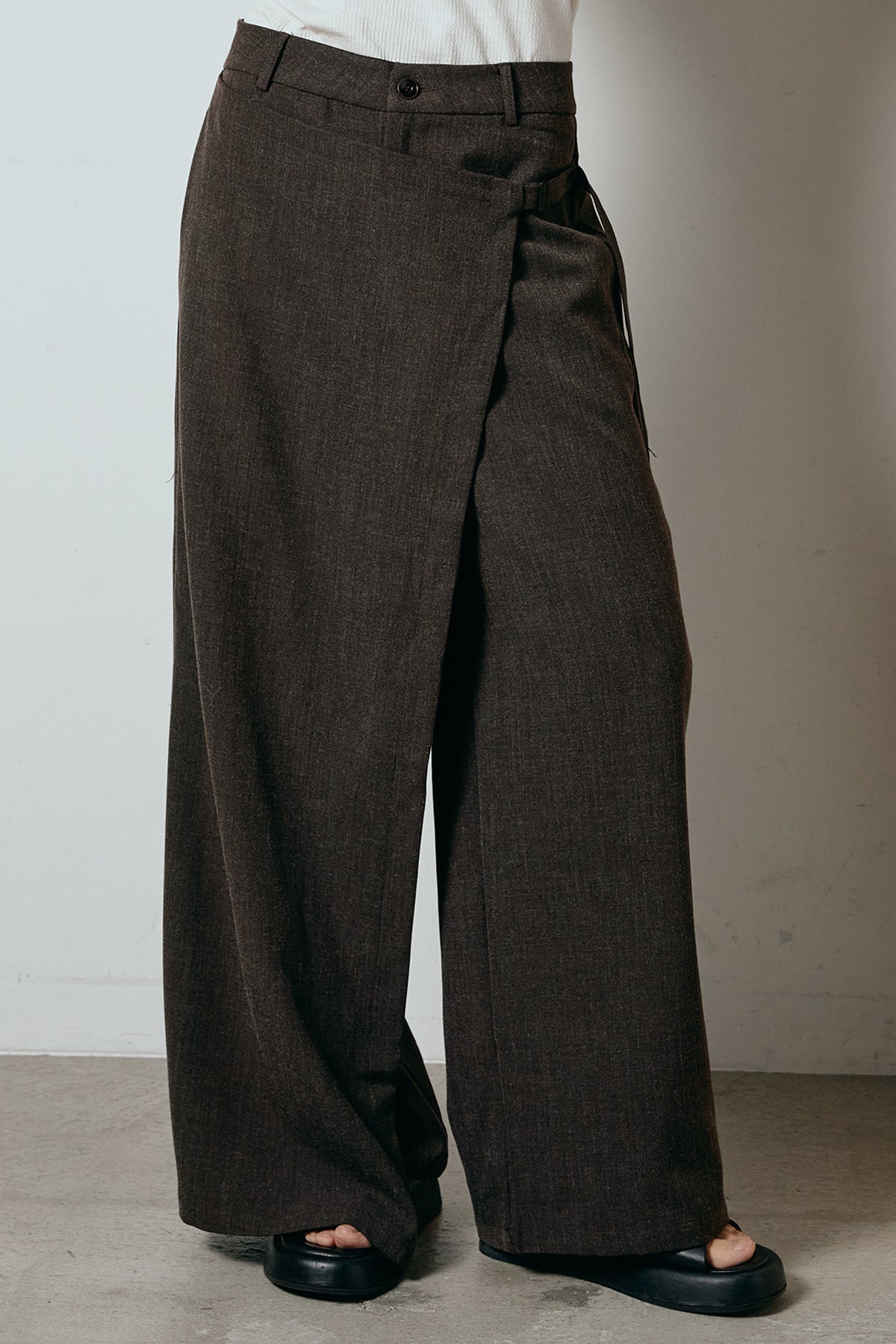 スカートのようなシルエットが新鮮なラップデザインのワイドスラックス。 フロントの重なりが上品な印象を与え、動くたびに揺れるドレープが洗練された雰囲気を漂わせます。 ウエストベルト付きで調整しやすく、タックインスタイルもすっきりと決まるデザイン。 ニットやシャツなど、さまざまなトップスと好相性のモードな一本です。