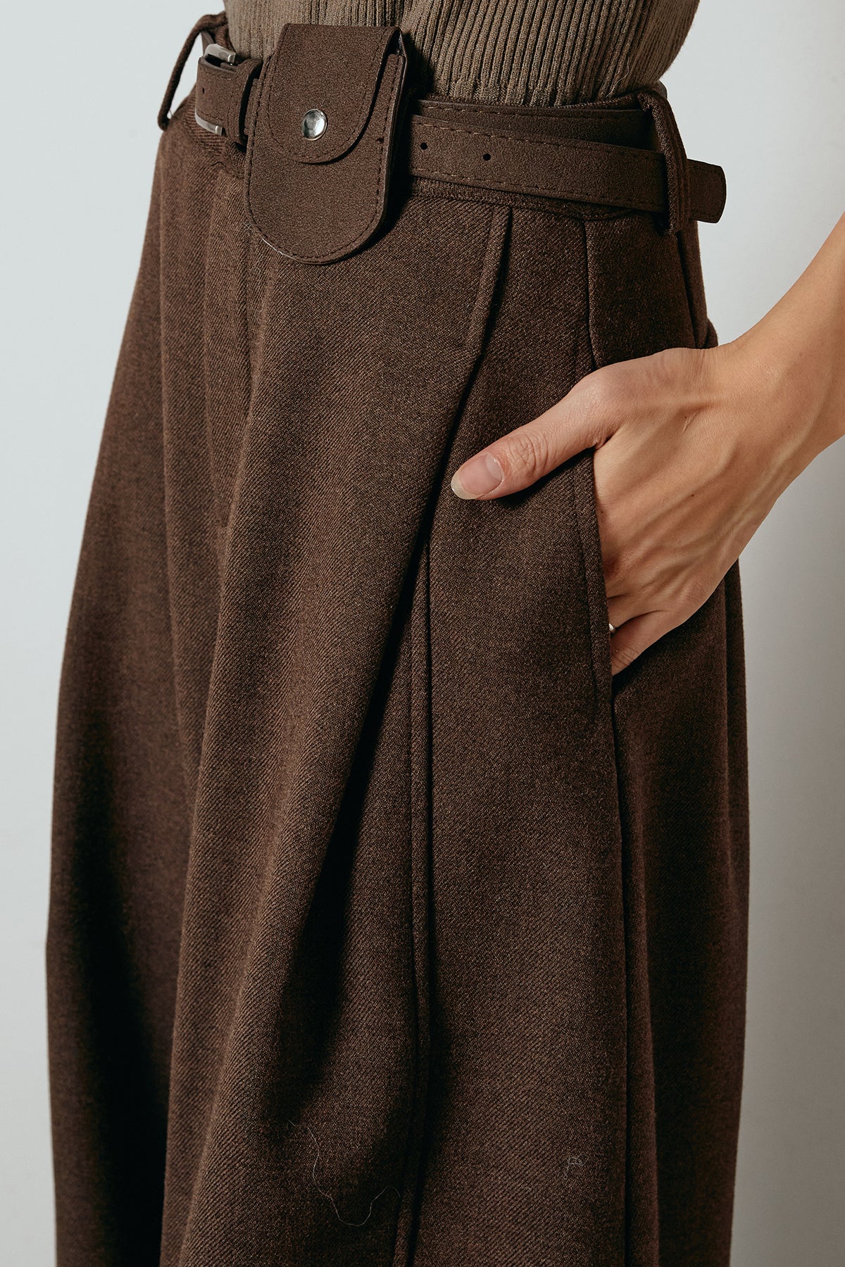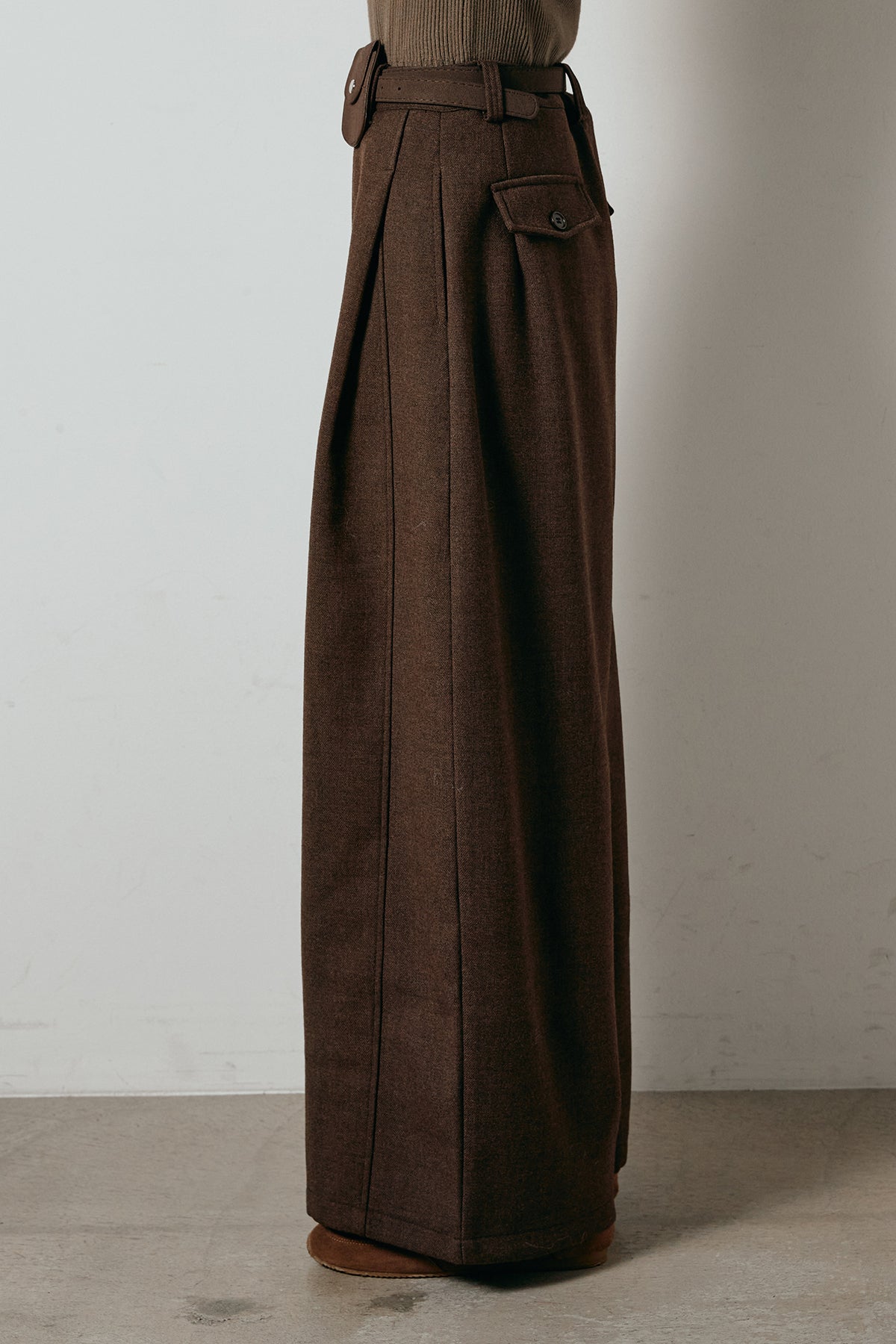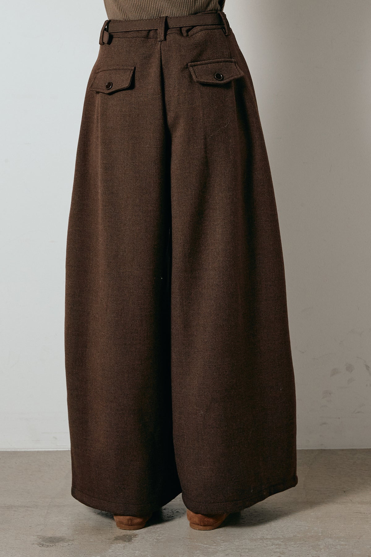 立体的なカーブシルエットが特徴のワイドパンツ。 ほどよいハリのある素材がラインをきれいに見せ、ゆったりとした穿き心地ながらもすっきりまとまる一本です。 ウエストには取り外し可能なポーチ付きベルトをセット。 アクセントとしても実用面でも便利で、コーデ全体にリズムをプラスしてくれます。 シンプルなトップスを合わせるだけでバランスよく決まり、デイリーに使いやすいアイテムです。